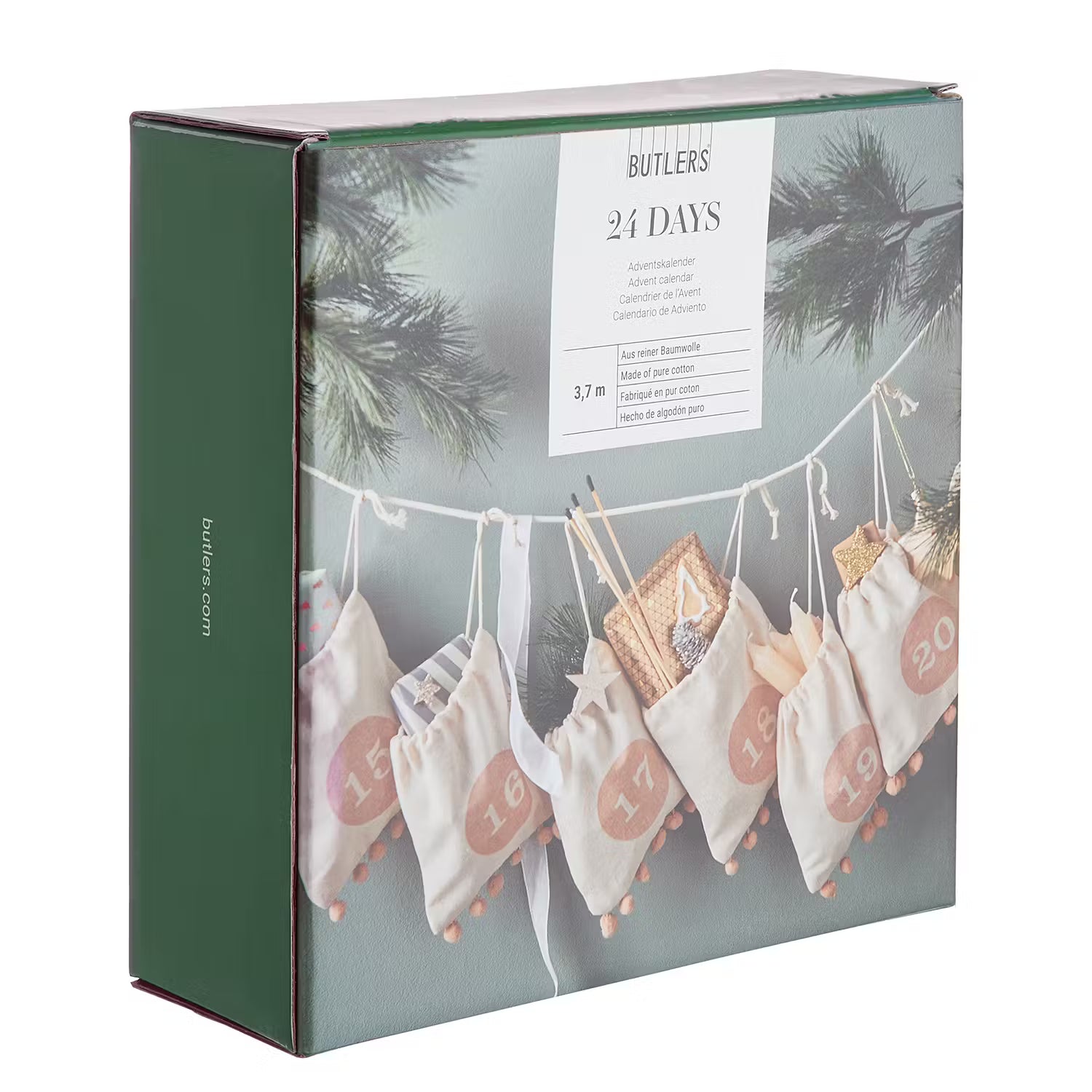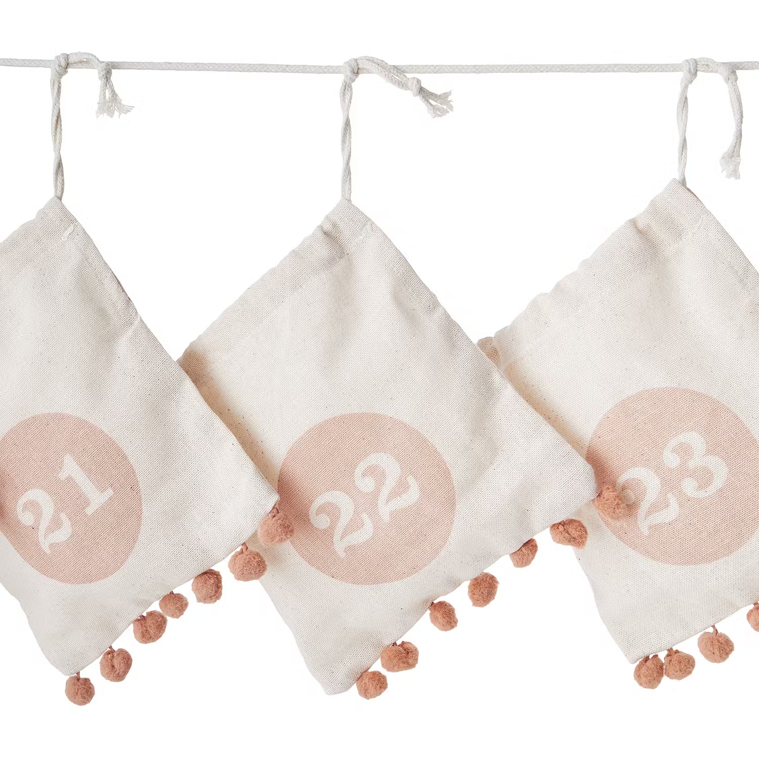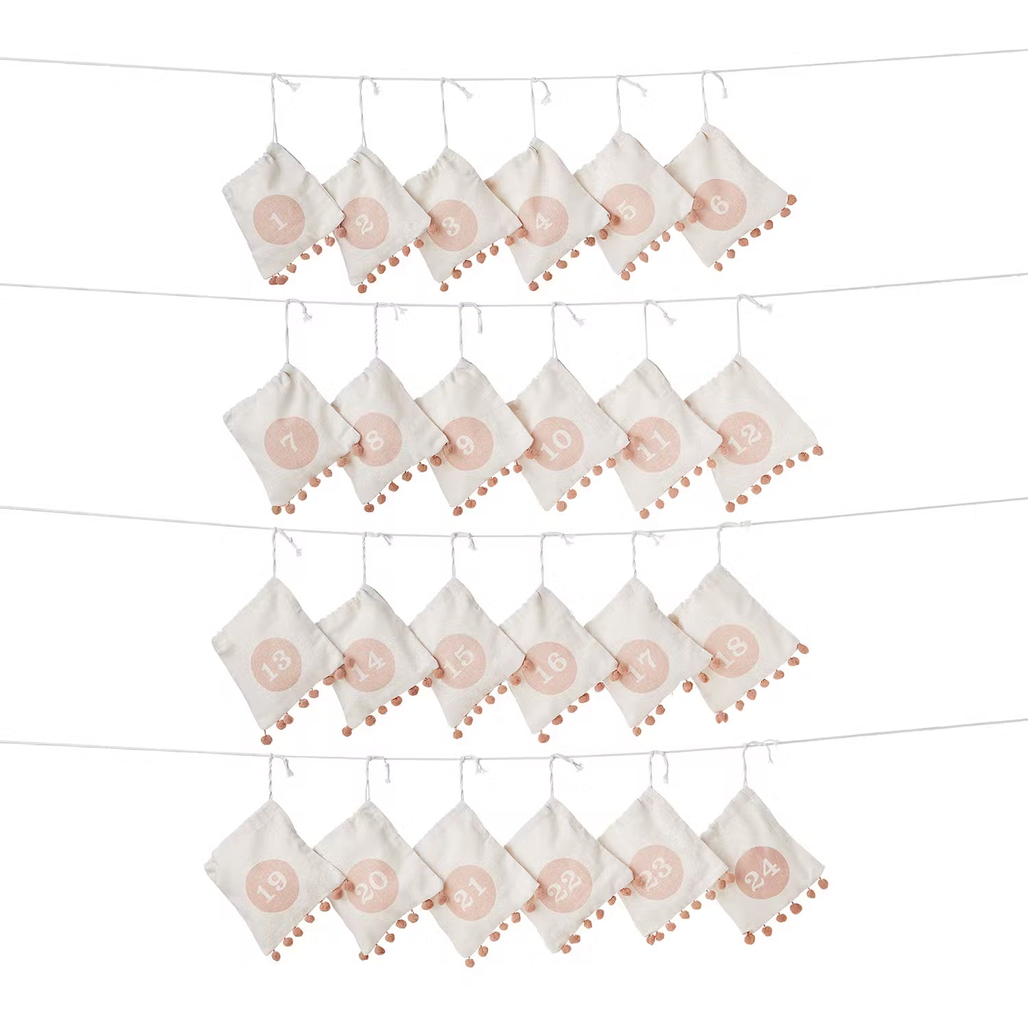 Ihr DIY Adventskalender steckt jedes Jahr voller Überraschungen, und mit dem 24 Day Adventskalender sieht man es ihm auf den ersten Blick an. 24 Beutel aus naturfarbener Baumwolle, verziert mit niedlichen kleinen Pompons, reihen sich dekorativ an einer Schnur auf - und sie alle warten nur darauf, jeden Dezembertag vor Weihnachten für glänzende Augen zu sorgen. Nachhaltigkeits-Tipp: Aufbewahren und in nächsten Winter wiederverwenden.