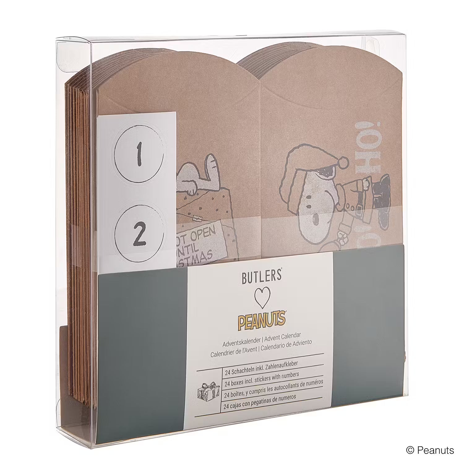 Reserviert für die liebsten Menschen in Ihrem Leben ist der Peanuts Adventskalender Snoopy mit 24 Geschenkboxen. Diese süßen Papierschachteln füllen Sie ganz DIY mit kleinen Überraschungen und versiegeln Sie mit den Zahlenaufklebern von 1 bis 24. Kein Tag ohne Peanuts und die Widersprüche des Lebens: Fast 70 Jahre lang begeisterte Charles M. Schulz seine Leser jeden Tag mit neuen Geschichten von Pechvogel Charlie Brown, seinem eigensinnigen Hund Snoopy und den anderen kleinen Charakterköpfen aus der Nachbarschaft. Jetzt tritt die ganze Bande wieder in Aktion - bei der exklusiven Peanuts-Serie von Butlers. Auf Geschirr, Tischwäsche, Küchenutensilien, Wohnaccessoires, Geschenktaschen, Notizbüchern, Flanell-Decke, Fußmatte und natürlich als Plüschtier lassen Sie Ihre Lieblingsfiguren bei sich zu Hause einziehen. Auch wenn Charlie Brown sich ständig beschwert "Keiner mag mich" und Lucy van Pelt entsetzt feststellt "Der Hund hat mich geküsst!"