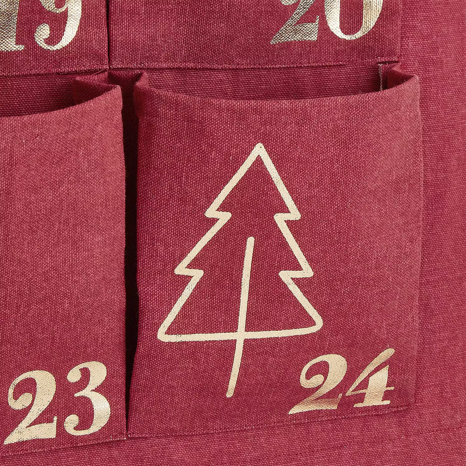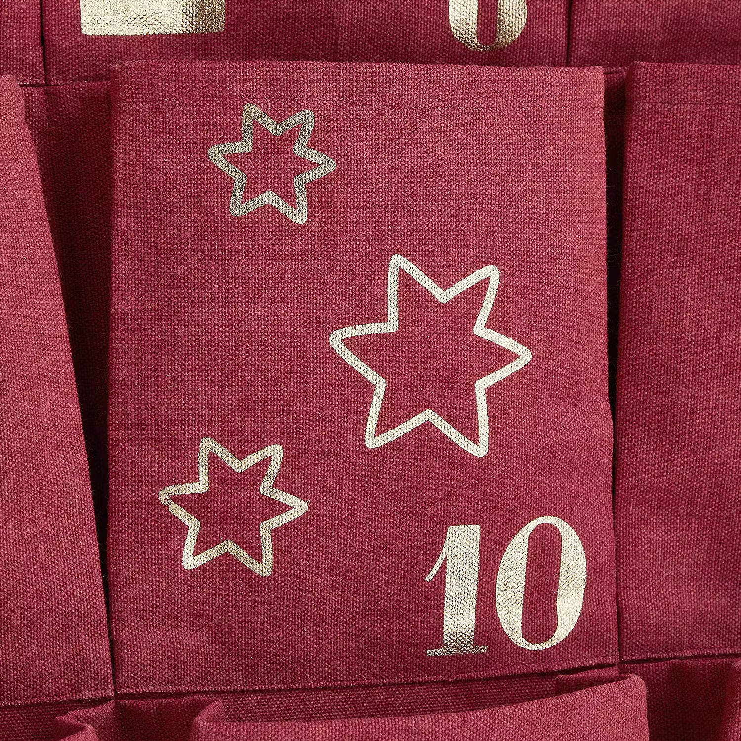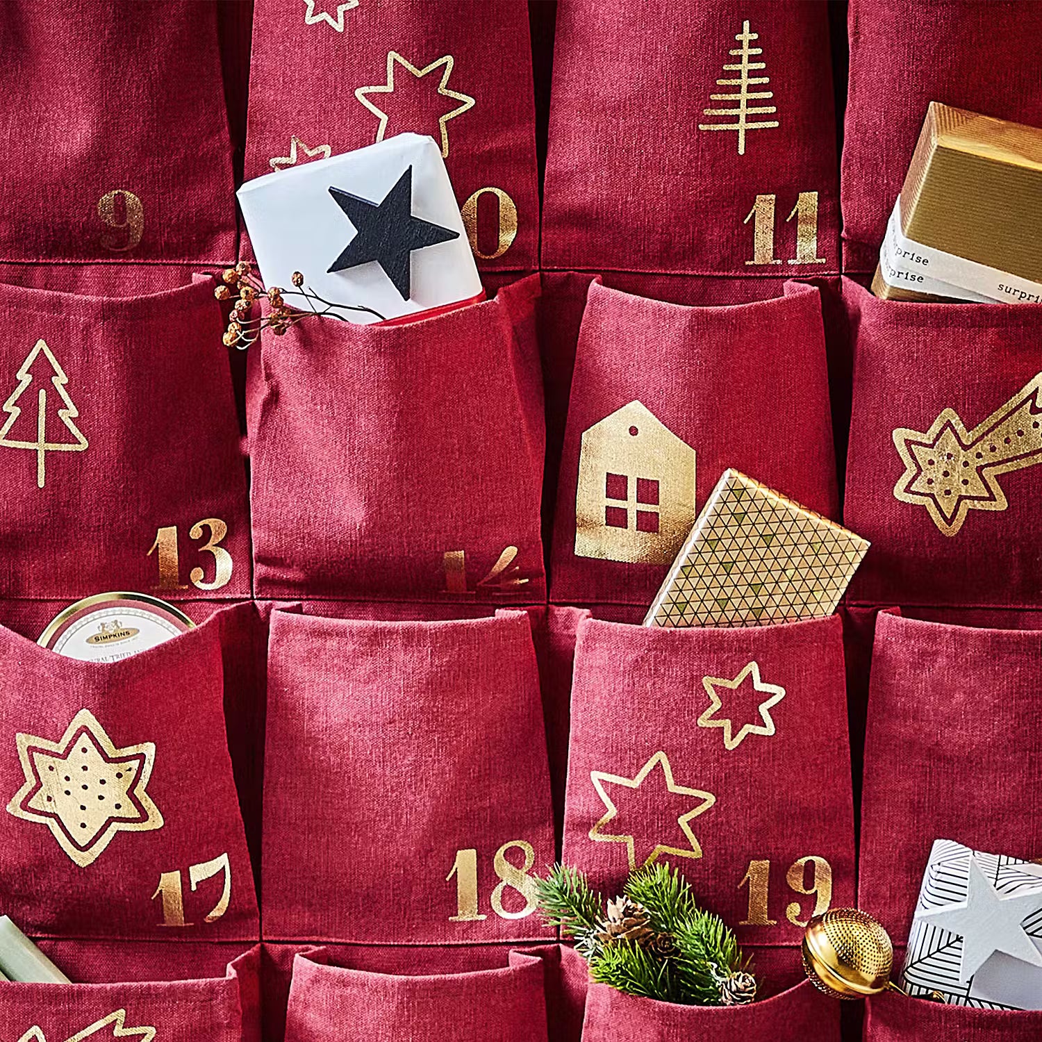 In Sachen Verpackung ist Umdenken angesagt, und da bietet sich der Santa is Coming Adventskalender mit Tassel in Rot-Gold dekorativ an: Alle Jahren wieder lassen sich in seinen Taschen kleine Überraschungen verstecken, z. B. DIY-Geschenke oder andere mit Liebe ausgesuchte Nettigkeiten. Aus Baumwolle, zum Aufhängen.