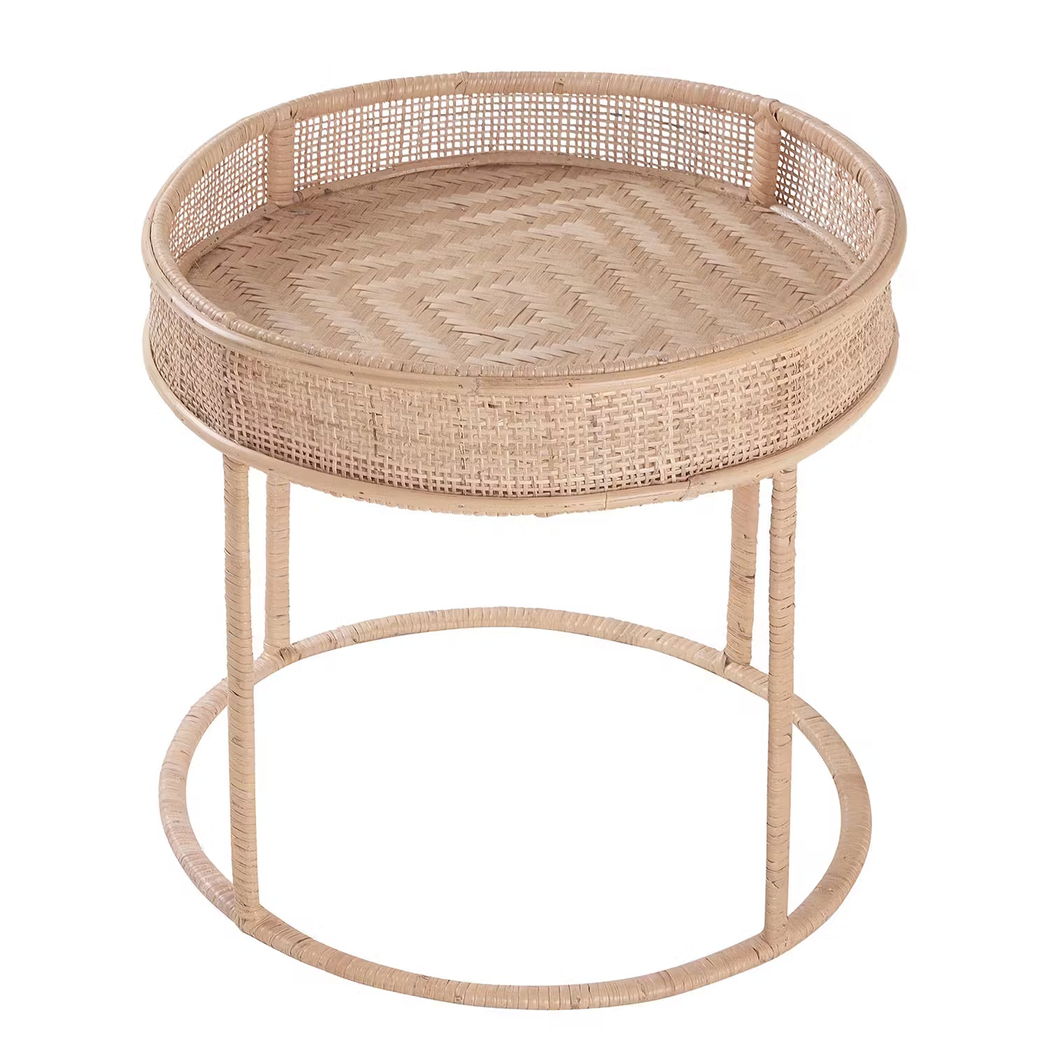 Der Beistelltisch Boho Lounge kombiniert charmant Rattan und einen unsichtbaren Eisenrahmen. Das beige Rattangeflecht verleiht ihm eine warme, natürliche Ausstrahlung, während der Eisenrahmen Stabilität bietet.