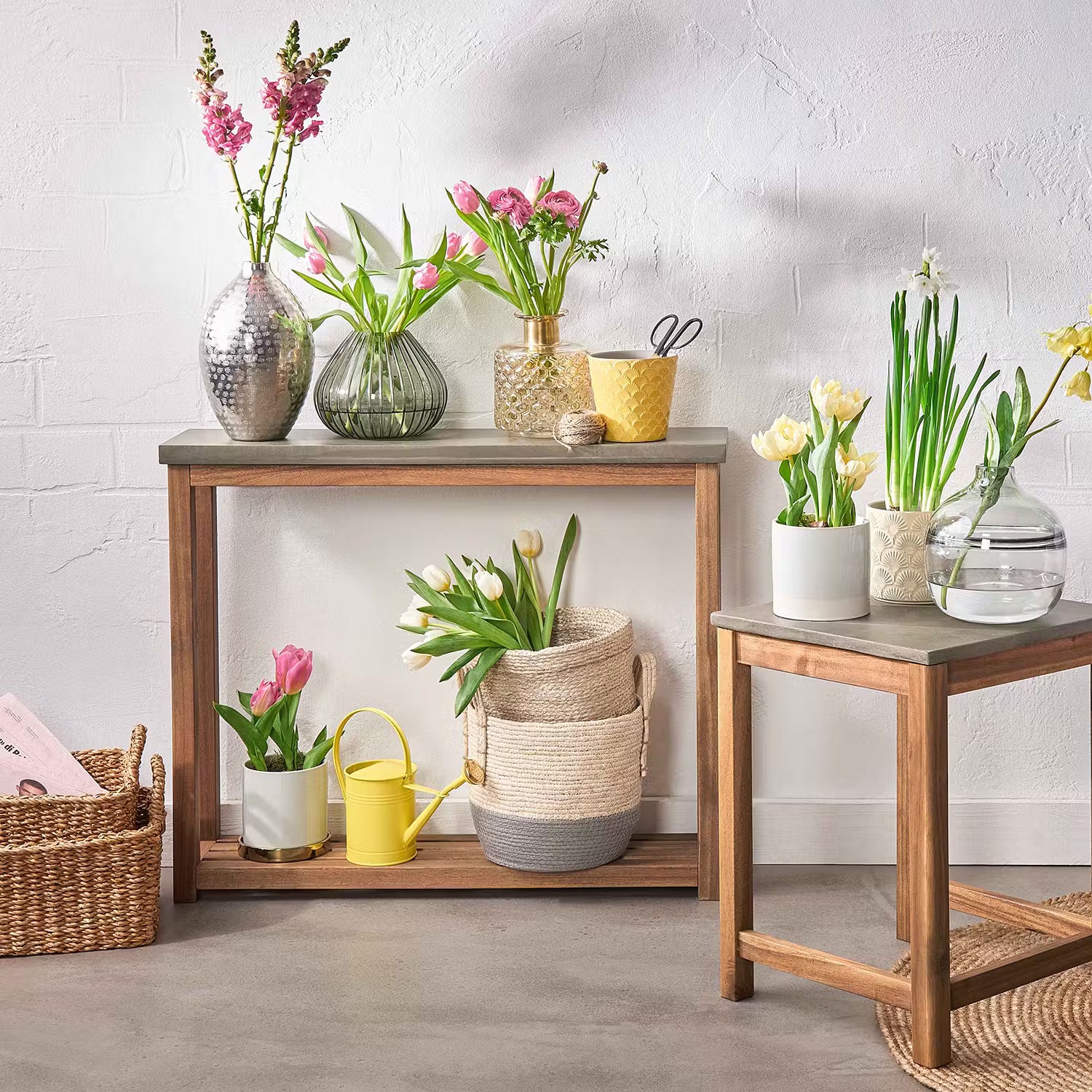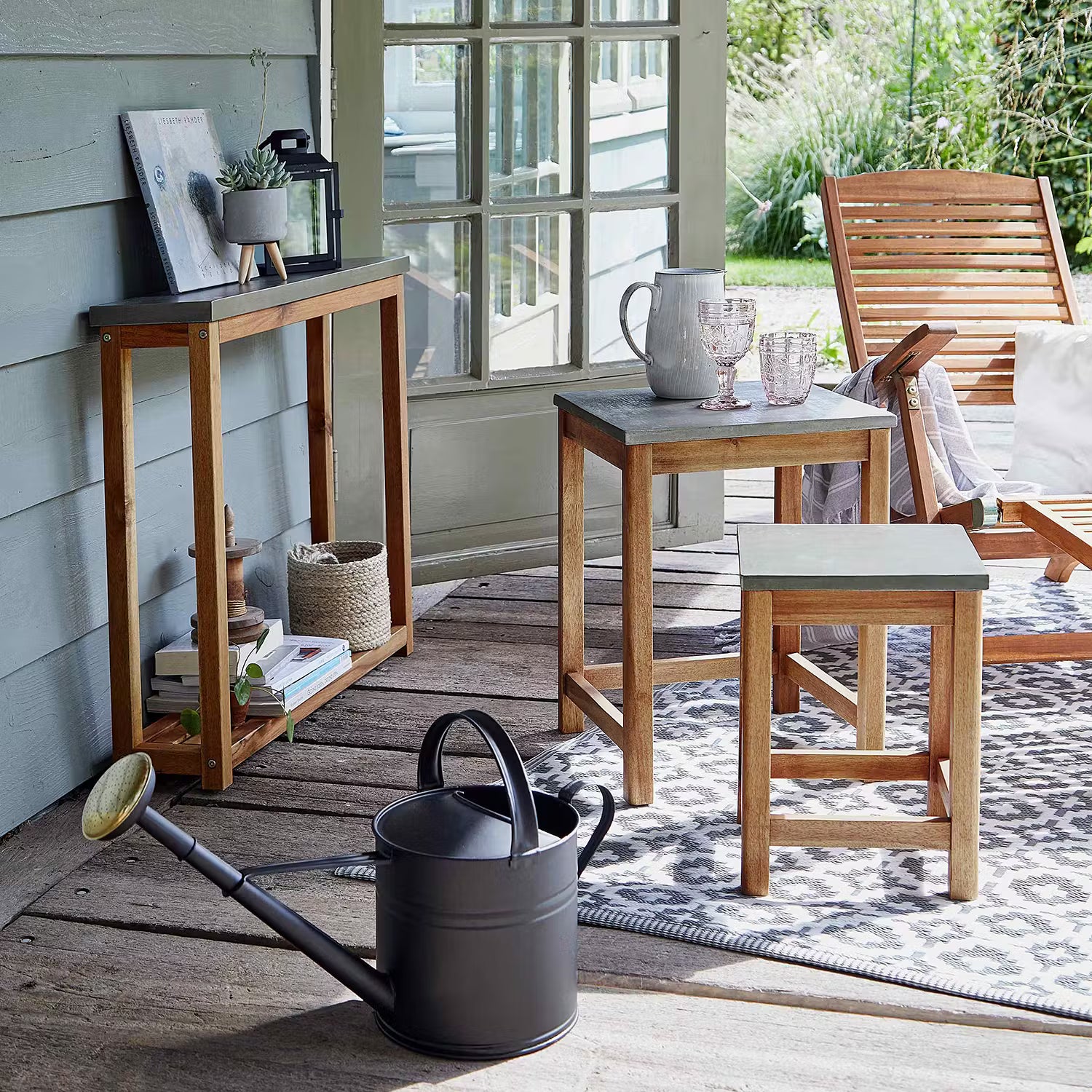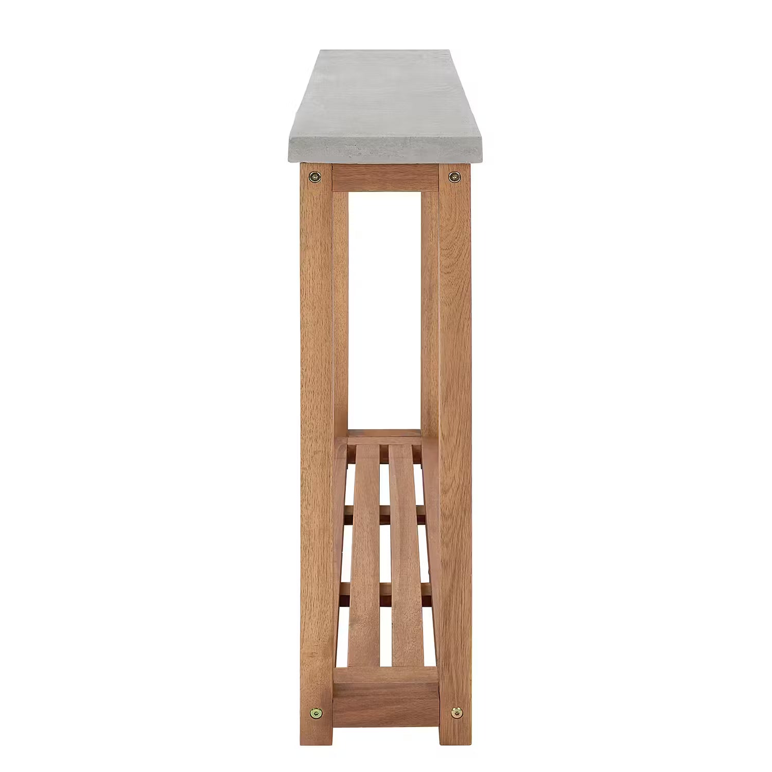 Die schmalen Maße machen ihn zu einer praktischen Lösung für kleine Außenbereiche, ohne den Raum optisch zu überladen. Der Kontrast zwischen dem geölten Akazienholz und der glatten Betonplatte schafft eine ansprechende Balance zwischen rustikal und modern.
