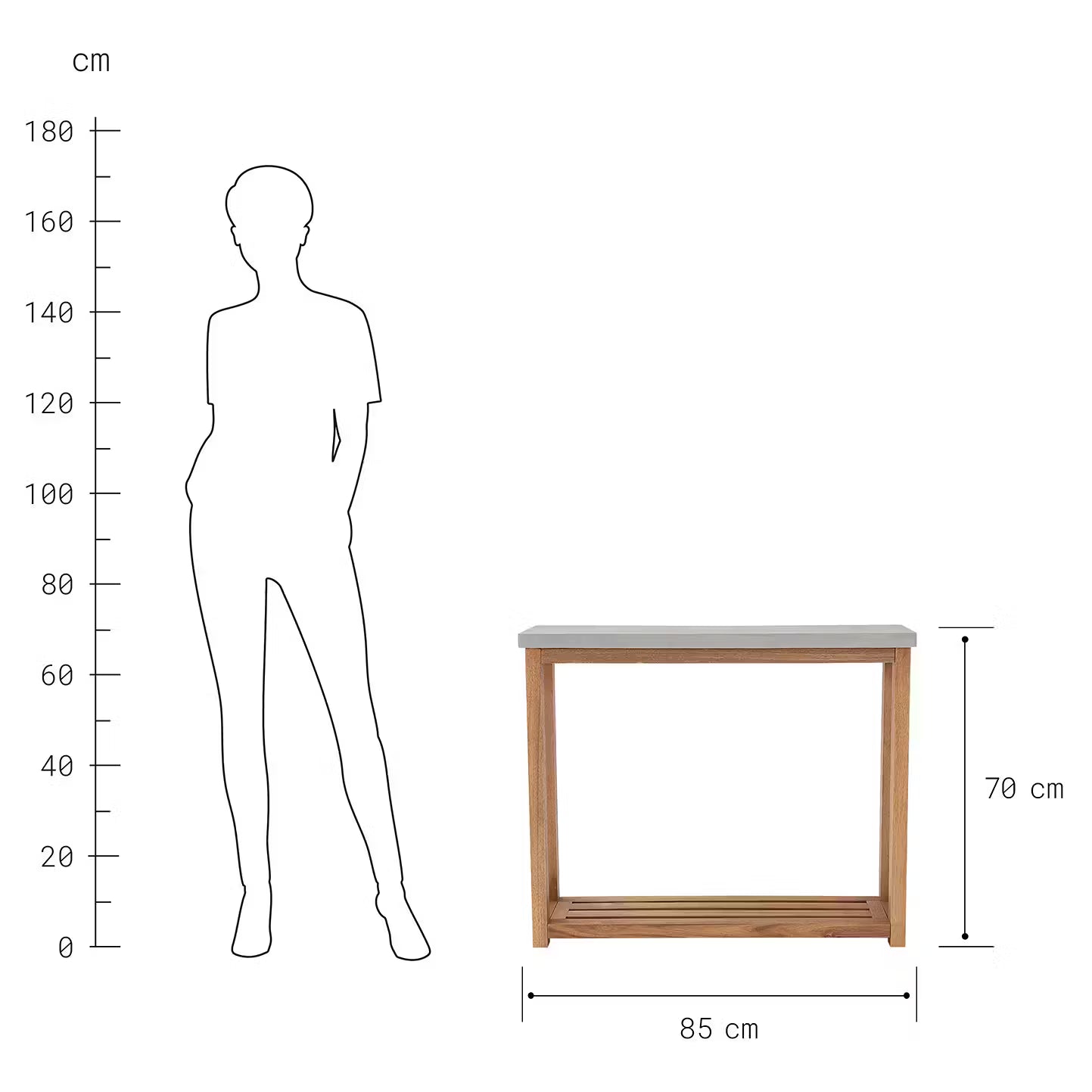 Der Beistelltisch Concrete hat eine Breite von 85 cm, eine Höhe von 70 cm und eine Tiefe von 20 cm. Mit diesen kompakten Abmessungen eignet er sich hervorragend für schmale Außenbereiche wie Balkone oder kleine Terrassen, wo platzsparende Lösungen gefragt sind. Die Tischunterkante befindet sich auf einer Höhe von 68 cm, was für ausreichend Beinfreiheit sorgt.