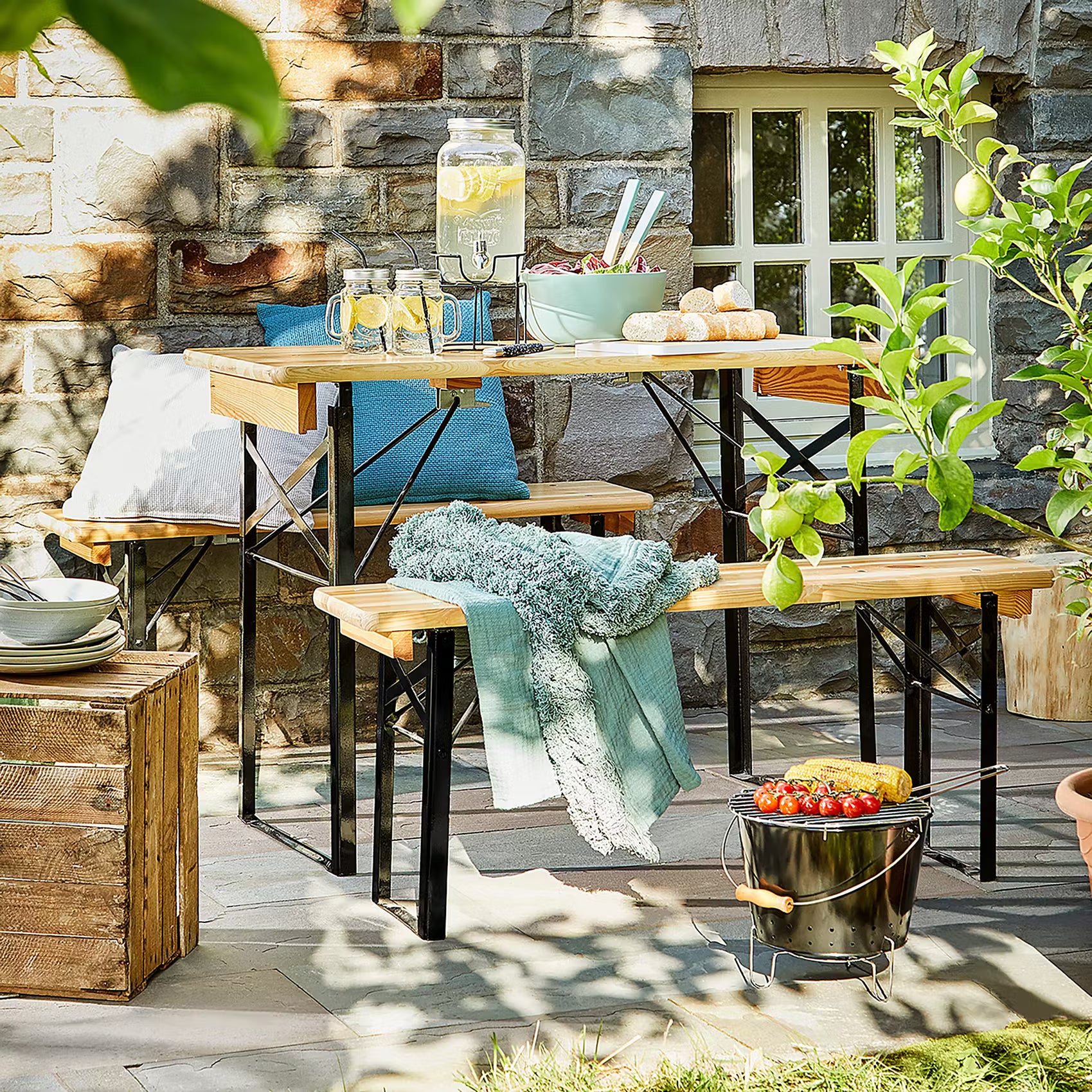 Mit dem kompakten 3-teiligen Good Company Bierbank-Set, bestehend aus einem faltbaren Tisch und zwei faltbaren Bänken, sind Sie auf Balkon oder Terrasse, im Garten oder Grünen in bester Gesellschaft - zum Beispiel beim Grillen, Feiern oder Picknicken. Für den Ausflug oder das Essen im Freien sind alle Teile nicht nur schnell und einfach aufgebaut, sondern auch anschließend im Handumdrehen platzsparend verstaut - bis sie das nächste Mal zum Einsatz kommen.