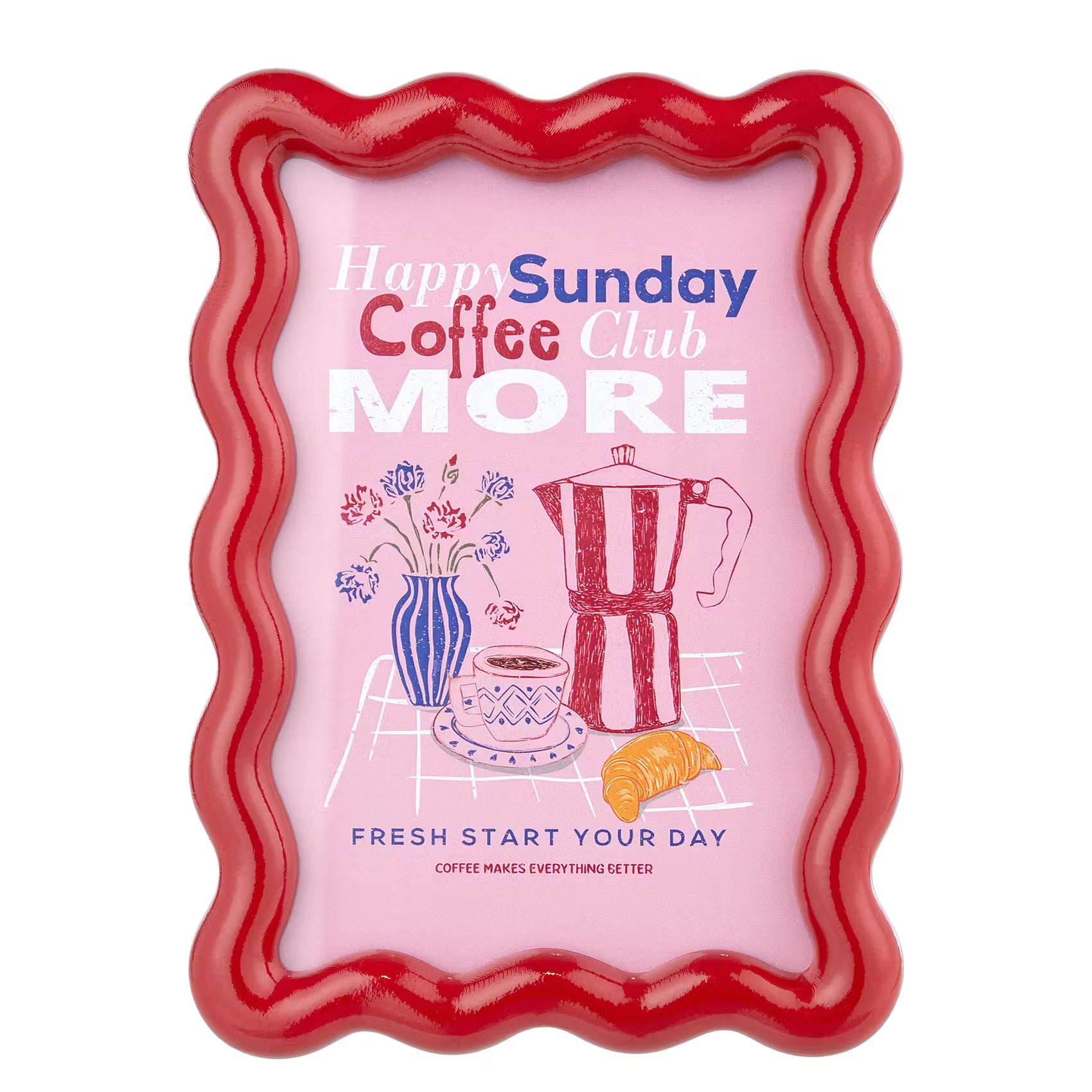Schnappschüsse und Lieblingsfotos gut gelaunt in Szene setzen: Das gelingt dem Happy Walls Bilderrahmen mit gewelltem, farbigen Rand. Dieser Bilderrahmen mit Kunststoffrahmen und Glasscheibe ist geeignet für die Bildergröße 10 x 15 cm und bietet eine Vorrichtung zum Aufstellen, so dass du ihn z.B. auch auf dem gedeckten Tisch als kleine Menükarte verwenden kannst. Erhältlich in Rot und Rosa.