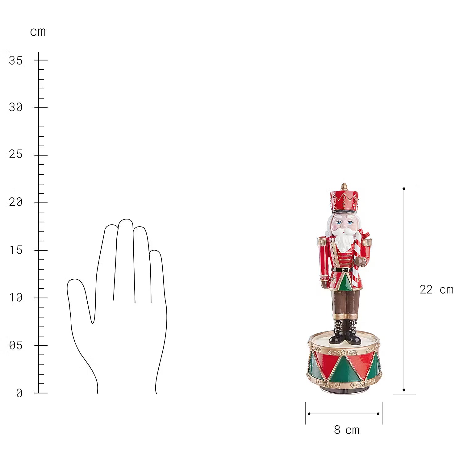 Der klassische Nussknacker hat einen neuen Job gefunden und präsentiert sich jetzt als hübsche X-Mas Spieluhr Nussknacker rundum von seiner besten Seite. Die hübsche, liebevoll ausgearbeitete Dekofigur dreht sich zur Melodie von Nutcracker Suite. Mit 22 cm Höhe ist die Spieluhr dabei so kompakt, dass Sie z.B. auch auf dem Schreibtisch oder auf dem gedeckten Tisch wohlklingend für weihnachtliche Stimmung sorgt.