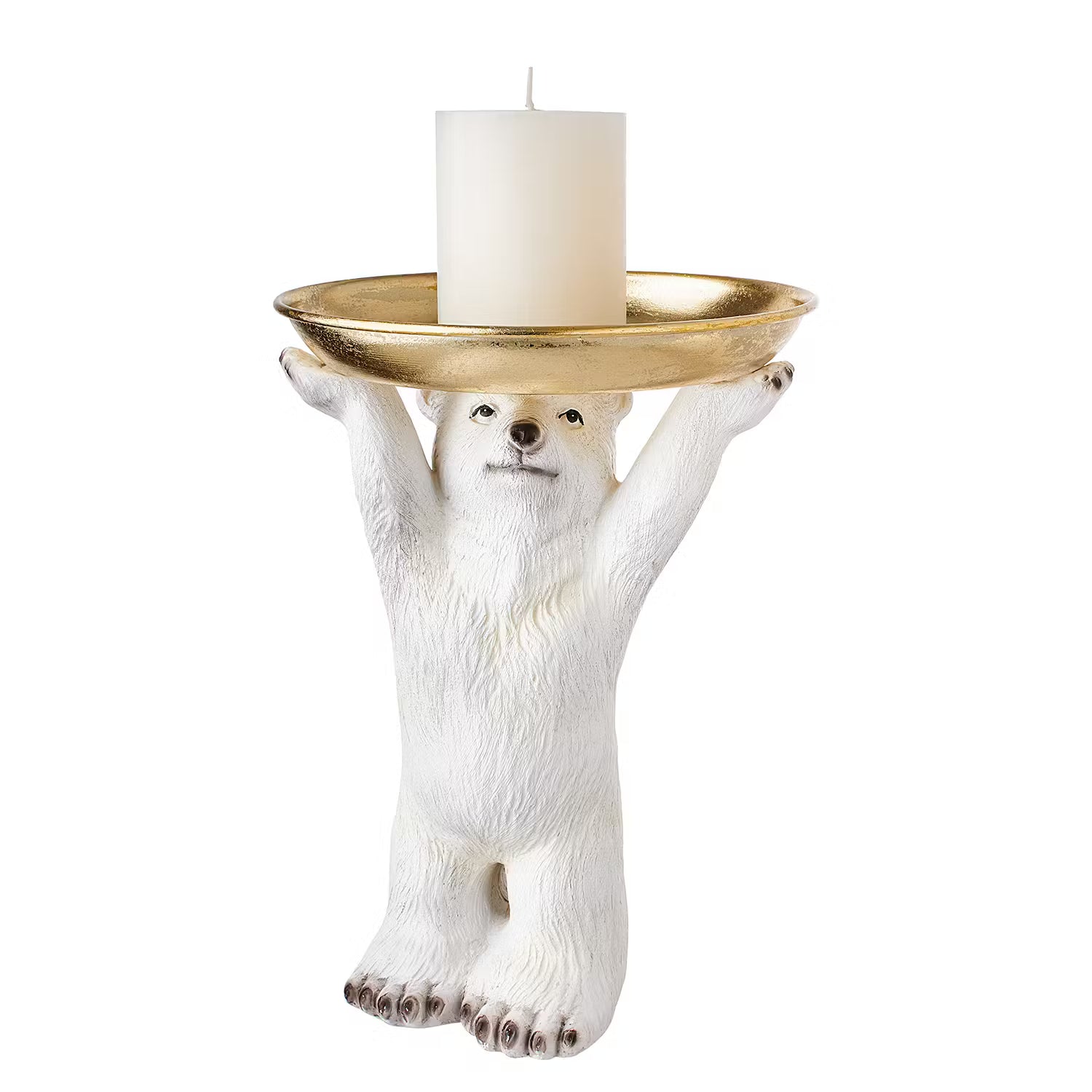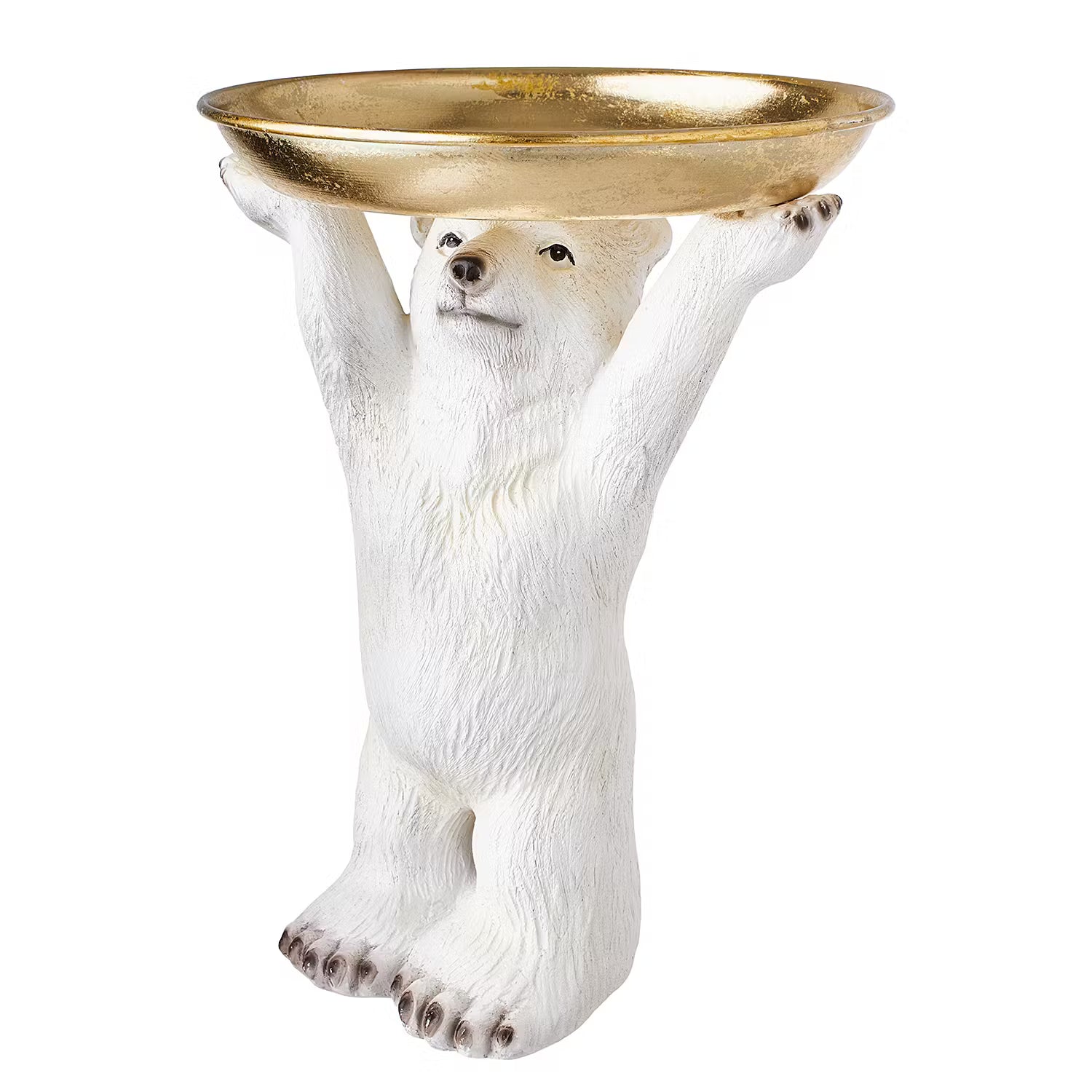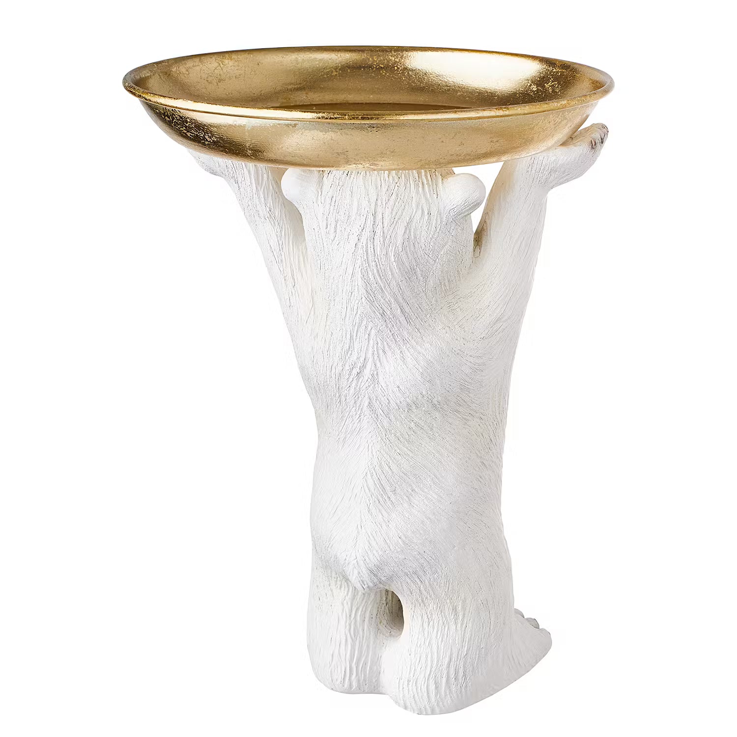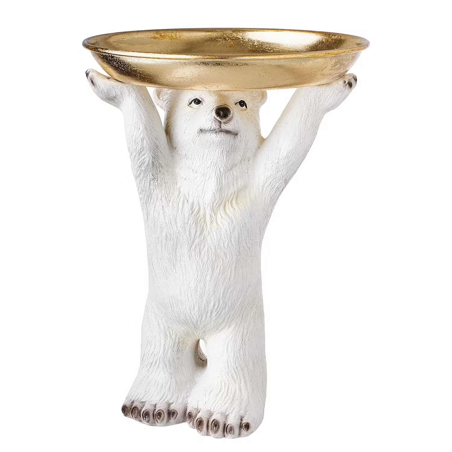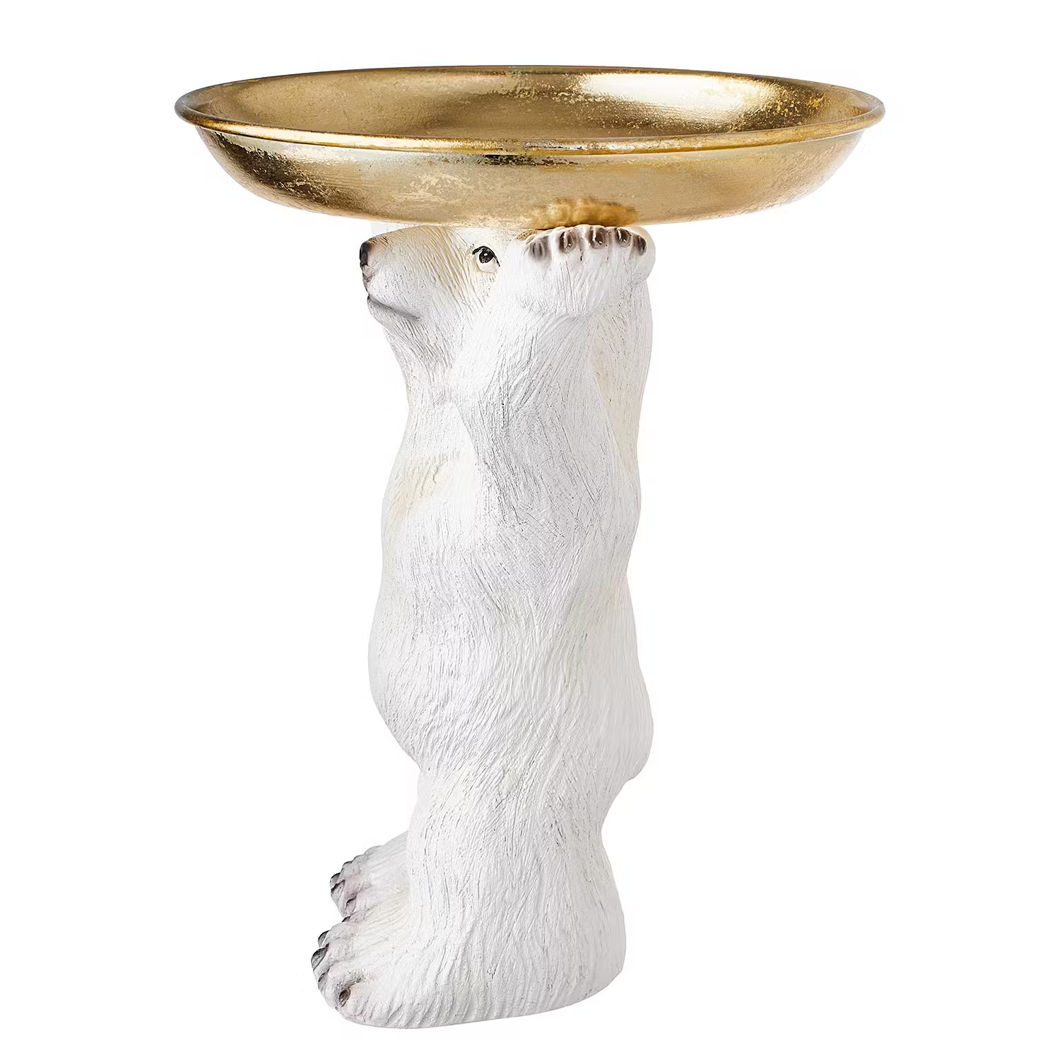 Ein bärenstarker Hingucker für dein Zuhause ist die originelle Oswald Deko Statue Eisbär mit Teller. Eine liebevoll gestaltete Eisbär-Figur trägt hier einen goldfarbenen Teller, auf dem du z.B. Schmuck ablegen kannst oder ein kleines dekoratives Objekt platzierst. So kannst du die Deko Statue auch in deine winterliche Tischdeko integrieren.