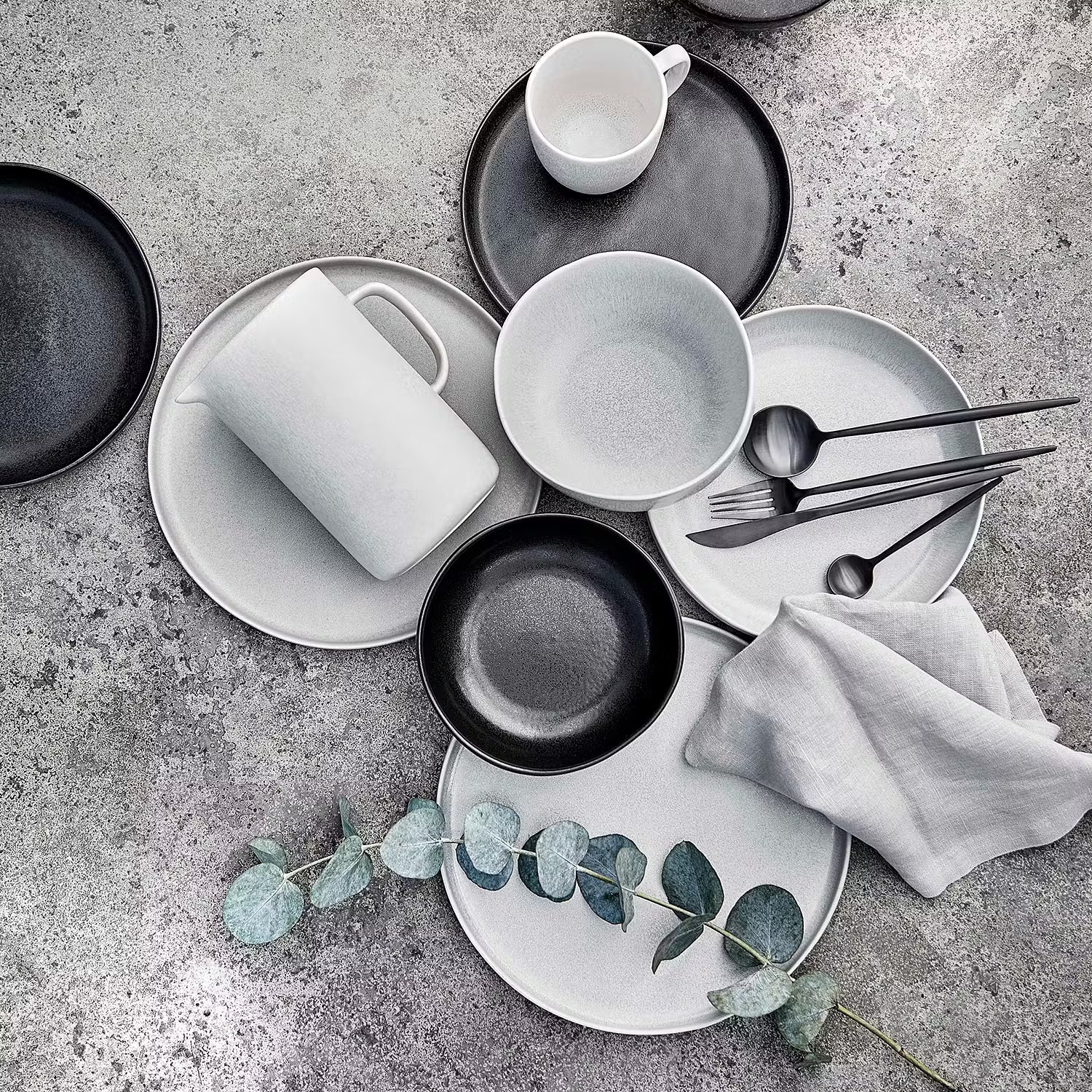 Hier bringt minimalistisches Design die Qualität wirkungsvoll zur Geltung: Das 12-teilige Casa Nova Dinner-Set aus Steinzeug wurde liebevoll in Portugal gefertigt. Der Manufaktur-Look zeigt sich im Unikat-Charakter der reaktiven Glasur und leicht unperfekten, organischen Form. Das skandinavische Design und der robuste Look machen die Casa Nova Geschirrserie zu einem zeitlosen Alltagsgeschirr mit natürlichem Touch. Das Geschirr zeichnet sich durch die besondere reaktive Glasur mit effektvollem Farbverlauf aus - verfügbar in den Farben Grau und Schwarz.