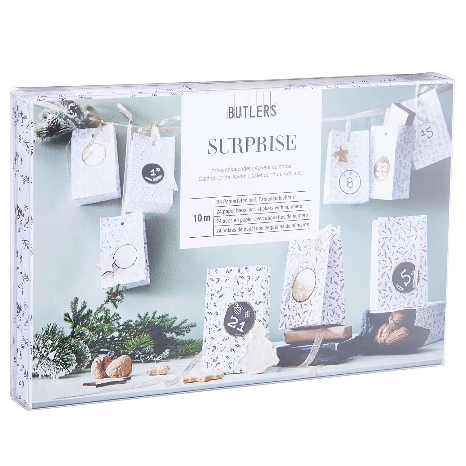 Bei dem Surprise Adventskalender DIY-Set in Schwarz-Weiß kommt Ihnen 24 Mal ein kleines Geschenk in die Papiertüte - und 24 Mal ein Sticker drauf. Und wenn Sie dann noch Lust zum Schmücken und Dekorieren haben, hängen Sie Ihren selbstgemachten Adventskalender mit den Bändern auf. Weitere Varianten erhältlich.