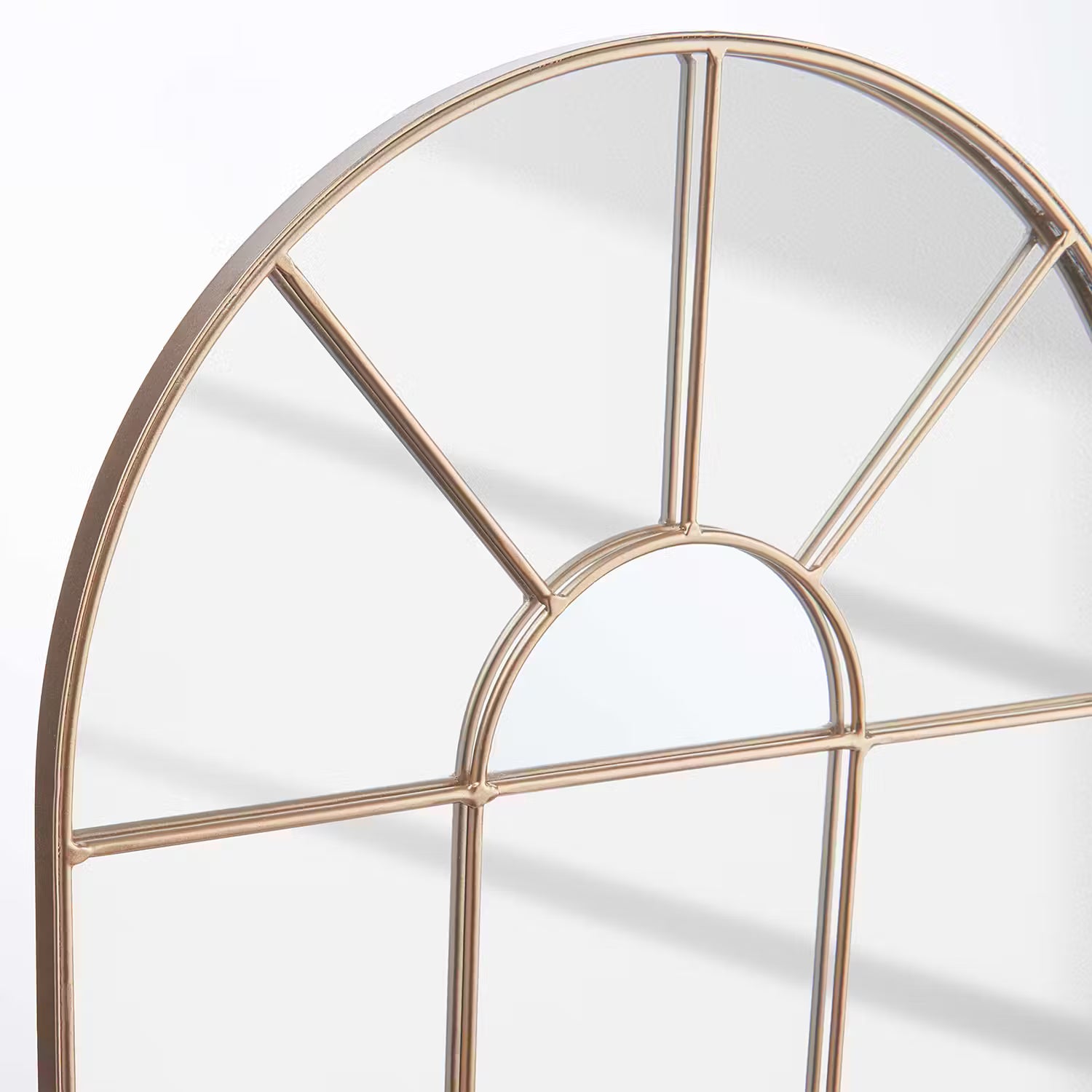 Der Finestra-Spiegel besteht aus robustem Eisen und hochwertigem Glas. Der goldfarbene Eisenrahmen ist stabil und langlebig, während das klare Glas für eine brillante Spiegelung sorgt.