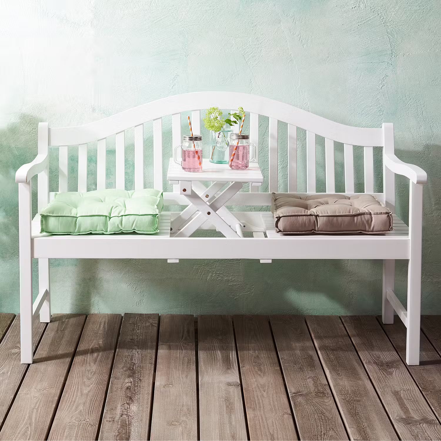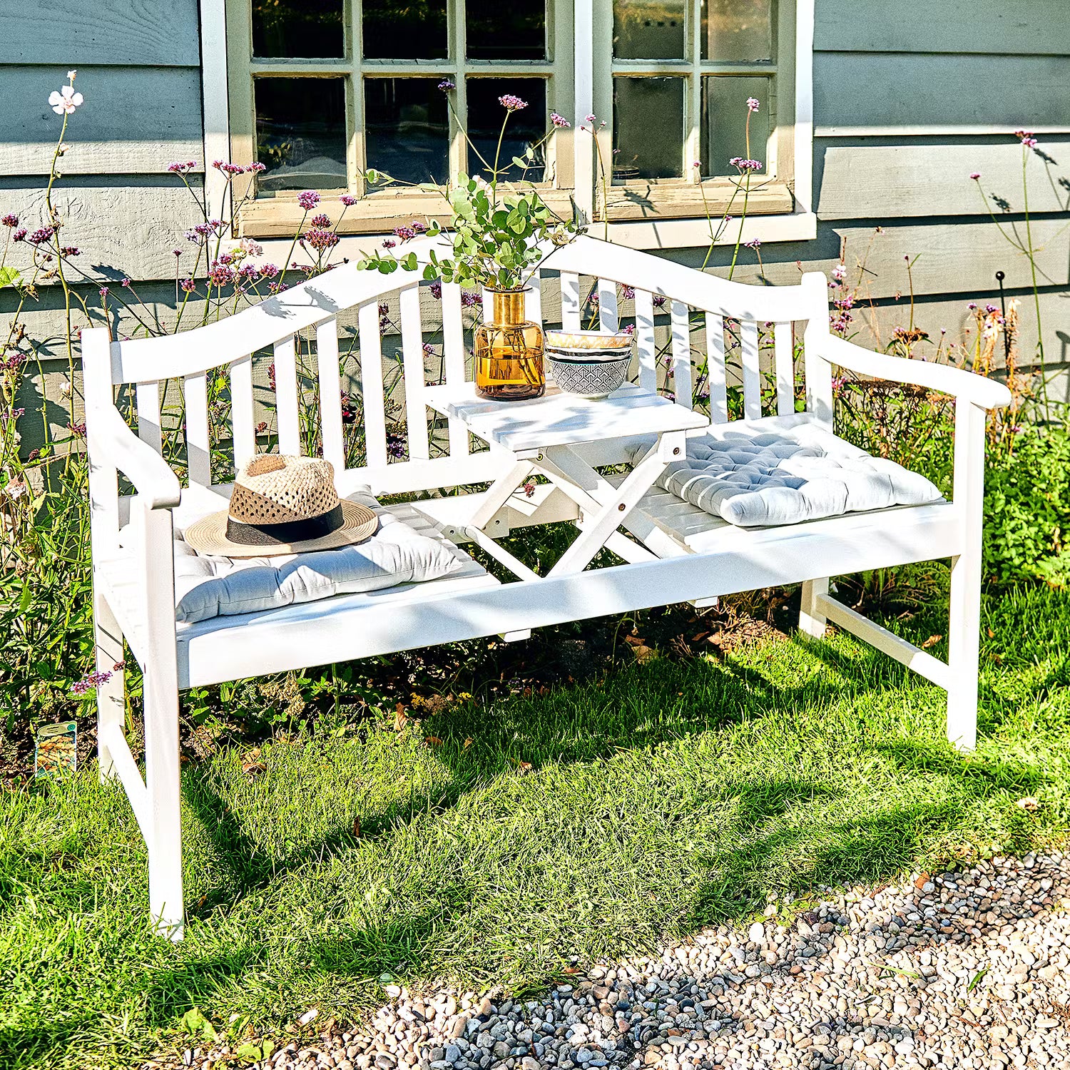Zu Zweit draußen auf der Holz-Bank sitzen, auf dem ausklappbaren Tisch in der Mitte wahlweise die morgendliche Kaffeetasse oder das abendliche Rotweinglas abstellen und der Sonne beim Auf- oder Untergehen zuschauen: Mit der Banquette-Gartenbank aus Akazienholz genießen Sie das Nebeneinander und den gemeinsamen Blick auf die Welt. Klassische Form mit geschwungener Rückenlehne, mit eingeklapptem Tisch für 3 Personen geeignet. Tipp: Mit Kissen und Polstern individuell dekorieren.