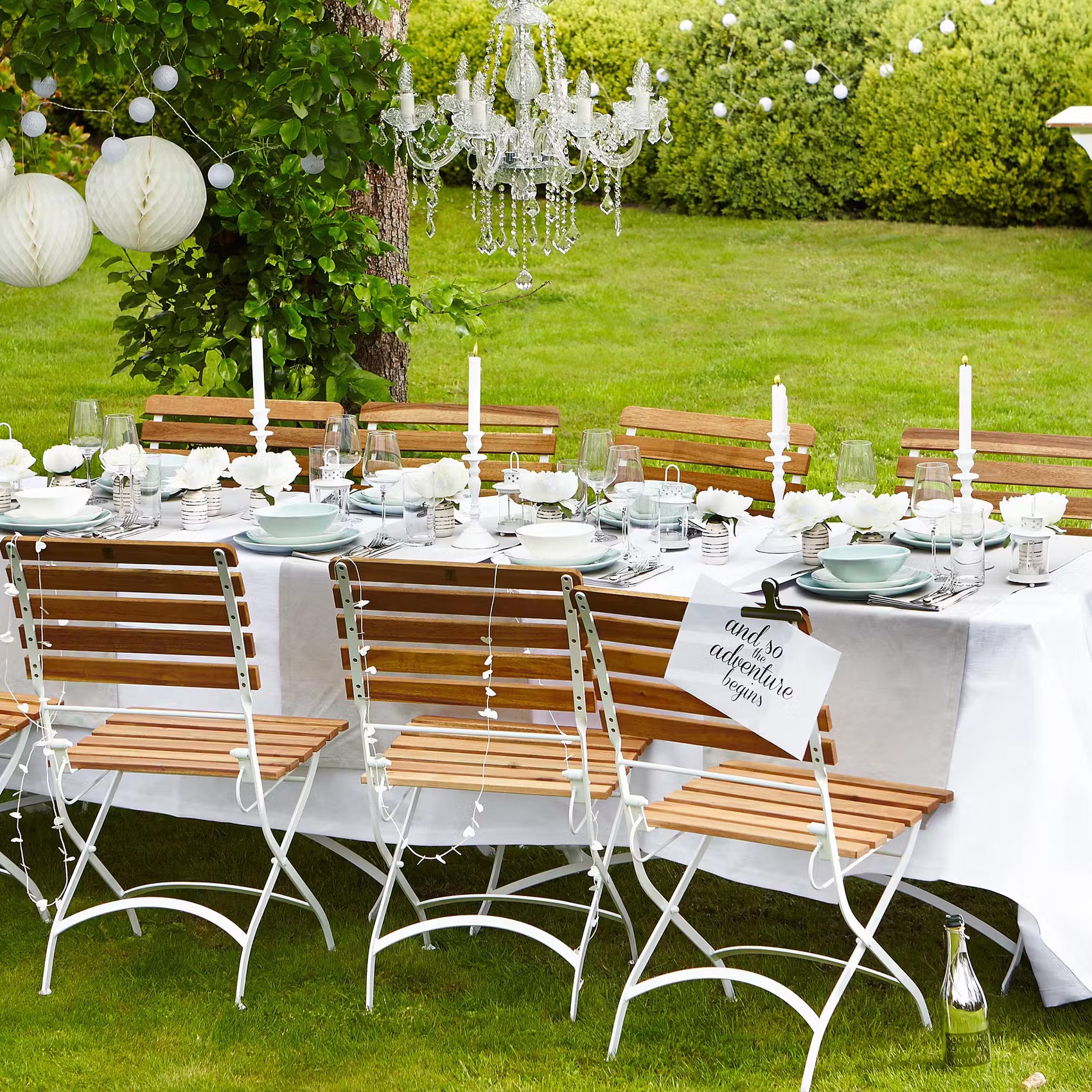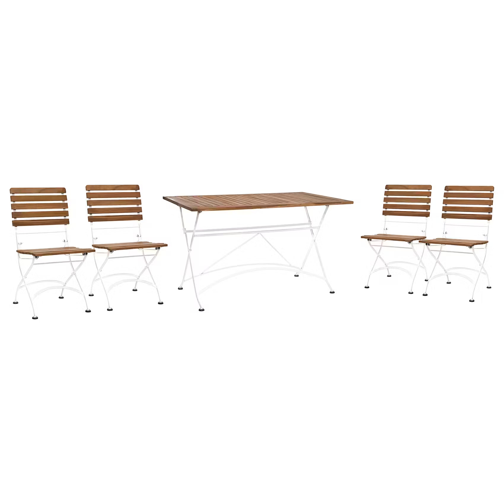 Klappbare Gartenmöbel wie das 5-teilige Parklife Gartenmöbel-Set mit Tisch und vier Stühlen sind einfach unschlagbar. Wenn Sie morgens und nachmittags in der Sonne sitzen wollen. Wenn Sie zwischendurch Platz für eine Partie Croquet brauchen. Oder wenn Ihr Schuppen bzw. Ihre Garage kleiner ist als ein Flugzeughangar. Und wenn Sie das Wegklappen mal vergessen – die wetterfesten Outdoor-Möbel sind nach handwerklicher Tradition aus geöltem Akazienholz und verzinktem Metall gefertigt und trotzen auch mal einem kleinen Schauer.