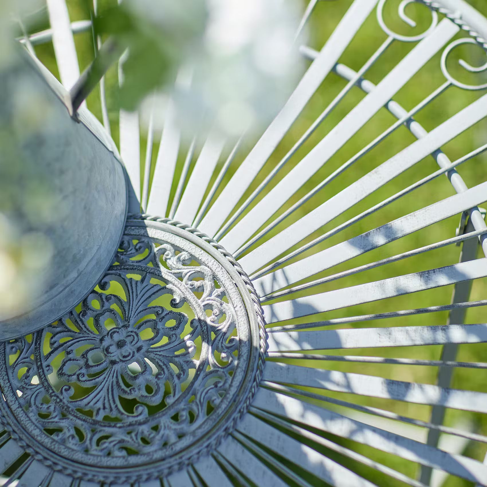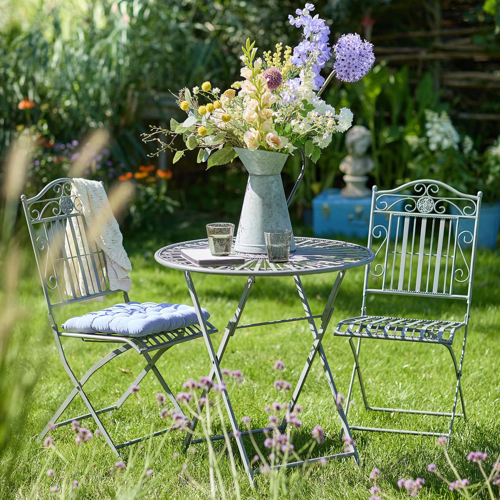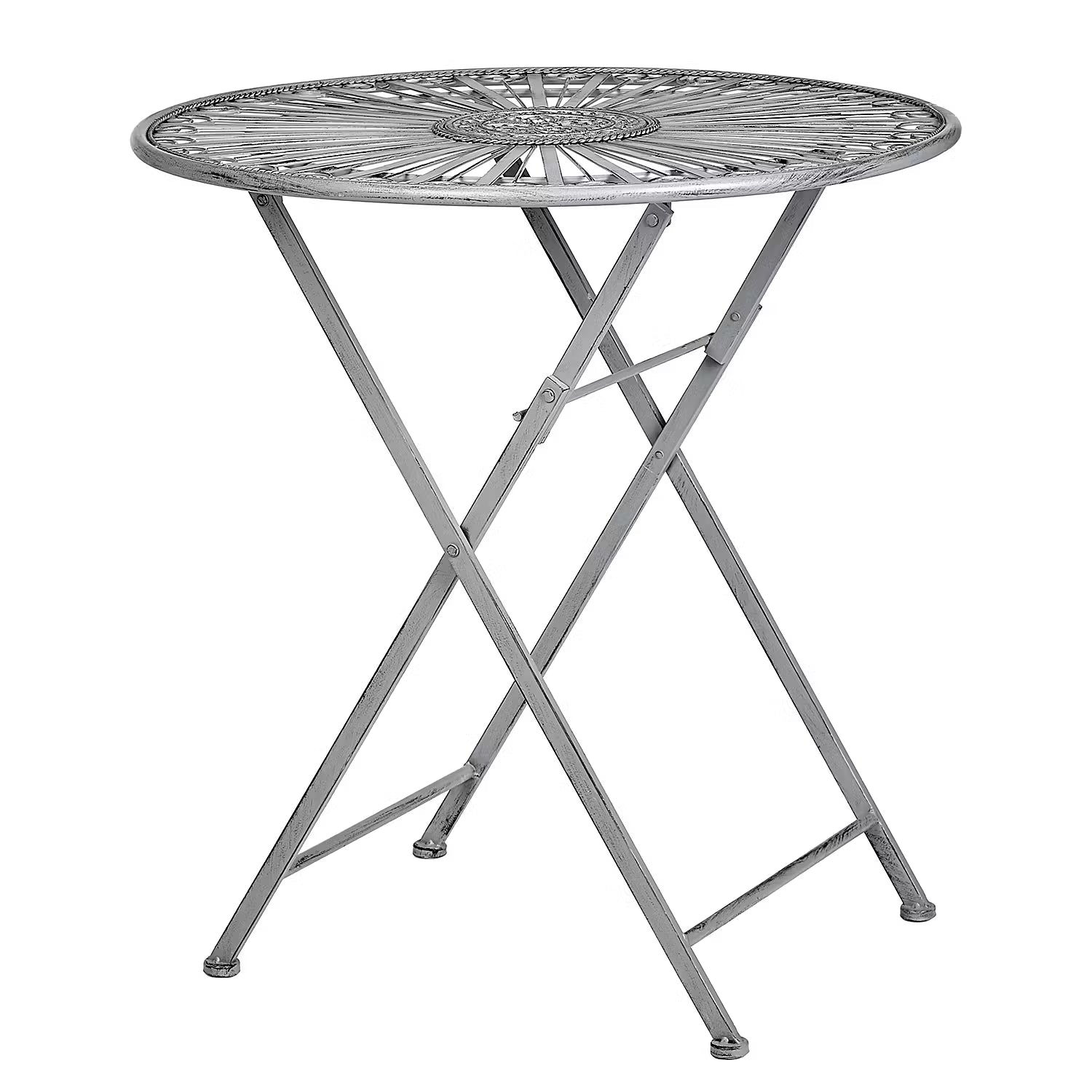 Wie in den Gärten von Versailles genießt du die Sonne und das Vogelgezwitscher mit dem hübschen Terrace Hill Gartenmöbel-Set 3-teilig. Es umfasst einen faltbaren Tisch und zwei faltbare Stühle aus Eisen in Grau, aufwändig im romantischen Stil verziert. Die faltbaren Gartenmöbel lassen sich leicht transportieren und platzsparend verstauen, weshalb sich das Set auch gut für kleinere Balkons eignet. Oder du wanderst mit diesem Gartenmöbel-Set der Sonne hinterher und kostest so die Outdoorsaison voll aus.