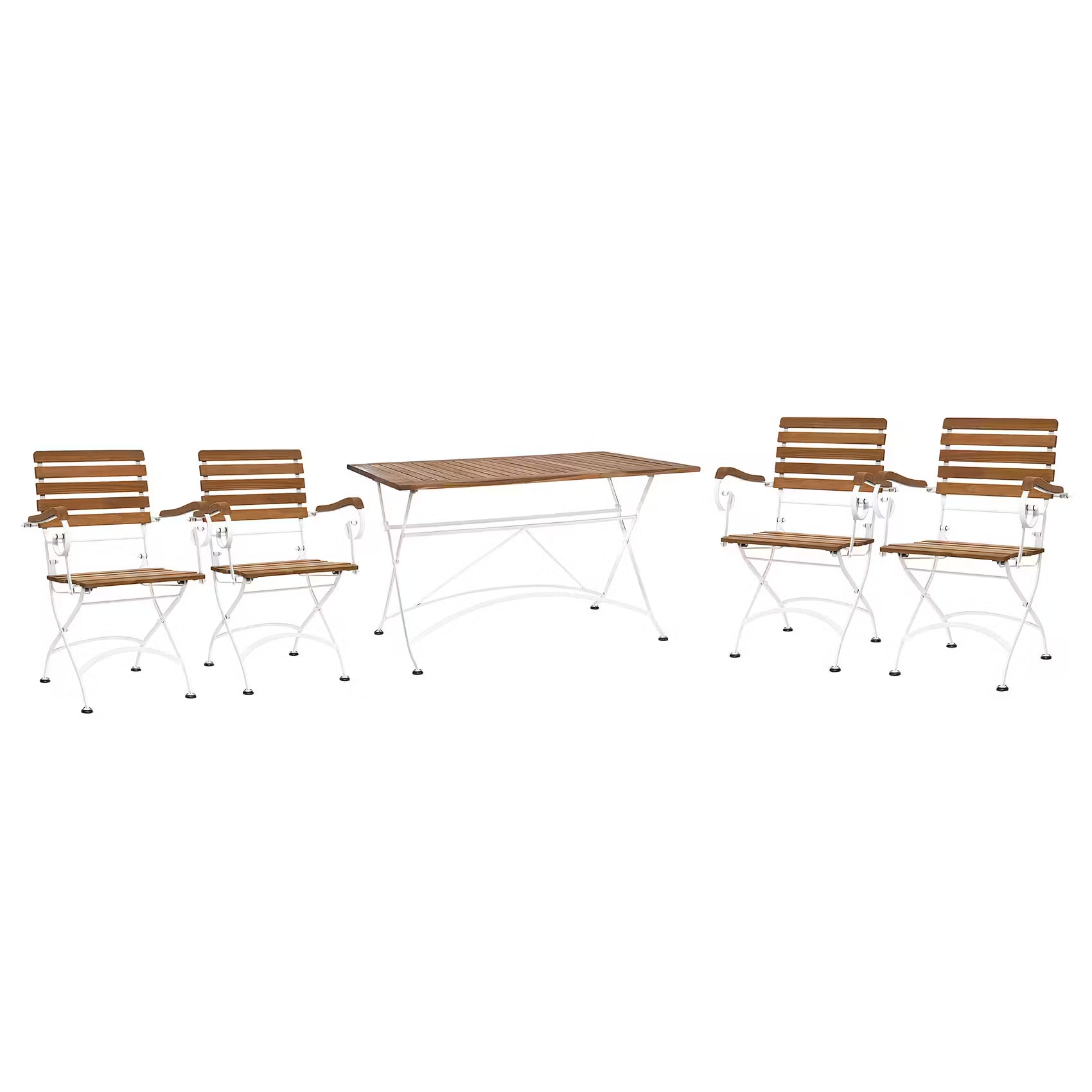 Klappbare Gartenmöbel wie das 5-teilige Parklife Gartenmöbel-Set mit Tisch und vier Stühlen sind einfach unschlagbar. Wenn Sie morgens und nachmittags in der Sonne sitzen wollen. Wenn Sie zwischendurch Platz für eine Partie Croquet brauchen. Oder wenn Ihr Schuppen bzw. Ihre Garage kleiner ist als ein Flugzeughangar. Und wenn Sie das Wegklappen mal vergessen – die wetterfesten Outdoor-Möbel sind nach handwerklicher Tradition aus geöltem Akazienholz und verzinktem Metall gefertigt und trotzen auch mal einem kleinen Schauer.