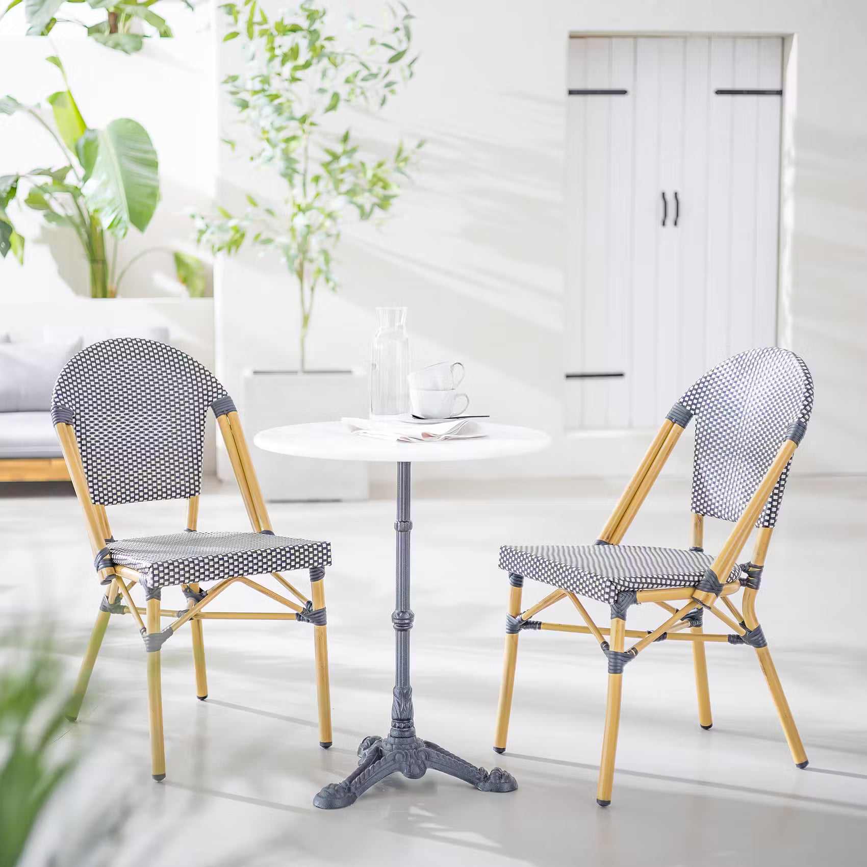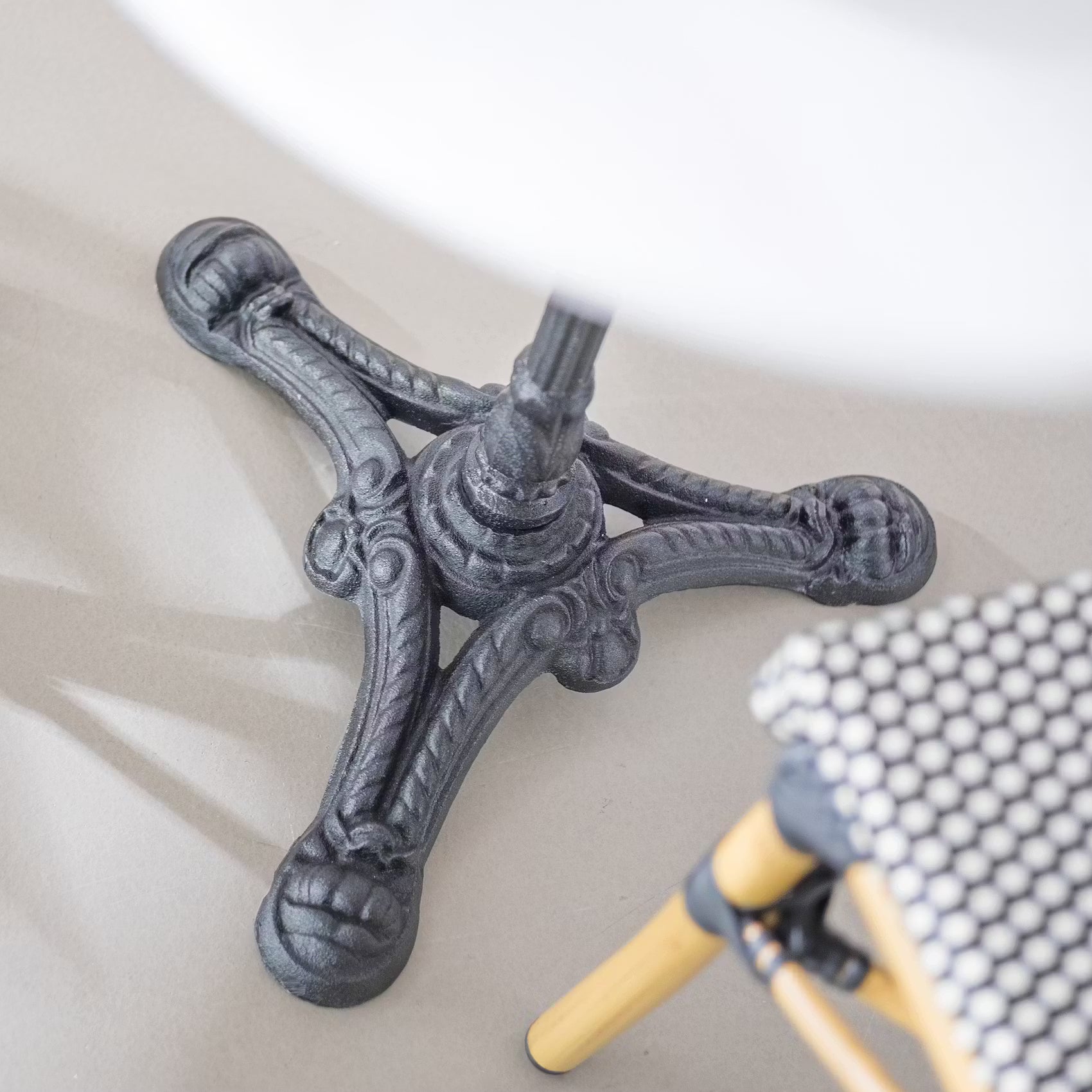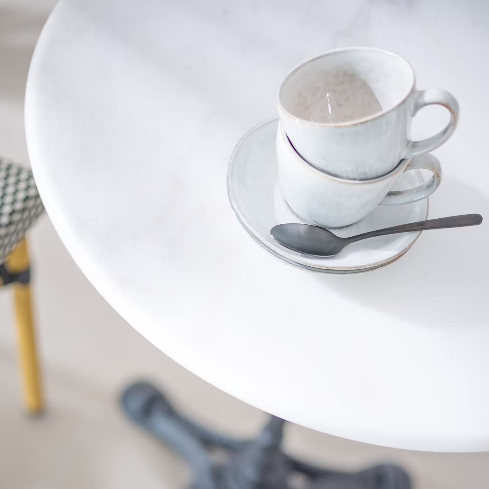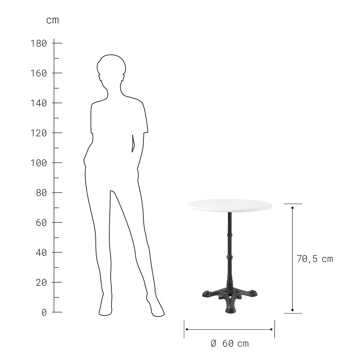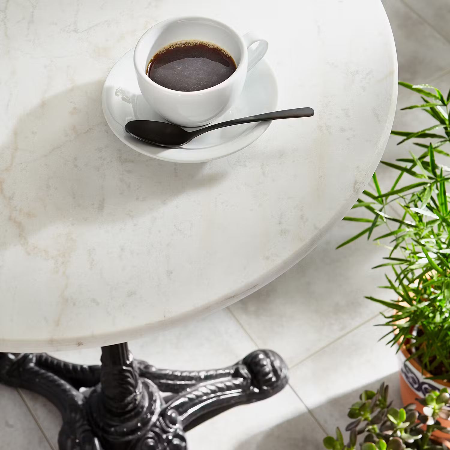 Französischer Bistro-Charme für Ihr Zuhause: Der runde Castello Bistrotisch mit Gusseisenfuß und Marmorplatte beherrscht das Savoir-Vivre. Vielseitig einzusetzen auf Balkon, Terrasse oder im Garten.