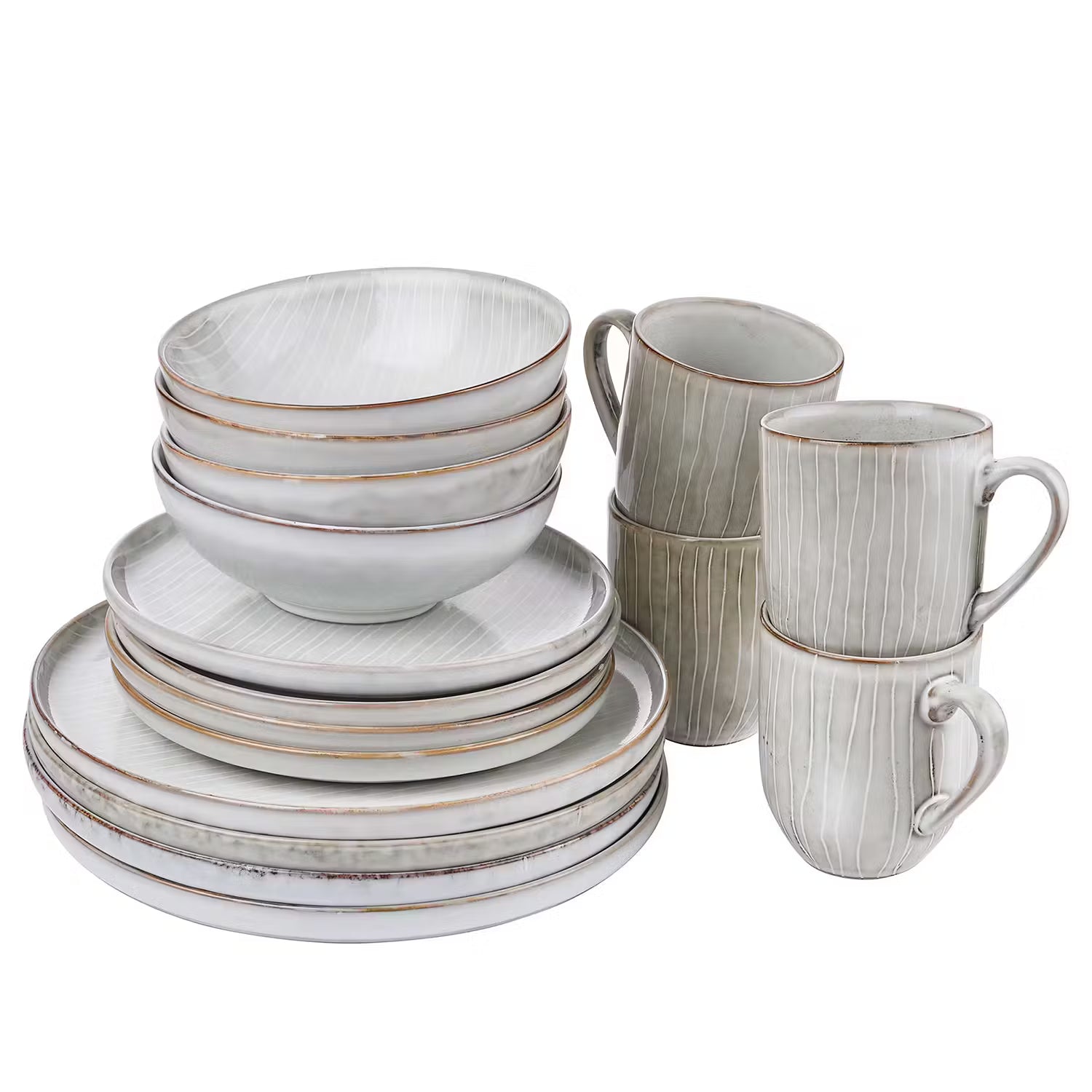 Im Spiel zwischen feiner Sprenkelung, zarter Linienführung und klassisch-robustem Steinzeug bringt das 16-teilige Geschirrset der Henley-Serie Qualität auf den Tisch. Das Set aus jeweils vier Tassen, Schalen, Frühstückstellern sowie großen Speisetellern ist hervorrgend geeignet um den ganzen Tisch im beliebten Landhausstil einzudecken. Das Steinzeug-Geschirr der Henley-Reihe verfügen über eine sanfte Riffelung die jedes Stück zum Unikat macht und so den Tellern, Tassen und Schalen einen ganz individuellen Charme verleiht.Hochwertige Keramik: Robust und hitzebeständigJedes Teil ein Unikat: Natürliche Unterschiede bei der FarbgebungReaktive Glasur: Jedes Teil ein Unikat, durch Unterschiede bei der FarbgebungEin natürlicher Look mit Charme und CharakterIm Trend: Skandinavisches DesignGeeignet für jeden Anlass durch schlichte und solide Machart