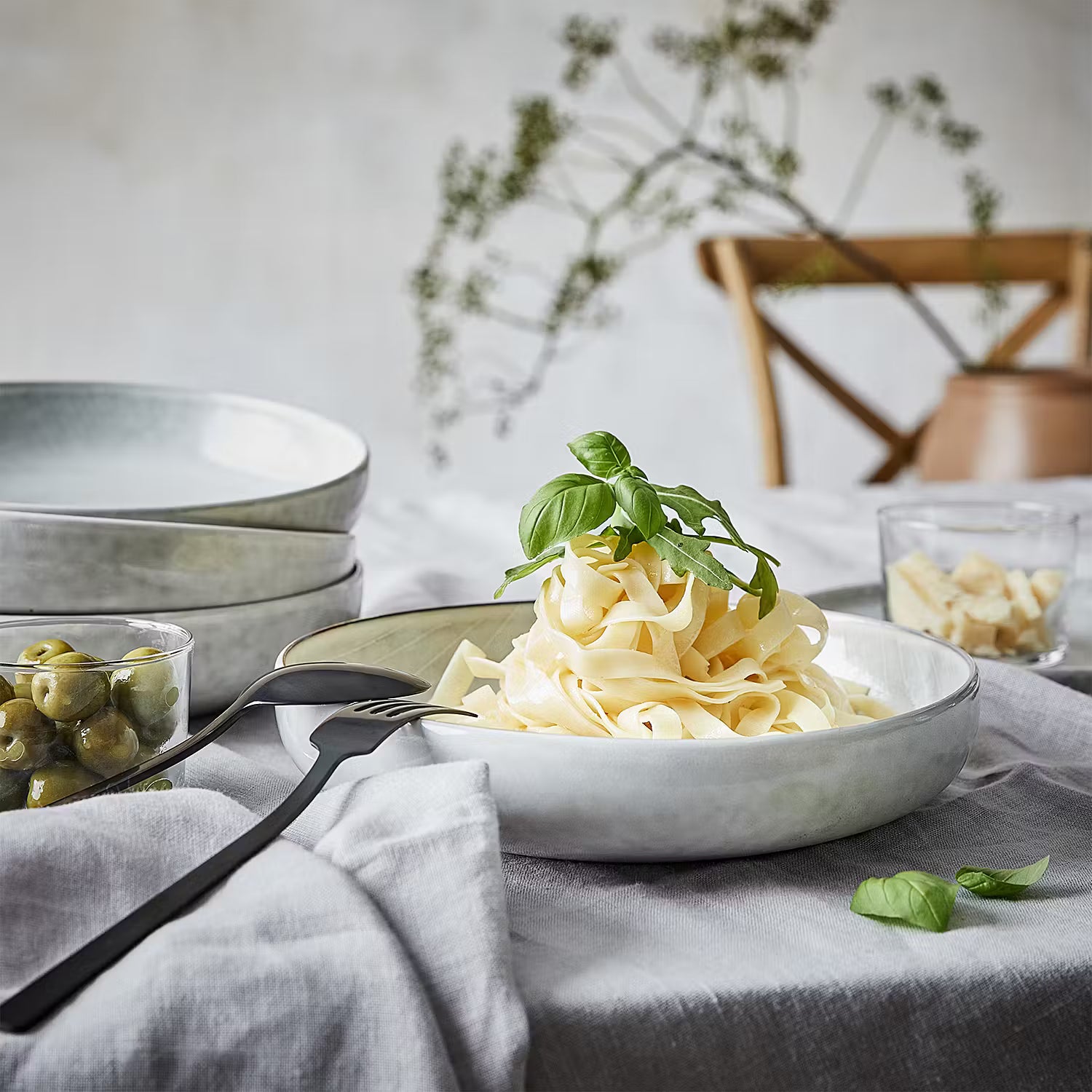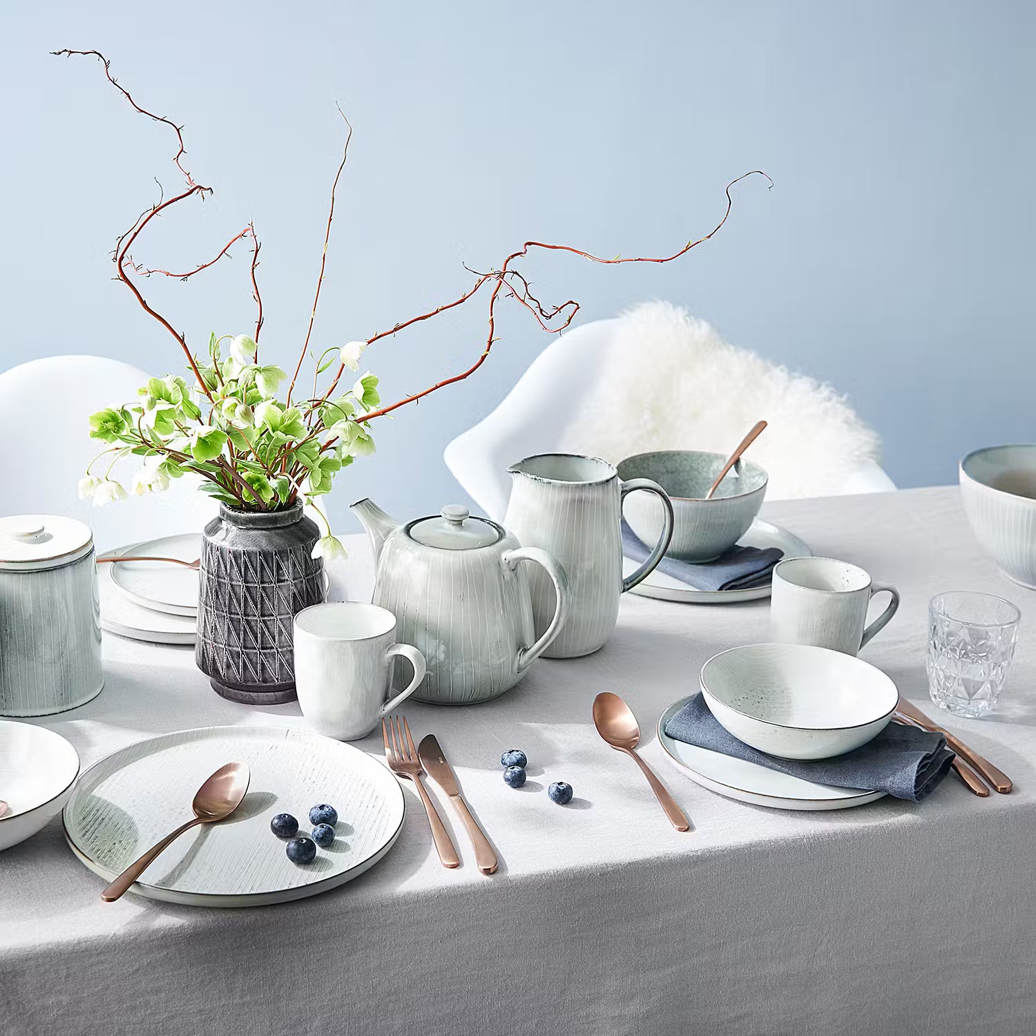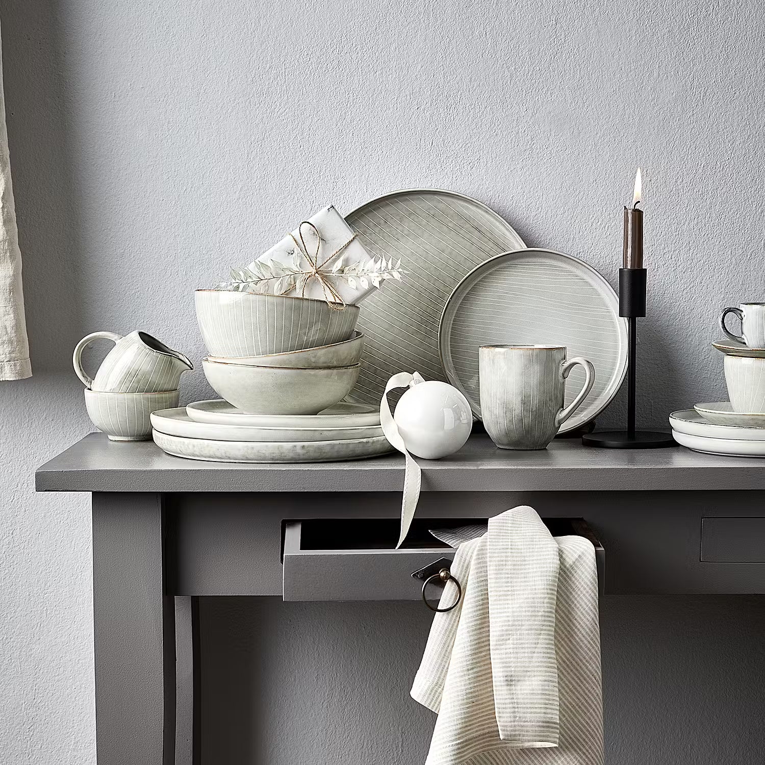 Im Spiel zwischen feiner Sprenkelung, zarter Linienführung und klassisch-robustem Steinzeug bringt das 16-teilige Pasta-Set der Henley-Serie Qualität auf den Tisch. Das Set aus jeweils vier Tassen, Schalen, Frühstückstellern sowie großen Speisetellern ist hervorrgend geeignet um den ganzen Tisch im beliebten Landhausstil einzudecken. Das Steinzeug-Geschirr der Henley-Reihe verfügt über eine sanfte Riffelung die jedes Stück zum Unikat macht und so den Tellern, Tassen und Schalen einen ganz individuellen Charme verleiht.