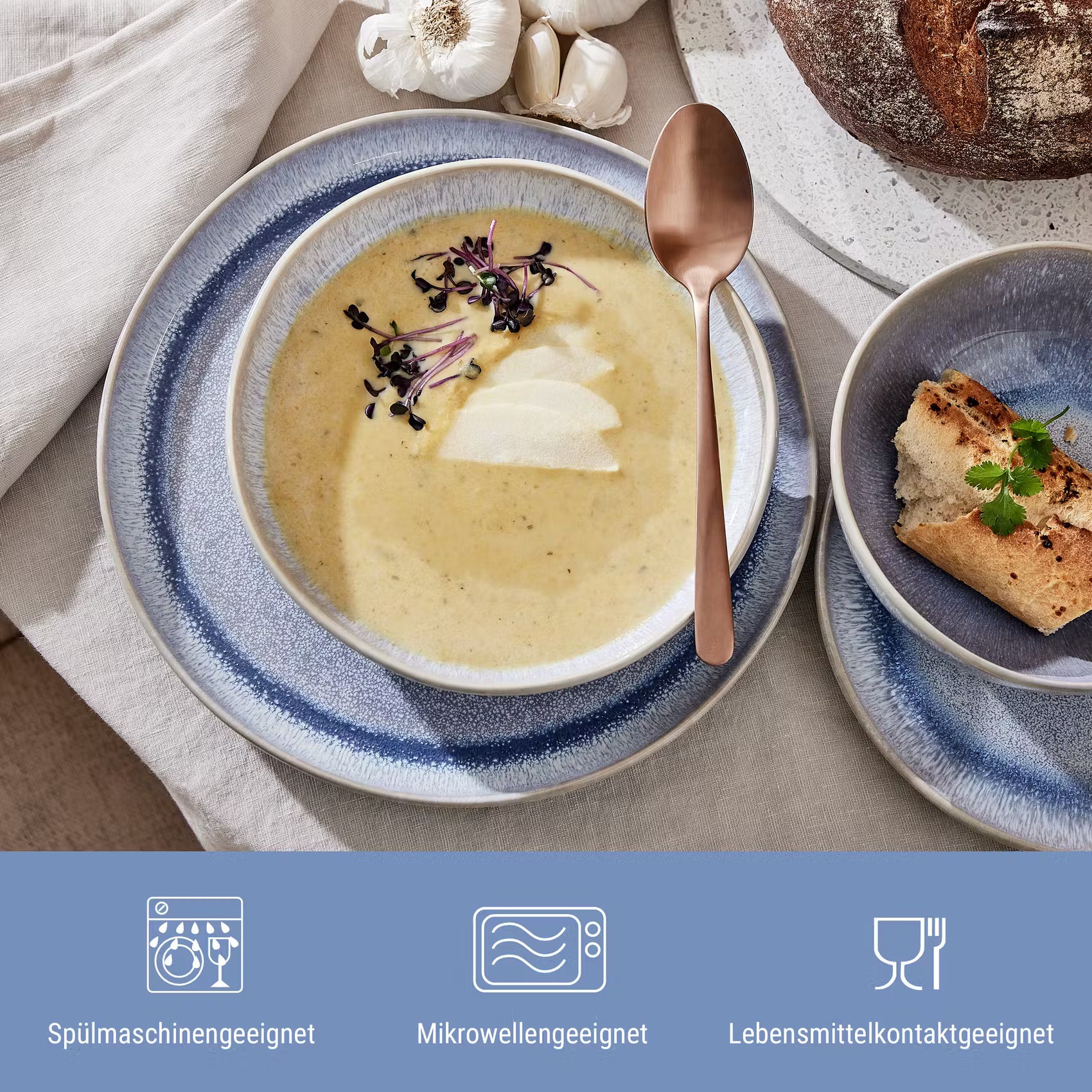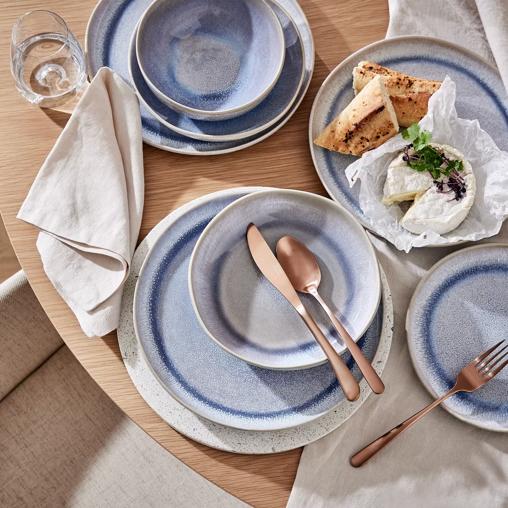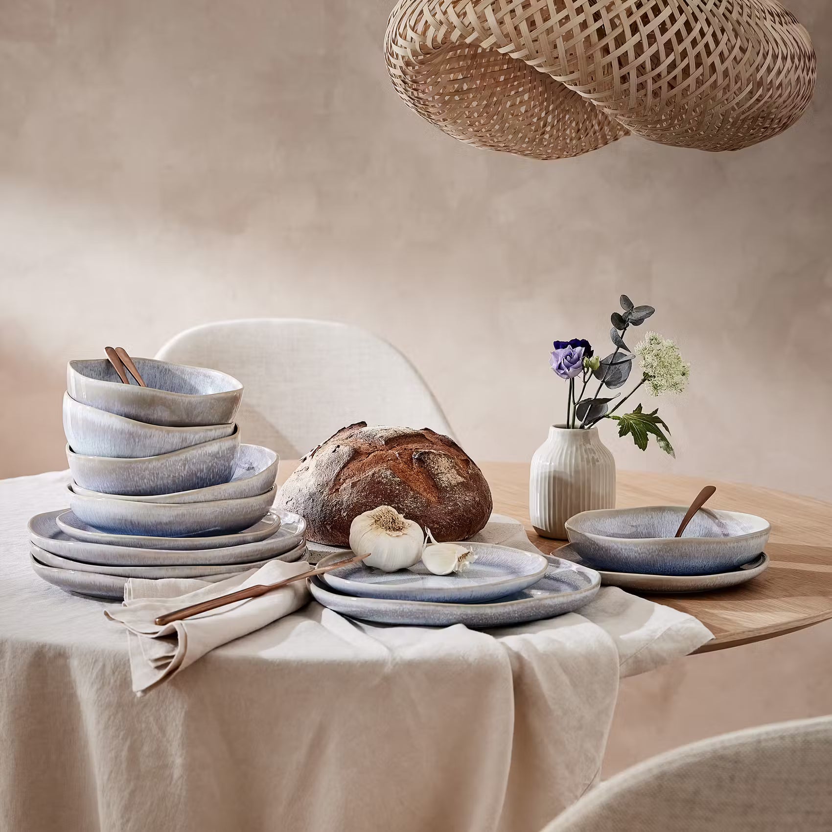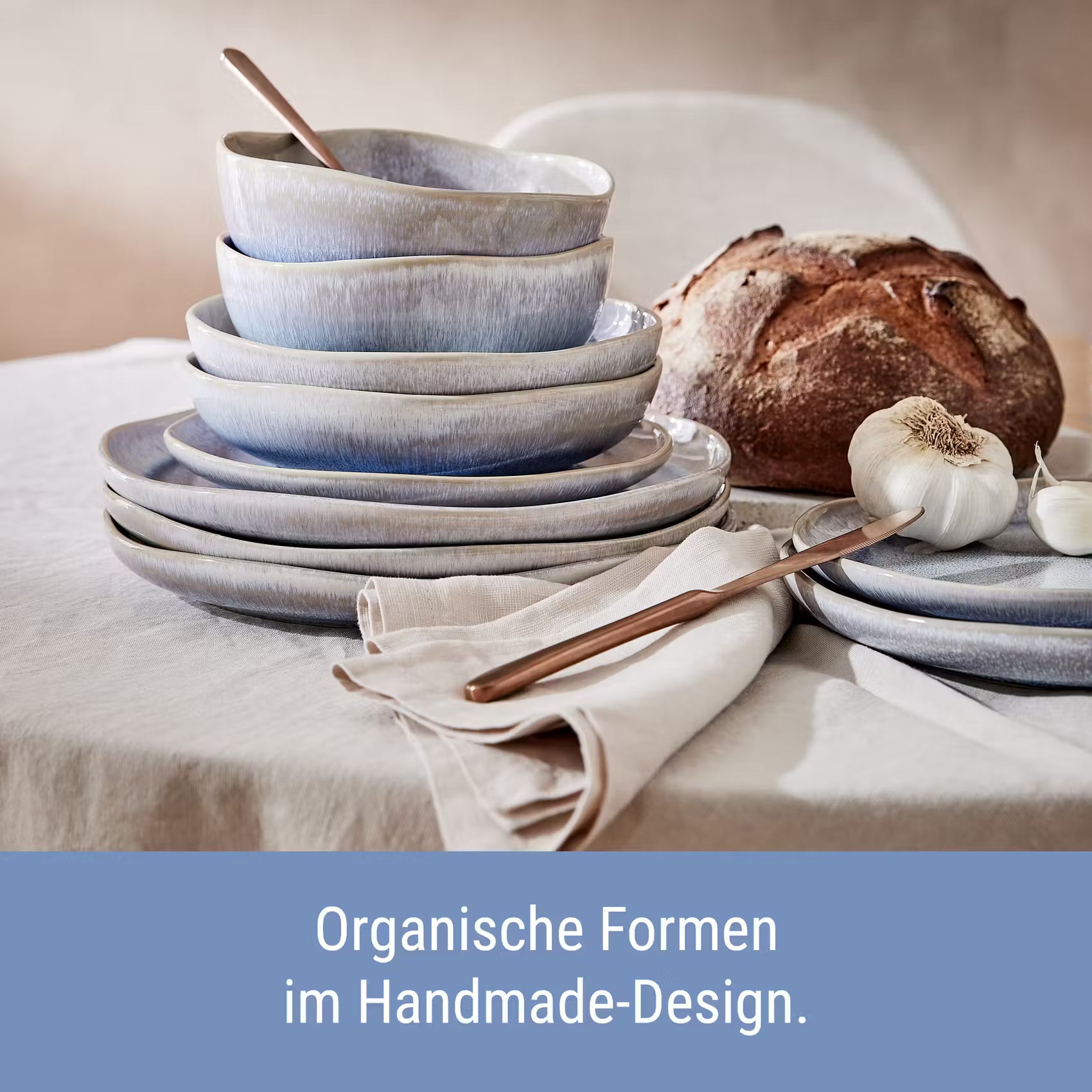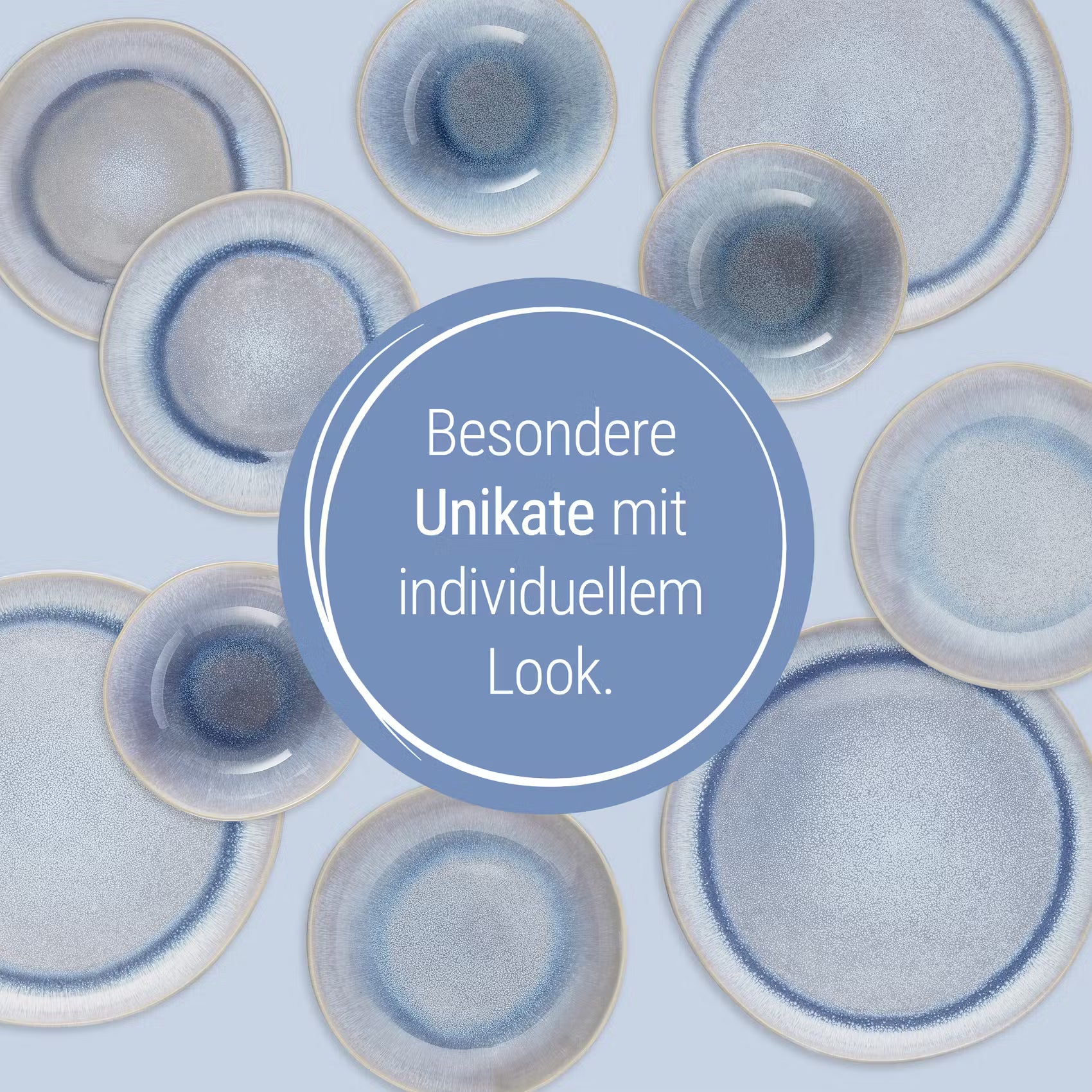 Wenn eine reaktive Glasur zum Kunstwerk wird: Am faszinierend schönen Hilda Geschirr Set 24-teilig können Sie sich gar nicht satt sehen. Die schimmernden Blautöne erinnern an nordische Fjorde und malerische Bergseen, und auch der organische Shape erzählt von Naturverbundenheit. Jedes Teil dieser einzigartigen Geschirrserie aus Steinzeug ist ein Einzelstück, und jeder mit Hilda Tellern, Schalen und Tassen gedeckter Tisch die reinste Augenweide.