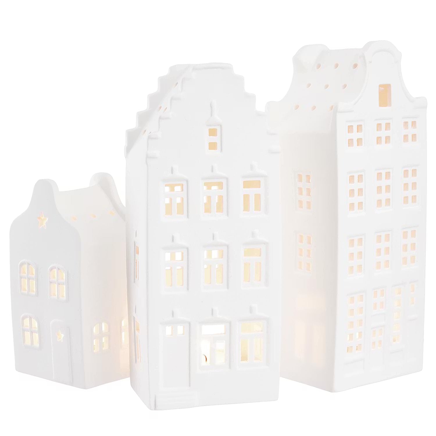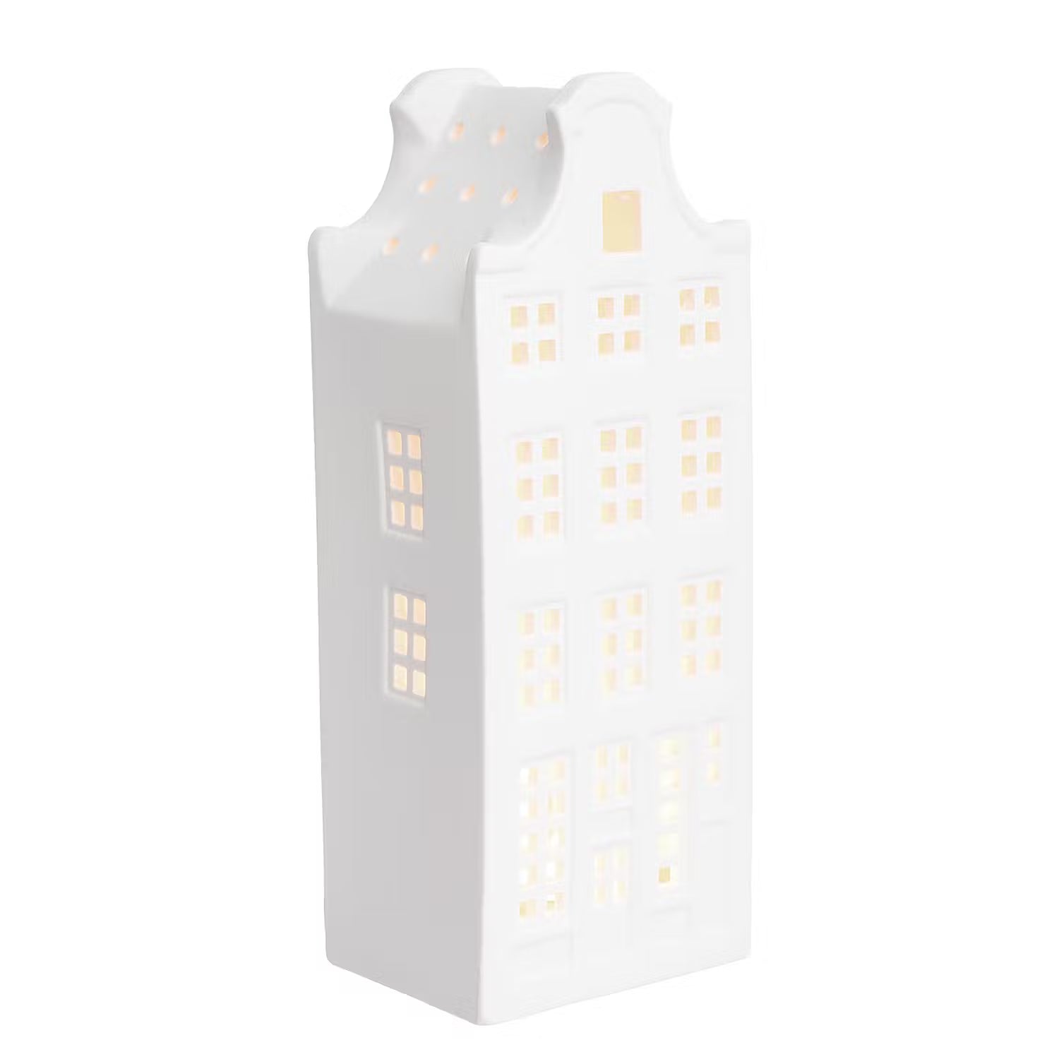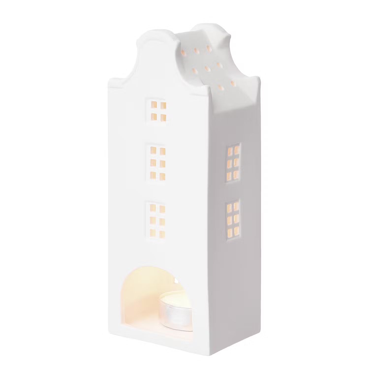 Sie holen sich ein Stück romantische Weihnachten ins Haus mit dem Amsterdam Grachtenhaus Schweifgiebel. Dieses Teelichthaus ist aus weißem Porzellan gefertigt und greift die typische Häuserform auf, die in der niederländischen Metropole entlang der alten Wasserstraßen zu finden ist. Mit dem Anzünden des Teelichts strahlt das Haus warm von Innen heraus, was gerade an kalten Winterabenden besonders behaglich wirkt. In einer weiteren Variante erhältlich, ideal auch zum Kombinieren.