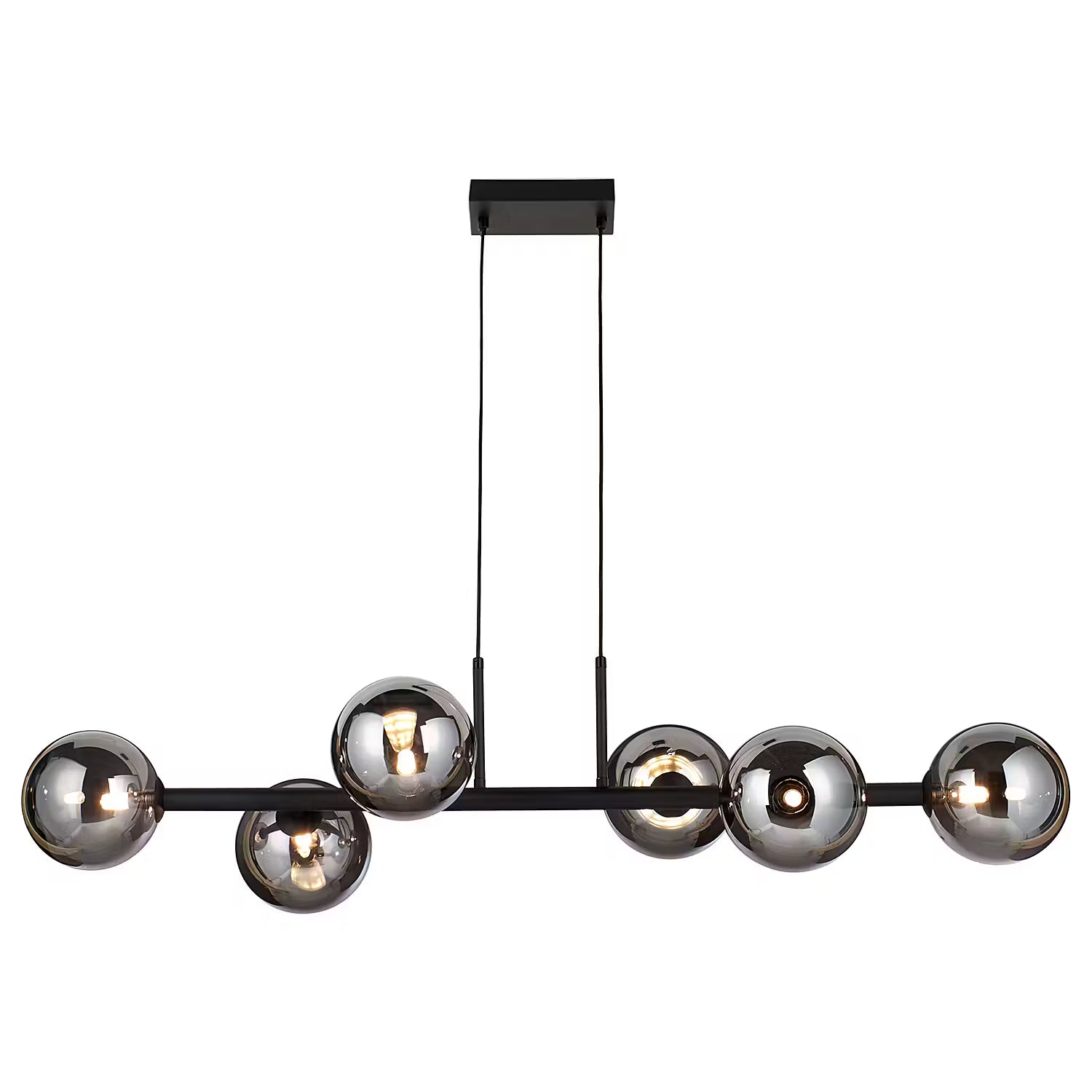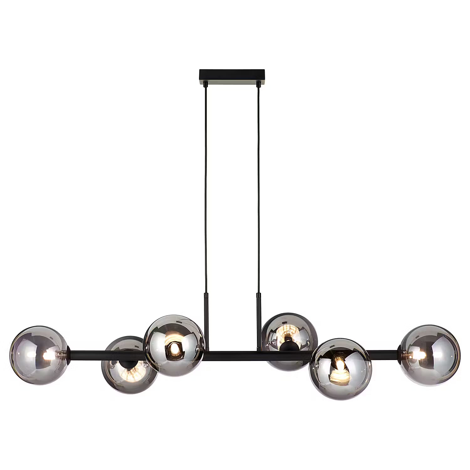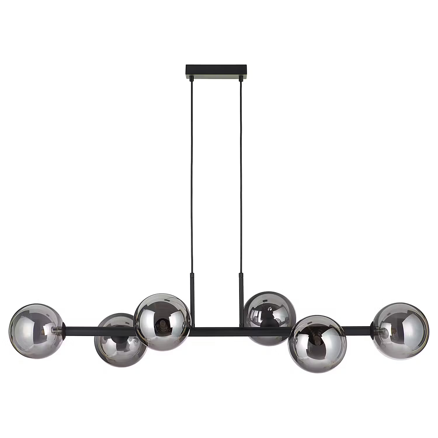 Für einen echten Wow-Effekt sorgt die hochwertige Tyge Hängeleuchte 6-flammig in Schwarz. Moderne LED-Leuchten erhellen die dunklen Glaskugeln von innen, stylish und edel. Mit ihrem schimmernden Beleuchtungseffekt kann sich die Design-Hängelampe z.B. dekorativ über dem Esstisch sehen lassen oder dein Wohnzimmer aufwerten. In einer weiteren Variante erhältlich.
