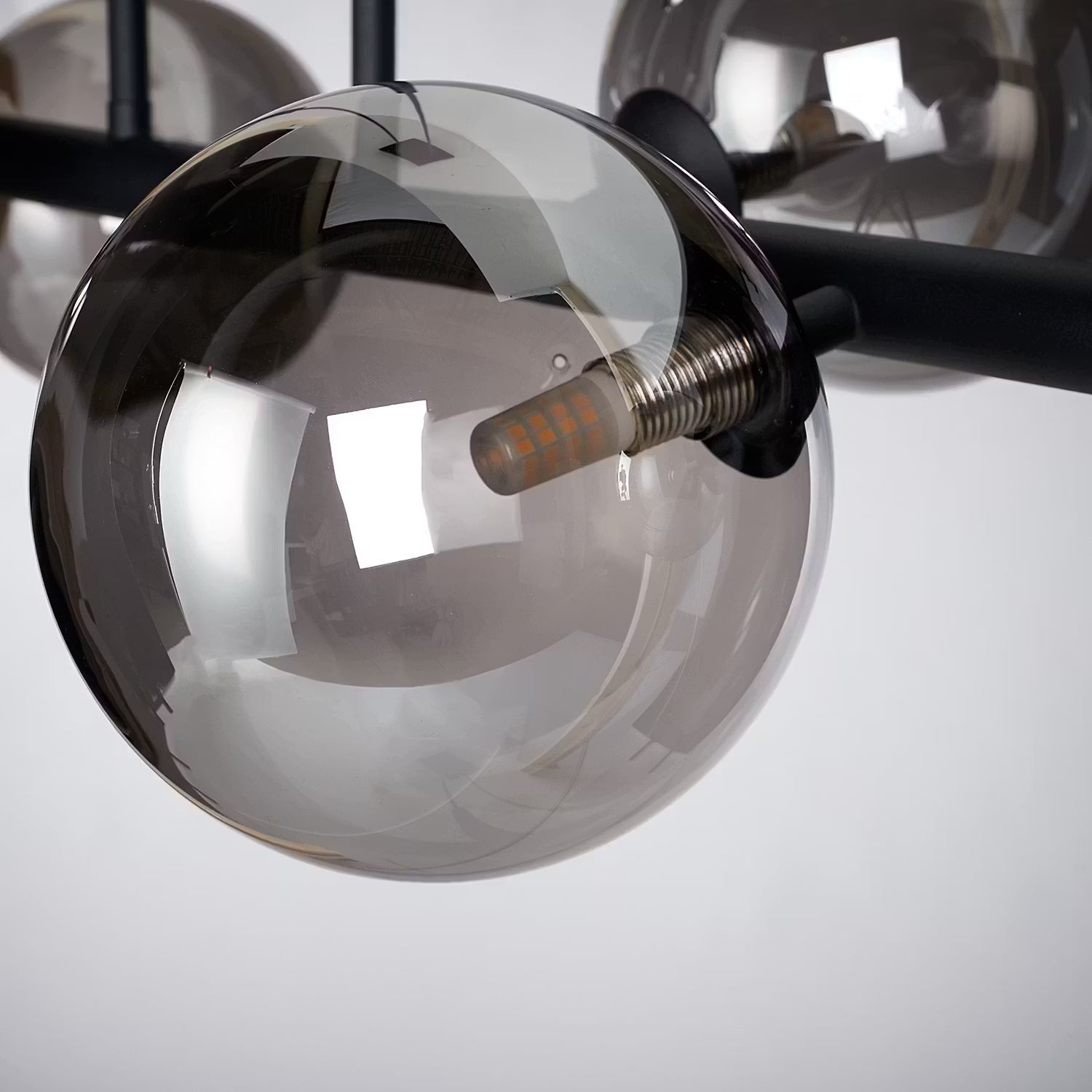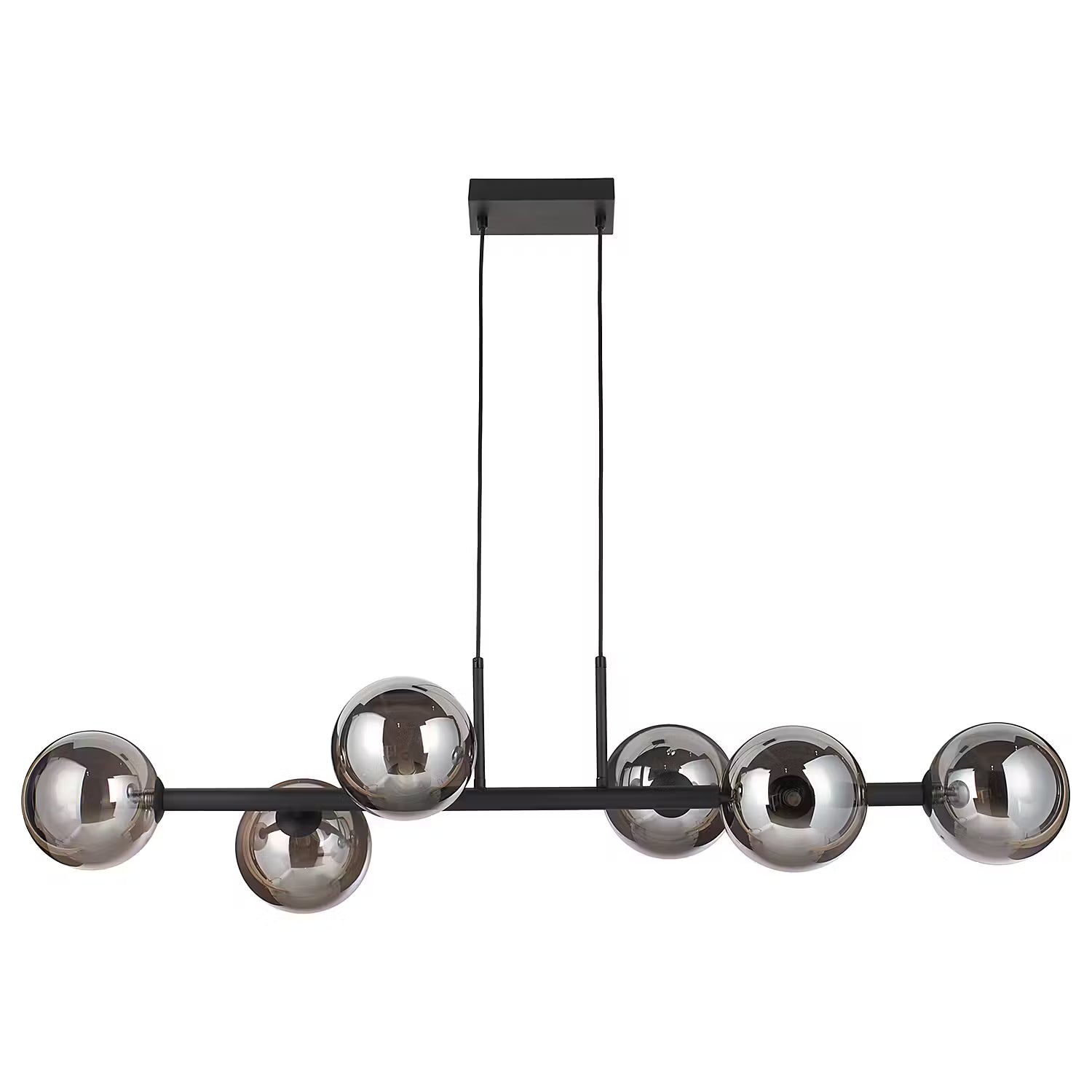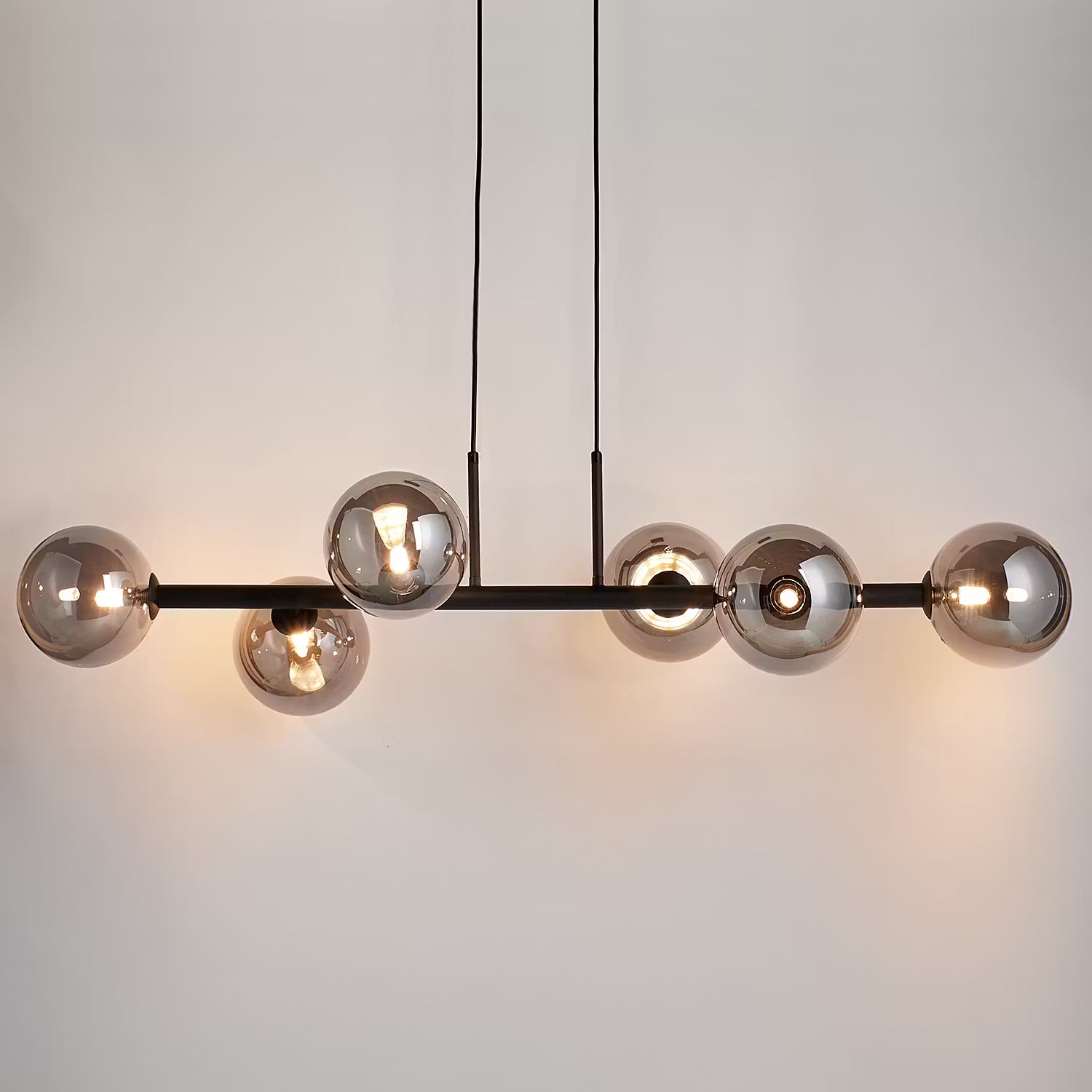 Für einen echten Wow-Effekt sorgt die hochwertige Tyge Hängeleuchte 6-flammig in Schwarz. Moderne LED-Leuchten erhellen die dunklen Glaskugeln von innen, stylish und edel. Mit ihrem schimmernden Beleuchtungseffekt kann sich die Design-Hängelampe z.B. dekorativ über dem Esstisch sehen lassen oder dein Wohnzimmer aufwerten. In einer weiteren Variante erhältlich.