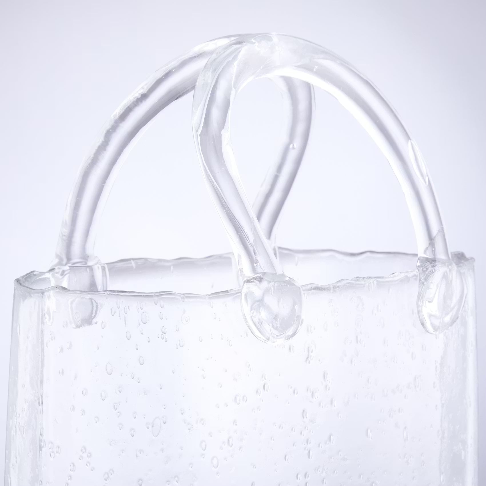 Shoppingqueens verlieben sich auf den ersten Blick in die Kelly Glasvase mit Henkeln. Diese Vase aus klarem Glas greift die Idee einer Einkaufstasche oder auch Handtasche auf, und Blumen und Zweige wirken wie frisch aus der Boutique mitgebracht.