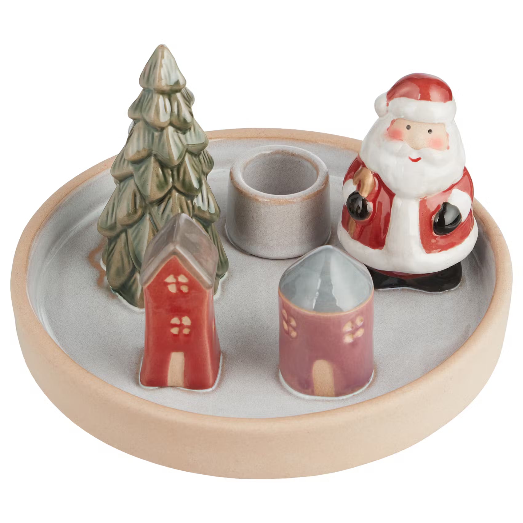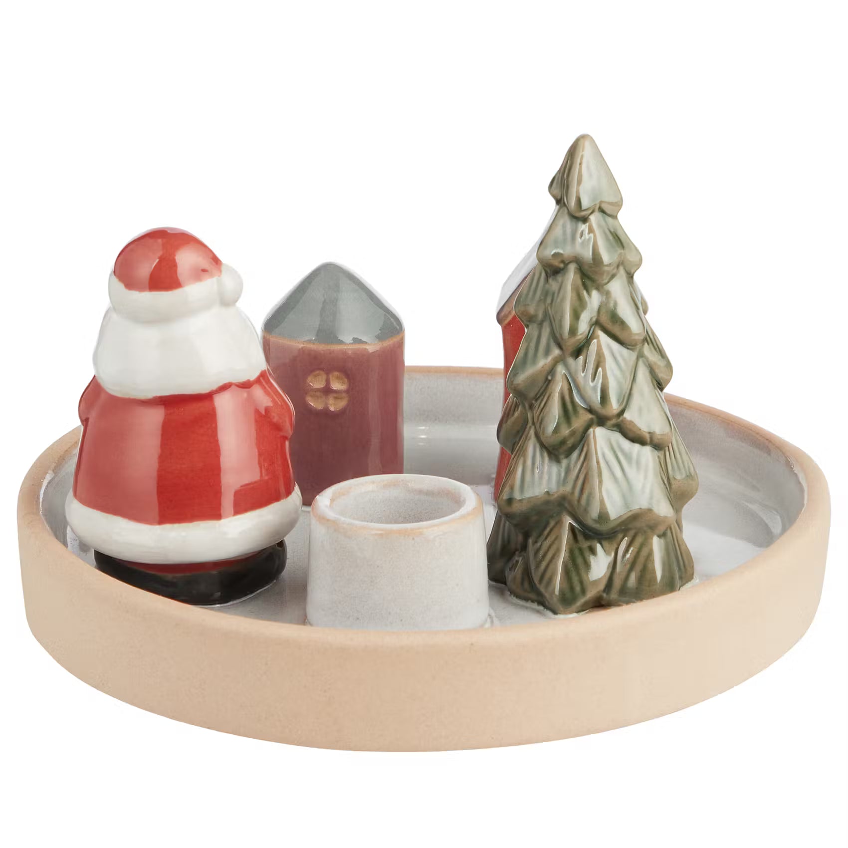 Der originelle Winter Village Kerzenhalter aus weißem Steingut hat noch jemanden mitgebracht: einen dekorativen Weihnachtsmann, der neben zwei Häusern und einer Tanne posiert. So entsteht ein kleine Figurengruppe - und das auf angenehm moderne Art.