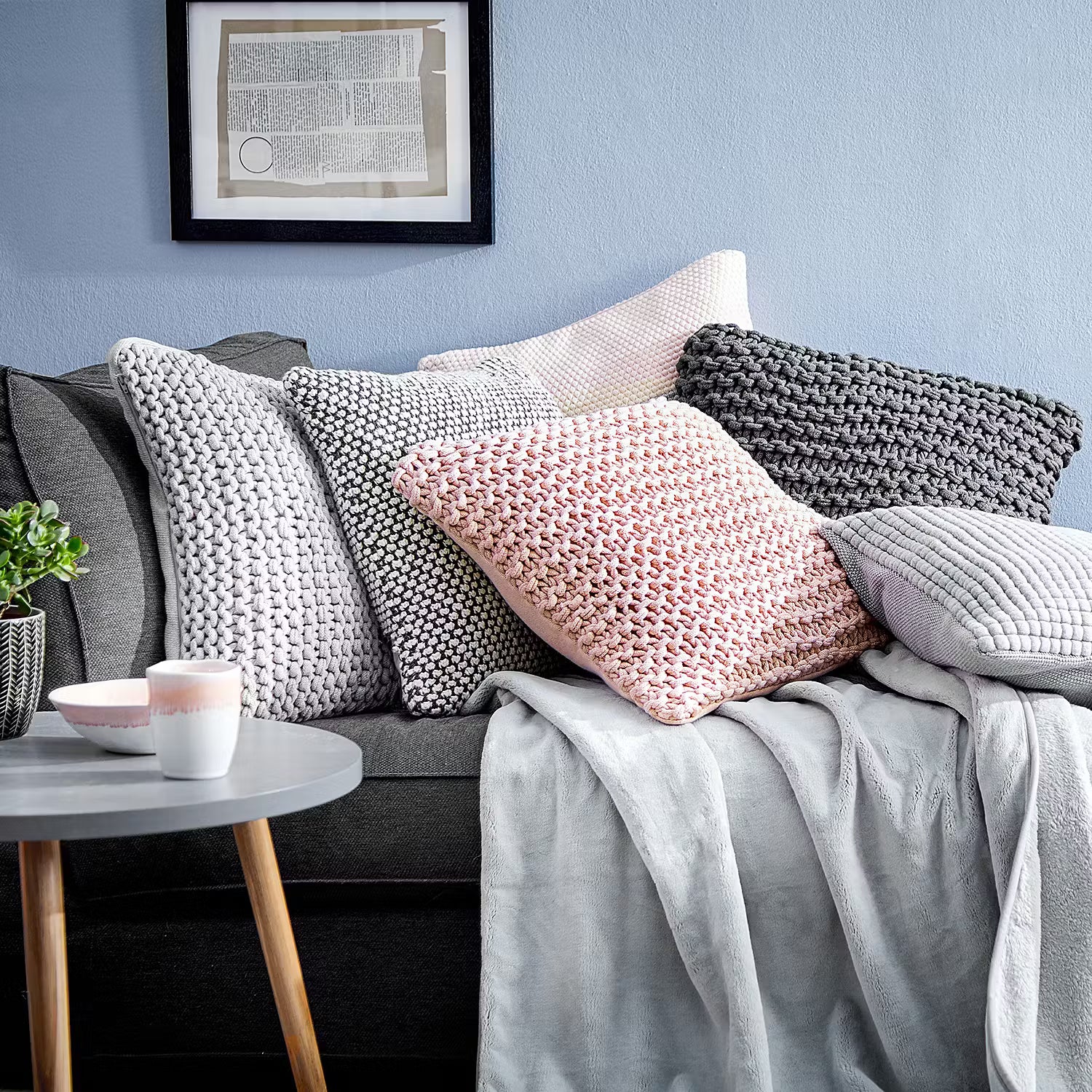 Zwei rechts, zwei links, zwei fallenlassen? Das Soft Needle Kissen 50 x 50 cm ist da schon etwas raffinierter gestrickt. Angesagter Grobstrick, Rückseite in Feinstrick. Im Handumdrehen sind Sie startklar für die Wintersaison. In weiteren Farben erhältlich, ideal auch zum Kombinieren.