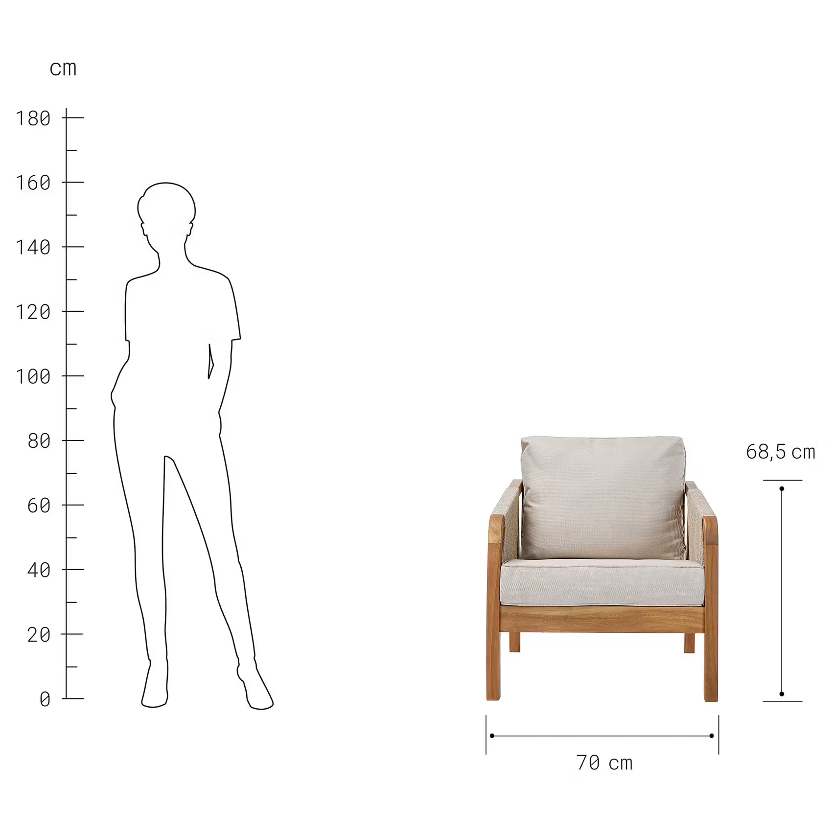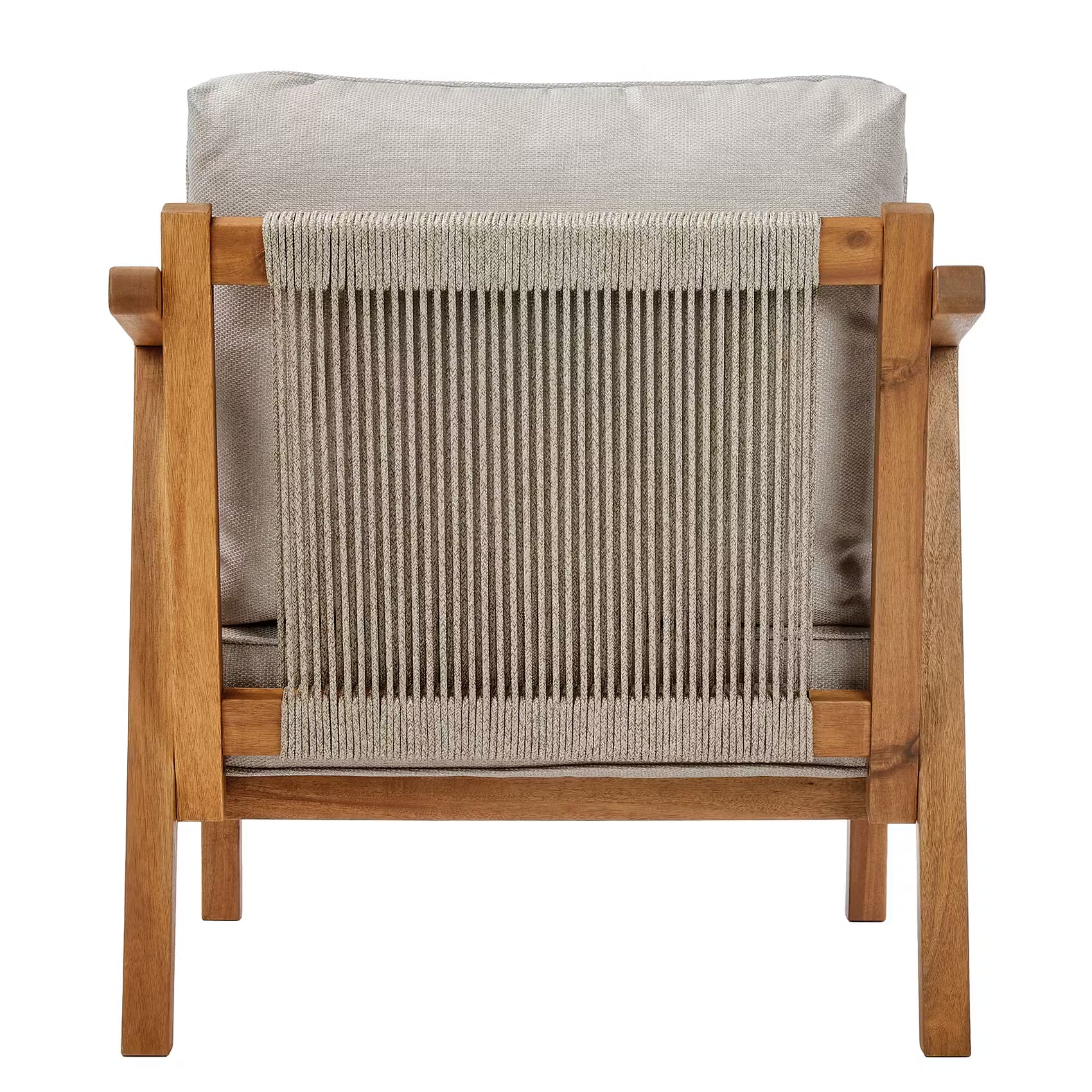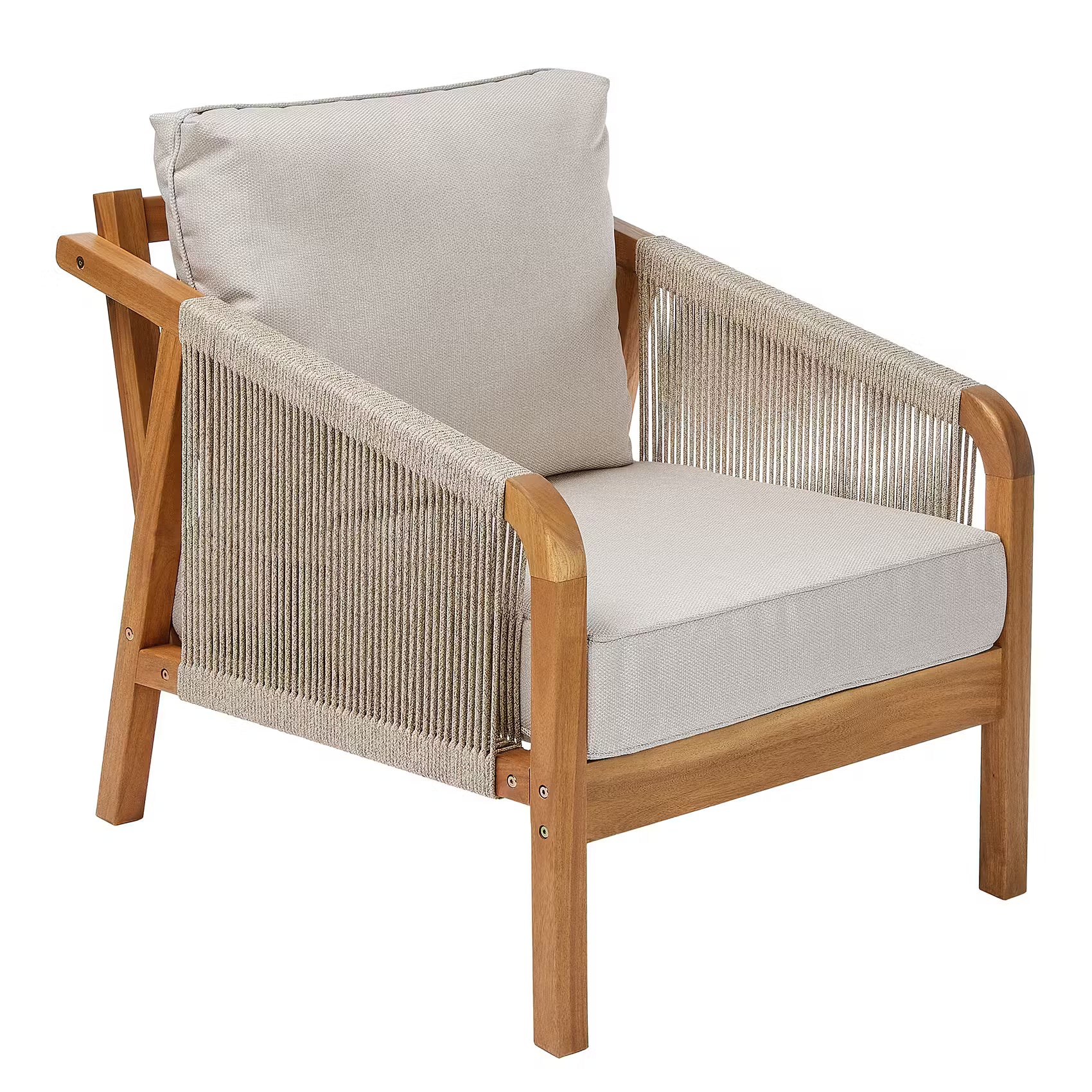 Natürliche Farben, echtes Akazienholz und angesagte Rope-Schnüre an den Armlehnen und im Rücken: Der Rope Island Loungeset mit 2 Outdoor-Sesseln und 2 Beistelltischen hat alles, was die Warmwettersaison auf der Terrasse oder auf dem Balkon noch schöner macht. Für ein hohes Maß an Sitzkomfort sorgen bei den Sesseln die gemütlichen Polster, die sich dank Reißverschluss einfach abnehmen und bei Bedarf von Hand waschen lassen. Die runden Beistelltische aus Akazienholz begeistern mit ihrer schlichten Form und dem warm schimmernden Holzton. So gestalten Sie mit diesem Set für 2 Personen Ihre persönliche Komfortzone im Freien.