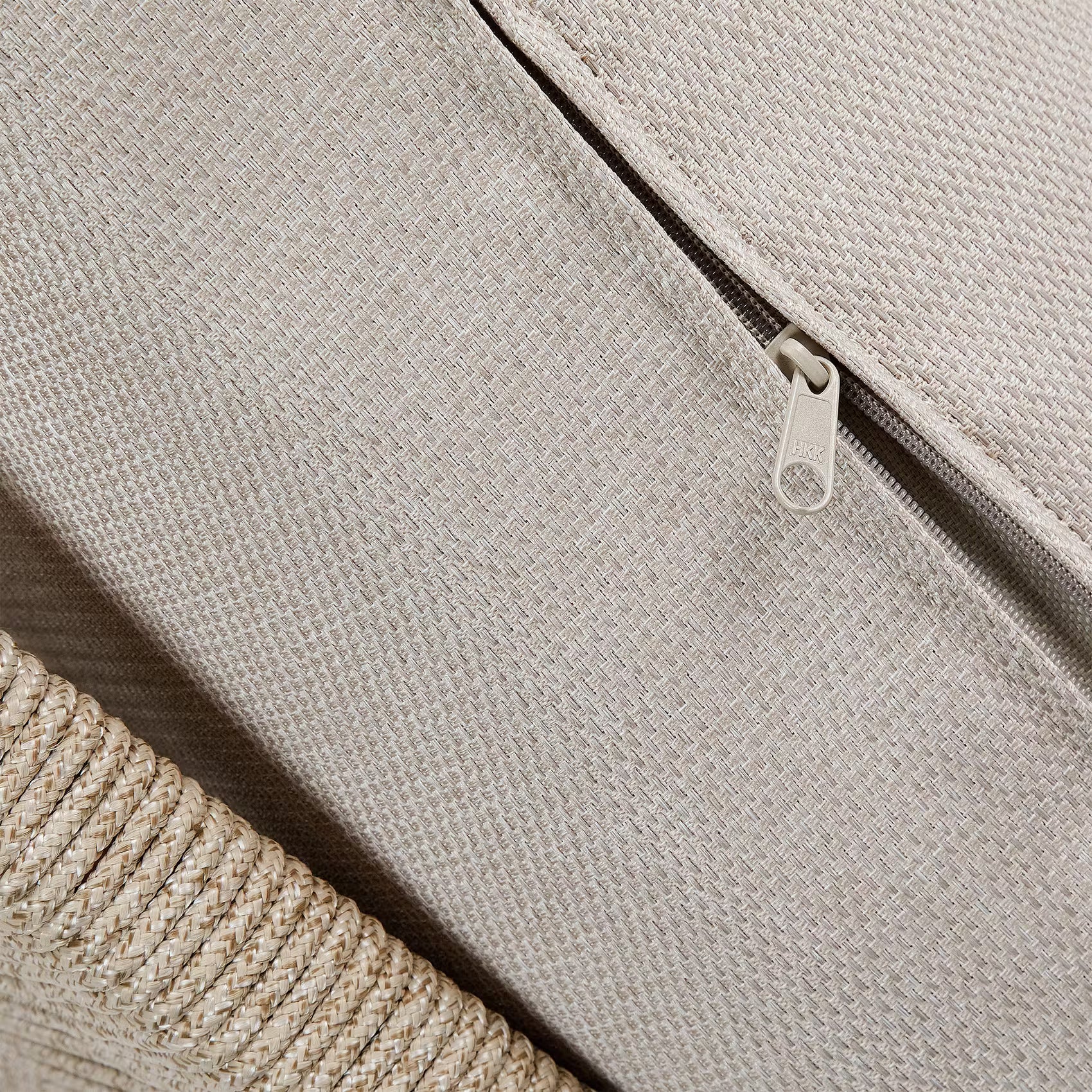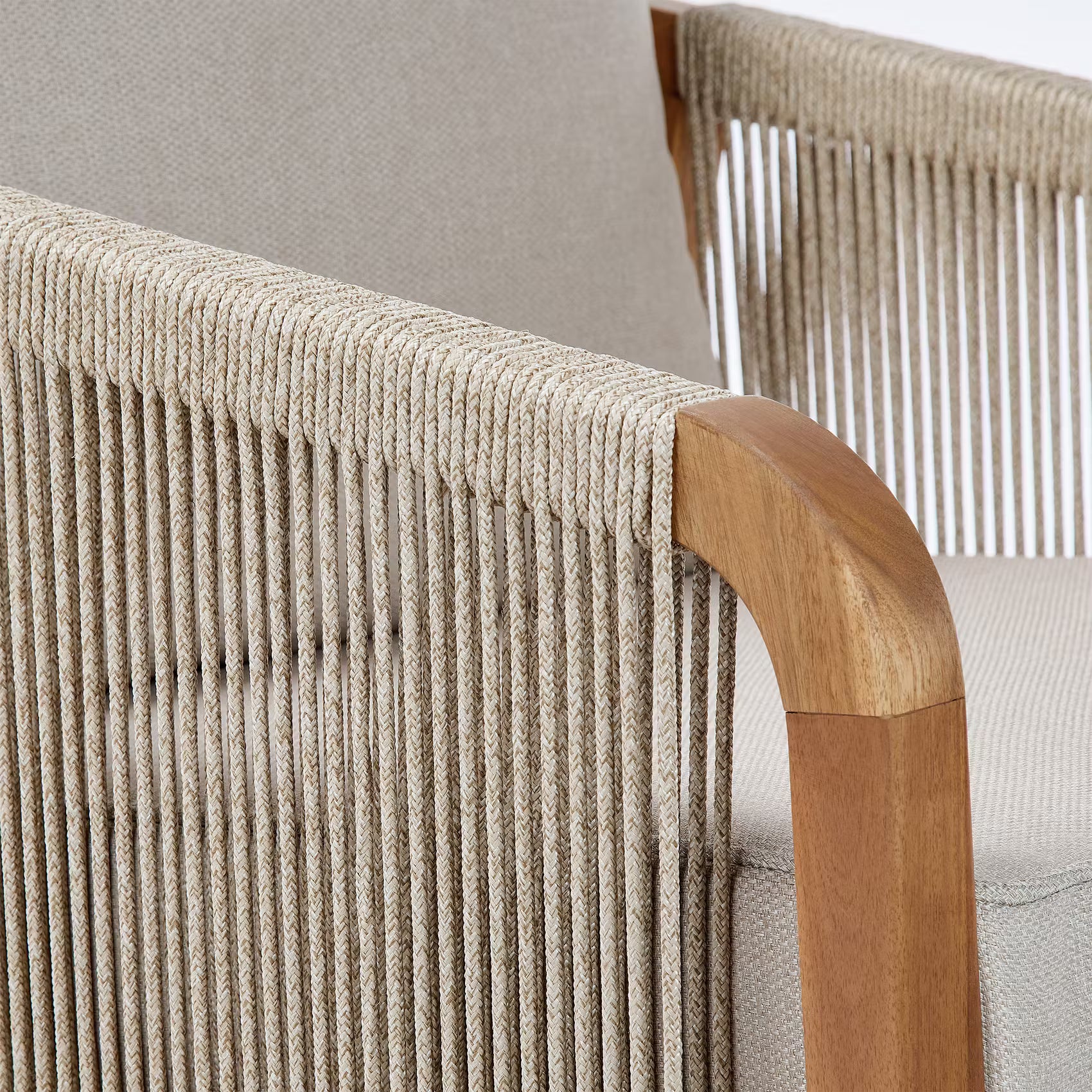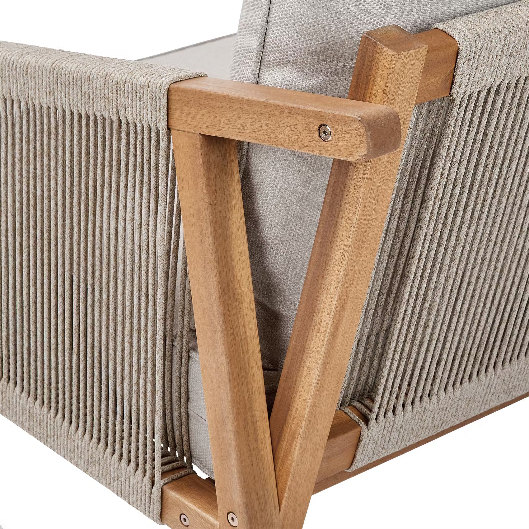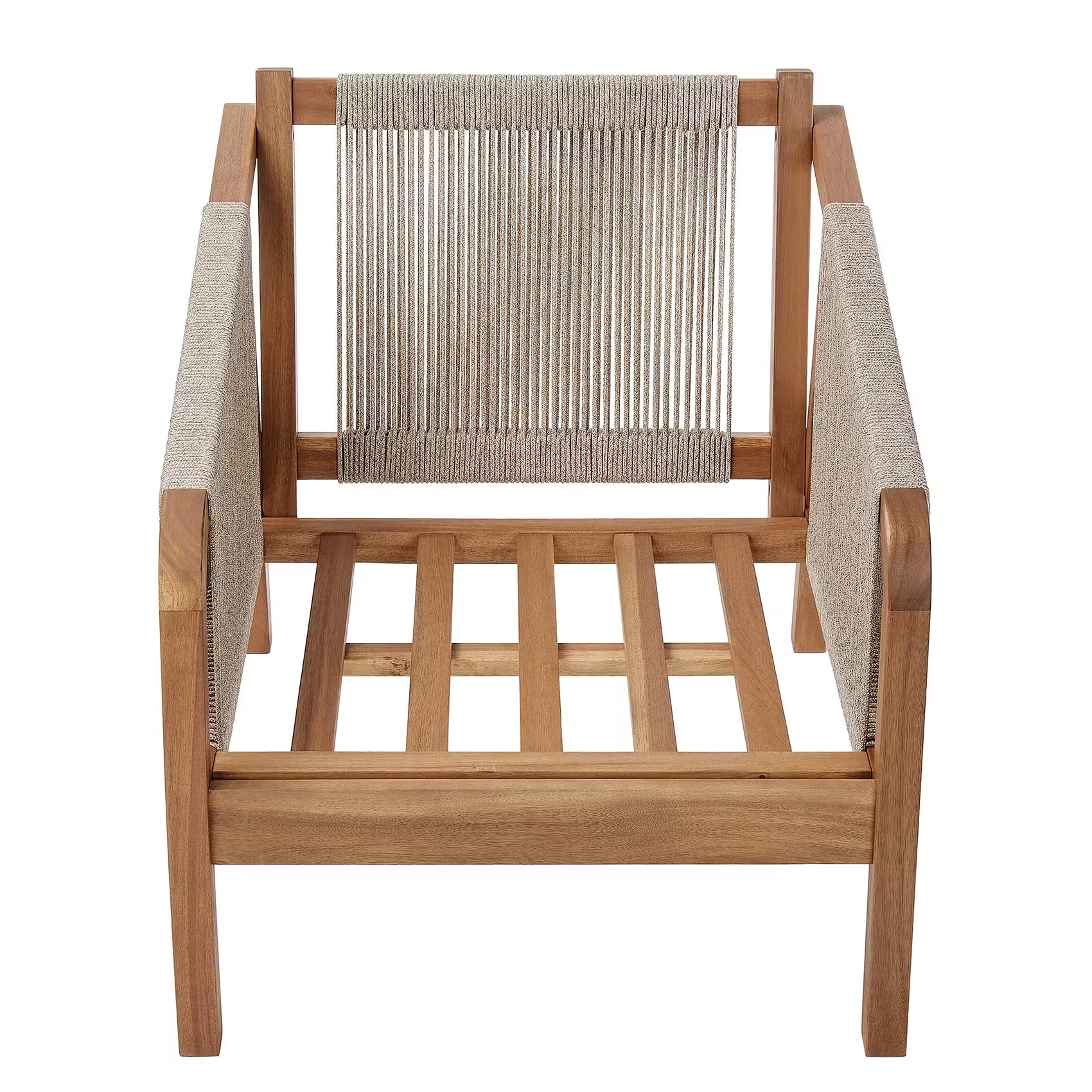 Natürliche Farben, echtes Akazienholz und angesagte Rope-Schnüre an den Armlehnen und im Rücken: Der Rope Island Loungeset mit 2 Outdoor-Sesseln und 2 Beistelltischen hat alles, was die Warmwettersaison auf der Terrasse oder auf dem Balkon noch schöner macht. Für ein hohes Maß an Sitzkomfort sorgen bei den Sesseln die gemütlichen Polster, die sich dank Reißverschluss einfach abnehmen und bei Bedarf von Hand waschen lassen. Die runden Beistelltische aus Akazienholz begeistern mit ihrer schlichten Form und dem warm schimmernden Holzton. So gestalten Sie mit diesem Set für 2 Personen Ihre persönliche Komfortzone im Freien.