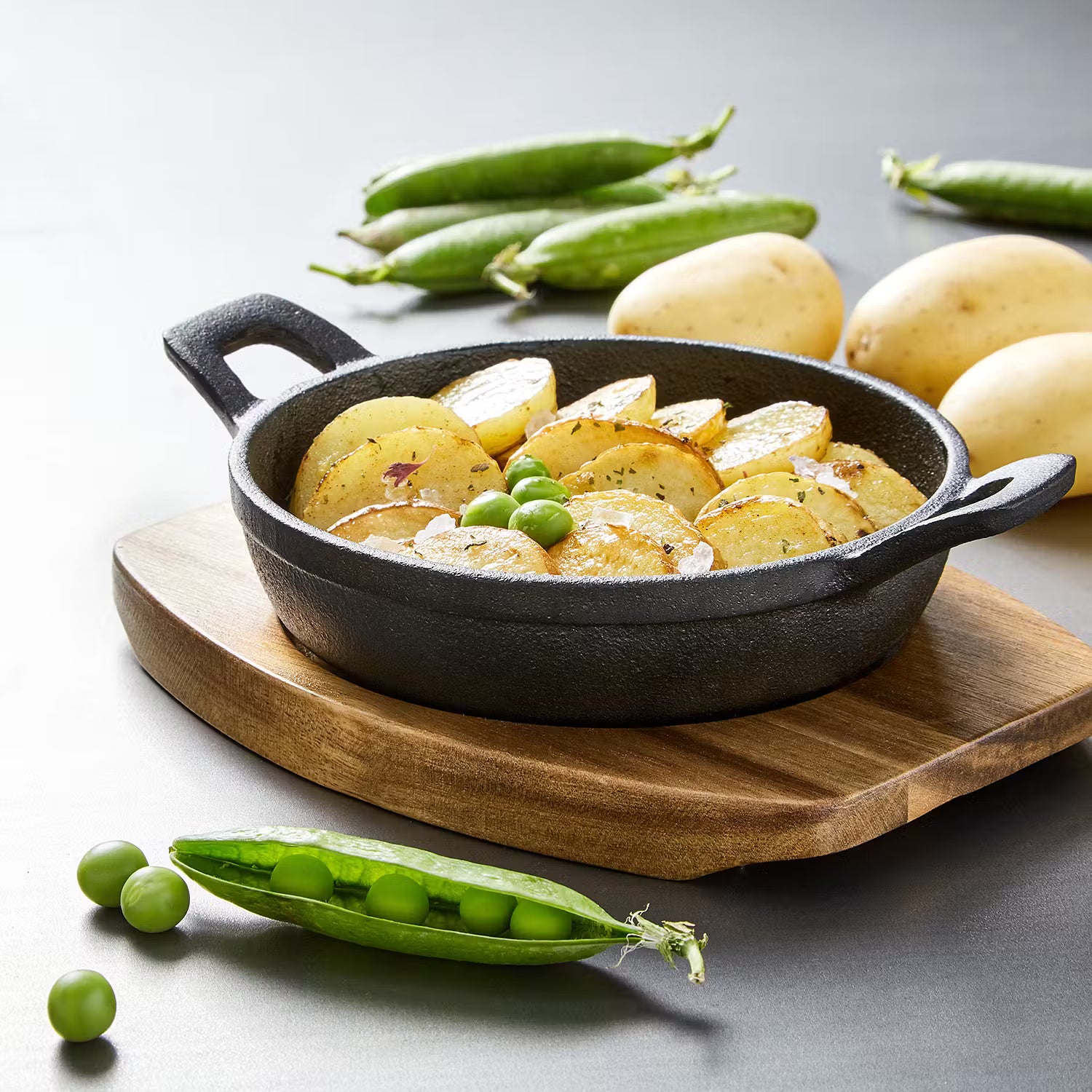 Achtung, heiß und fettig! Mit der Hot Iron Servierpfanne servieren Sie Ihre Gerichte so warm wie sie gekocht wurden. Als hätten Sie Steak, Käsespätzle oder Bratkartoffeln frisch vom Herd auf den Tisch gestellt. In der schwarzen Gusseisenpfanne bleiben Ihre Speisen länger warm und dank der auf der Unterseite angebrachten Servierplatte aus Akazienholz ist Ihr Tisch vor Hitzeschäden geschützt. Bon Appetit!