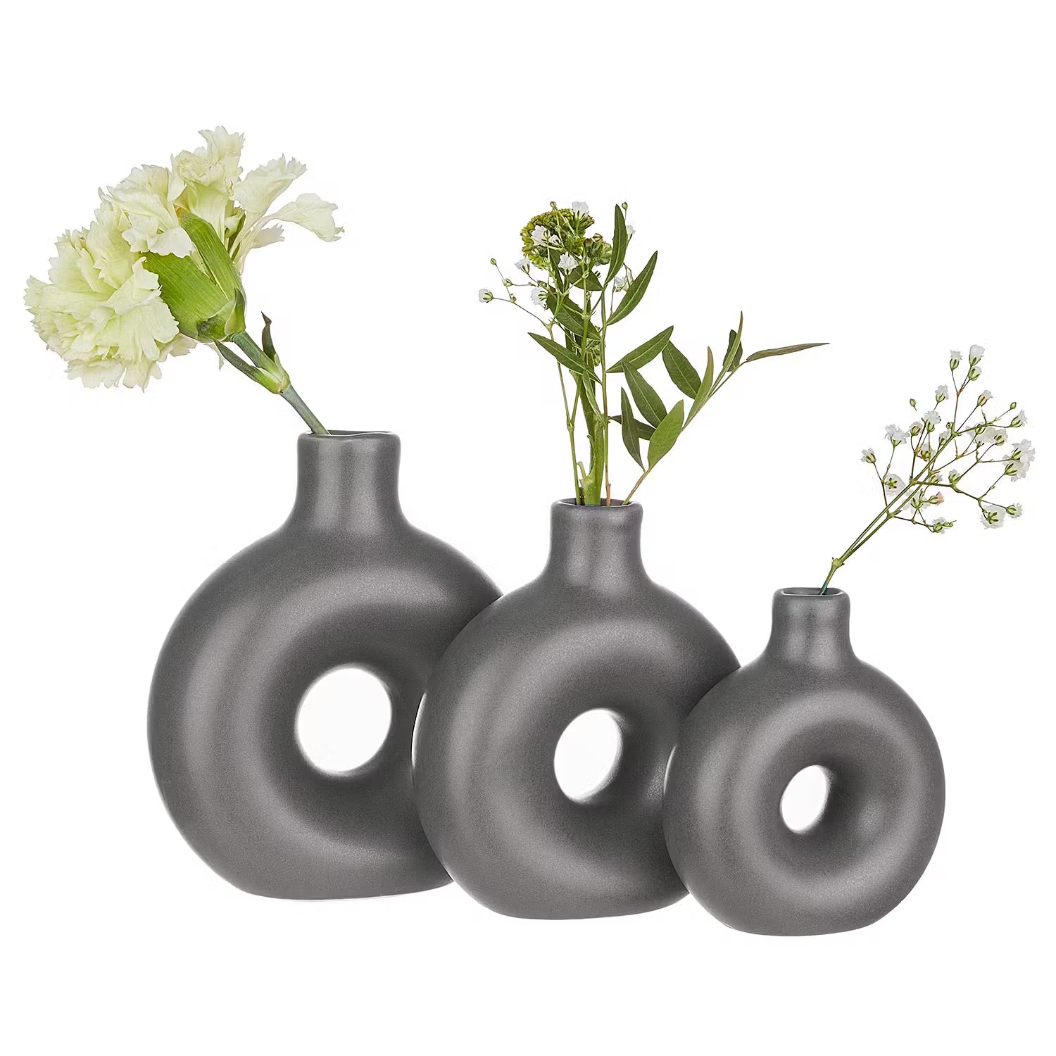 Wenn eine bestimmte Vasenform gerade in keinem modernen Zuhause fehlen darf, dann diese: Die Loopy Mini Vase im 6er-Set erinnert ein wenig an einen Donut, und vielleicht finden wir sie genau deshalb so süß. Als kleine Keramik-Vase eignet sie sich ideal, um z.B. auf dem gedeckten Tisch oder auf einem Deko-Tablett Akzente zu setzen, gerne auch im Mix verschiedener Farben und Größen. Dafür gibt es die Loopy Vasen in Beige, Hellgrau, Rosa und Anthrazit - jeweils in drei Größen.