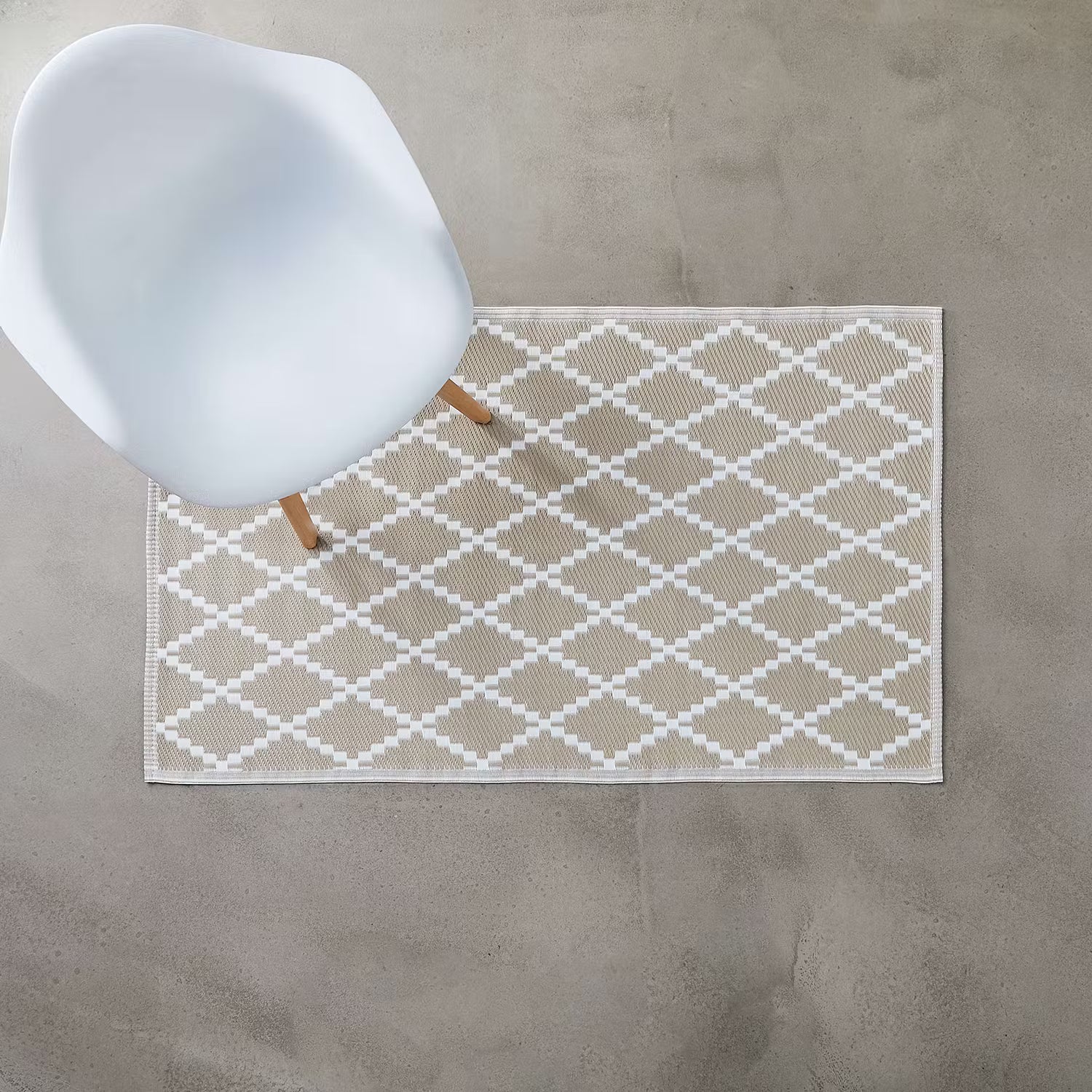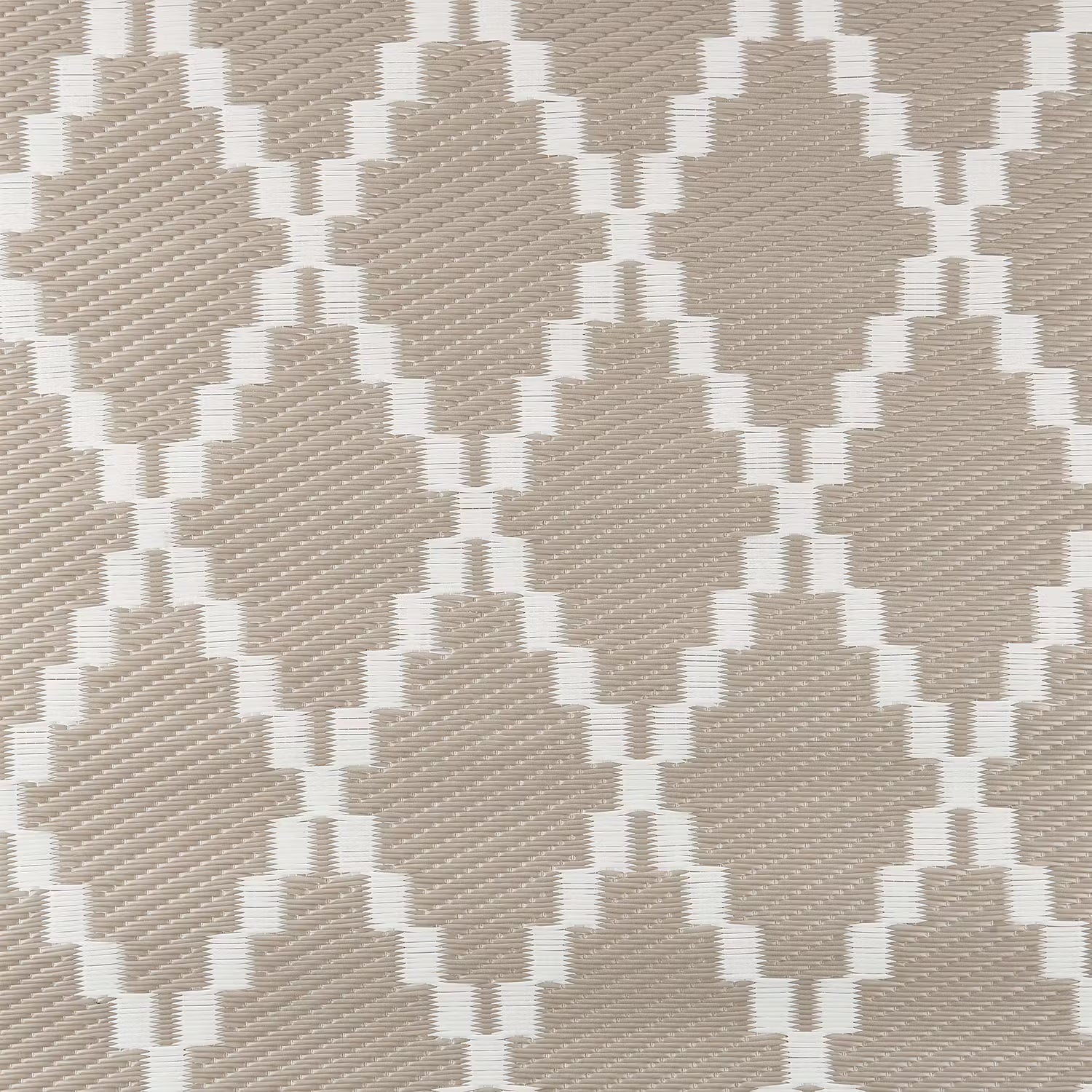 Der Teppich bringt eine ruhige und entspannte Atmosphäre in jeden Raum oder Außenbereich. Sein neutrales Farbkonzept und das moderne Rauten-Muster passen zu vielen Einrichtungsstilen, von minimalistisch bis rustikal, und verleihen deinem Zuhause oder Garten einen Hauch von Eleganz und Komfort.