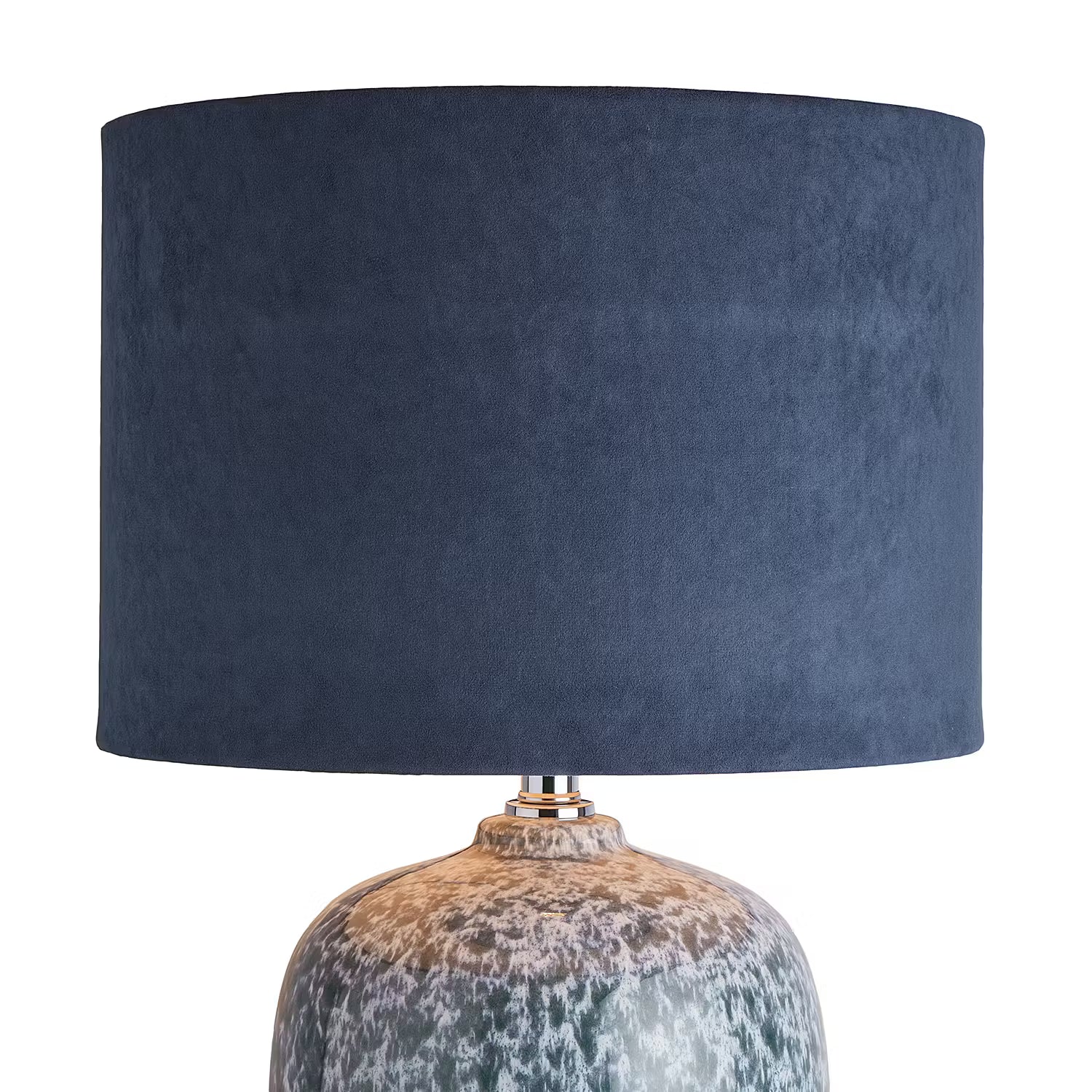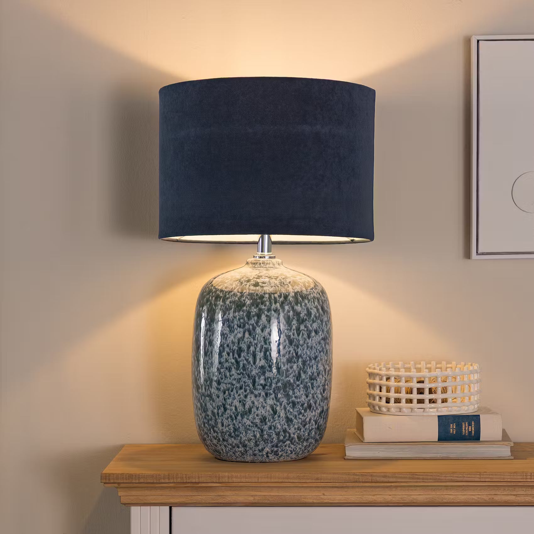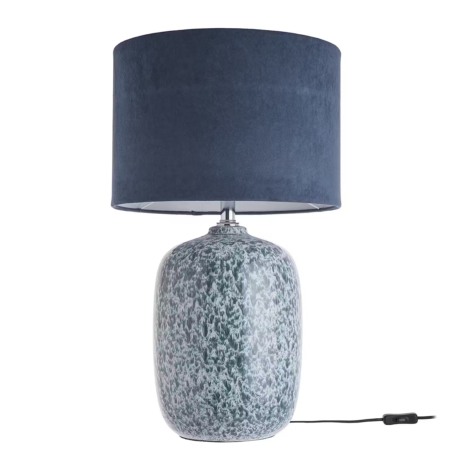 Mit deinem maritimen Zuhause oder deiner nordisch inspirierten Einrichtung harmoniert die hochwertige Seaside XL Tischleuchte in Blau. Die fast 70 cm hohe und damit optisch beeindruckende Tischlampe setzt beim Fuß auf eine gesprenkelte Keramik, die an dunkles Meer und weiße Gischt denken lässt. Der Lampenschirm ist in blauem Cord gehalten, wodurch ein wohnlicher Effekt entsteht. Diese Tischleuchte zieht auch als Einzelstück alle Blicke auf sich, z.B.. auf einer Kommode oder einem Beistellstisch präsentiert.