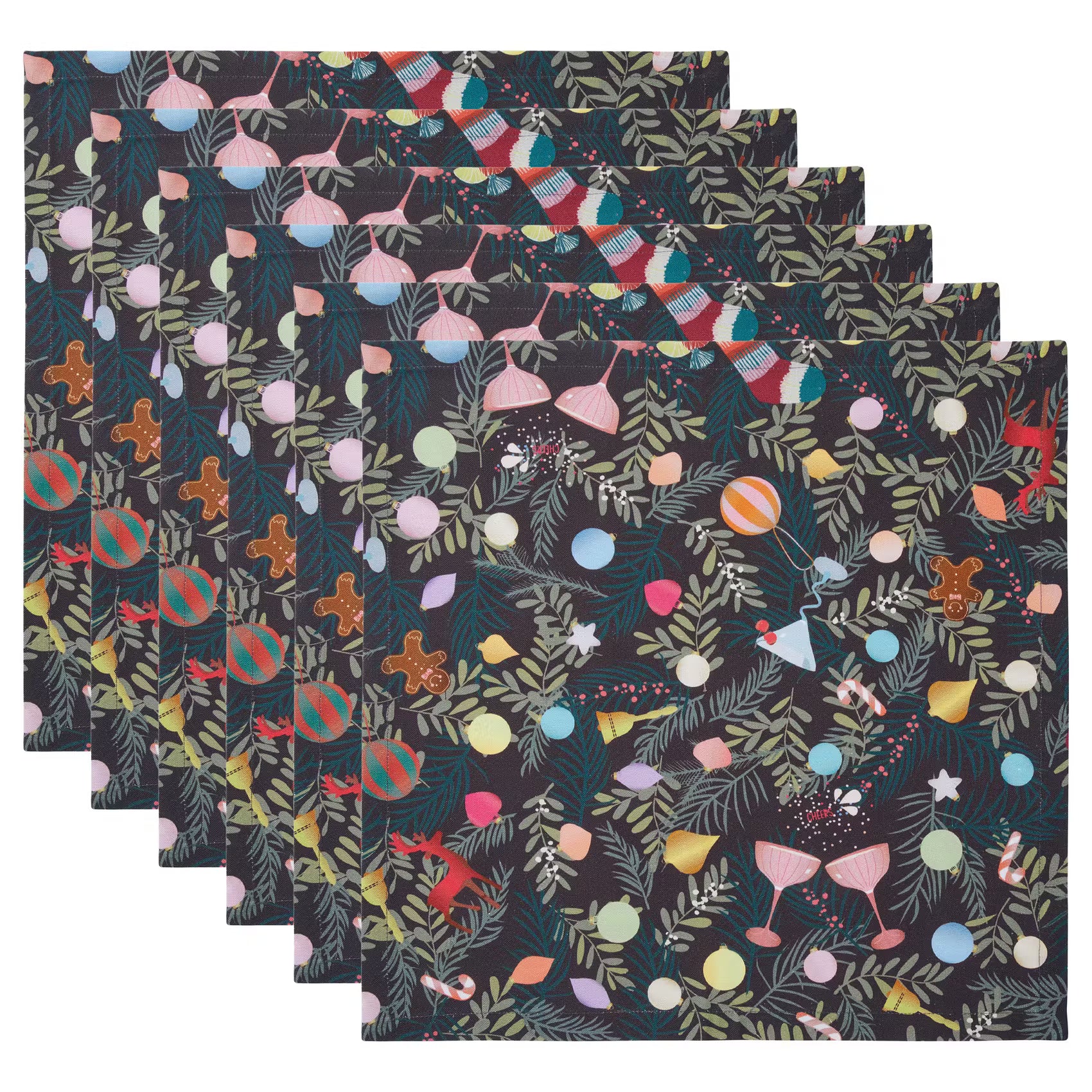 Zuckerstangen, Sterne, Glöckchen und noch vieles mehr: Jede Menge gute Weihnachtslaune tummelt sich auf der Christmas Cheers Serviette 42 x 42 cm aus reiner Baumwolle. Ebenso wie das Dessin ist bei dieser Tischwäsche auch die Mischung aus dunklem Untergrund und farbenfrohen Elementen wunderbar auf die Jahreszeit abgestimmt - für den hübsch gedeckten Tisch im Advent und zur Weihnachtszeit. Tischdecke in weiteren Größen erhältlich, zudem gibt es passende Tischläufer.