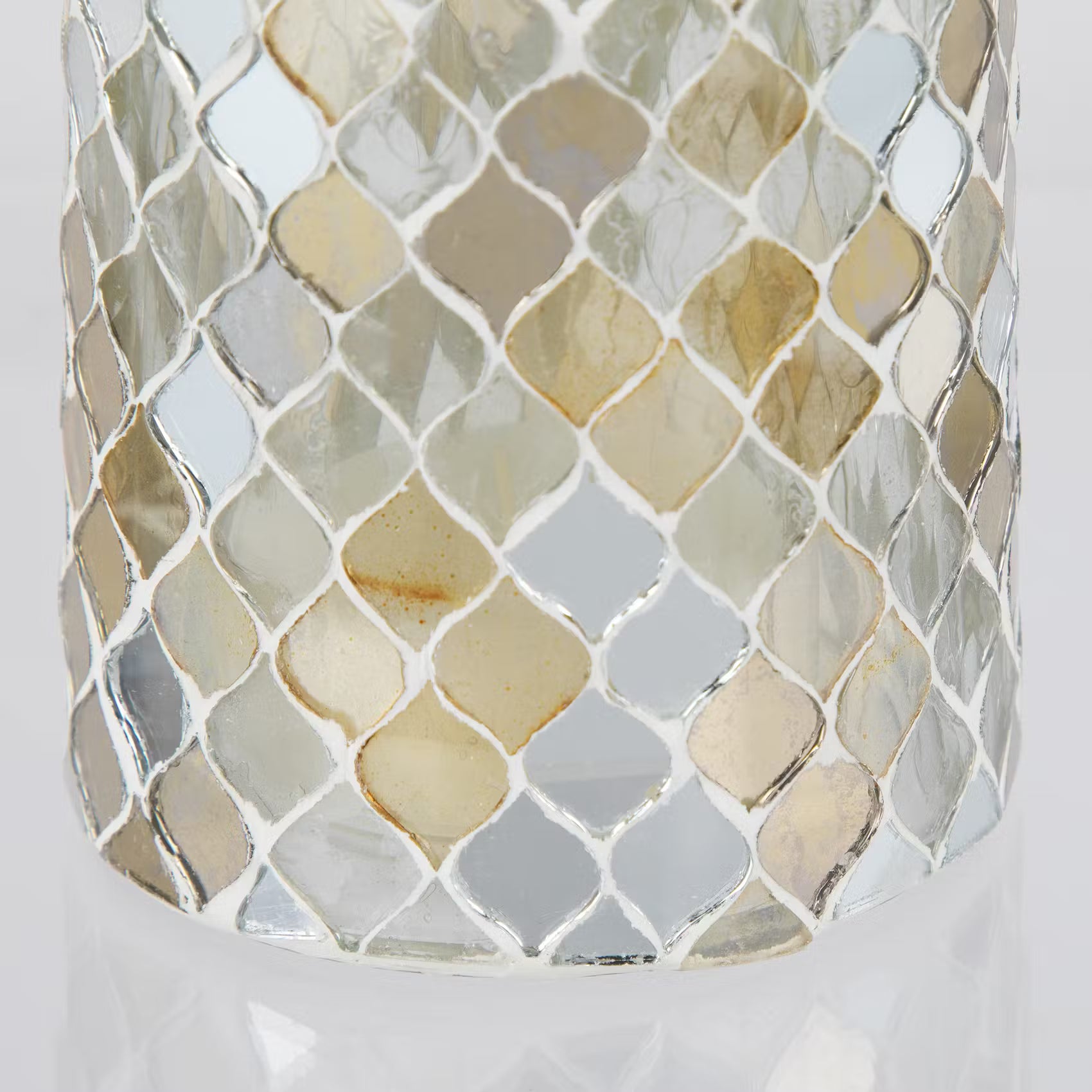 Das cremefarbene Shimmer & Shine Windlicht Mosaik aus Glas hat einen funkelnden Sinn für Romantik - auf dem gedeckten Tisch ebenso wie als Deko im Wohn- oder Schlafzimmer. Denn seine strukturierte Oberfläche spielt stimmungsvoll mit dem Kerzenlicht.