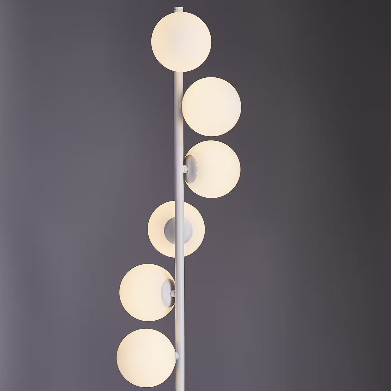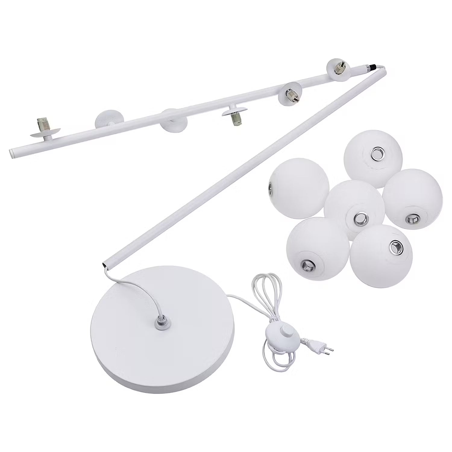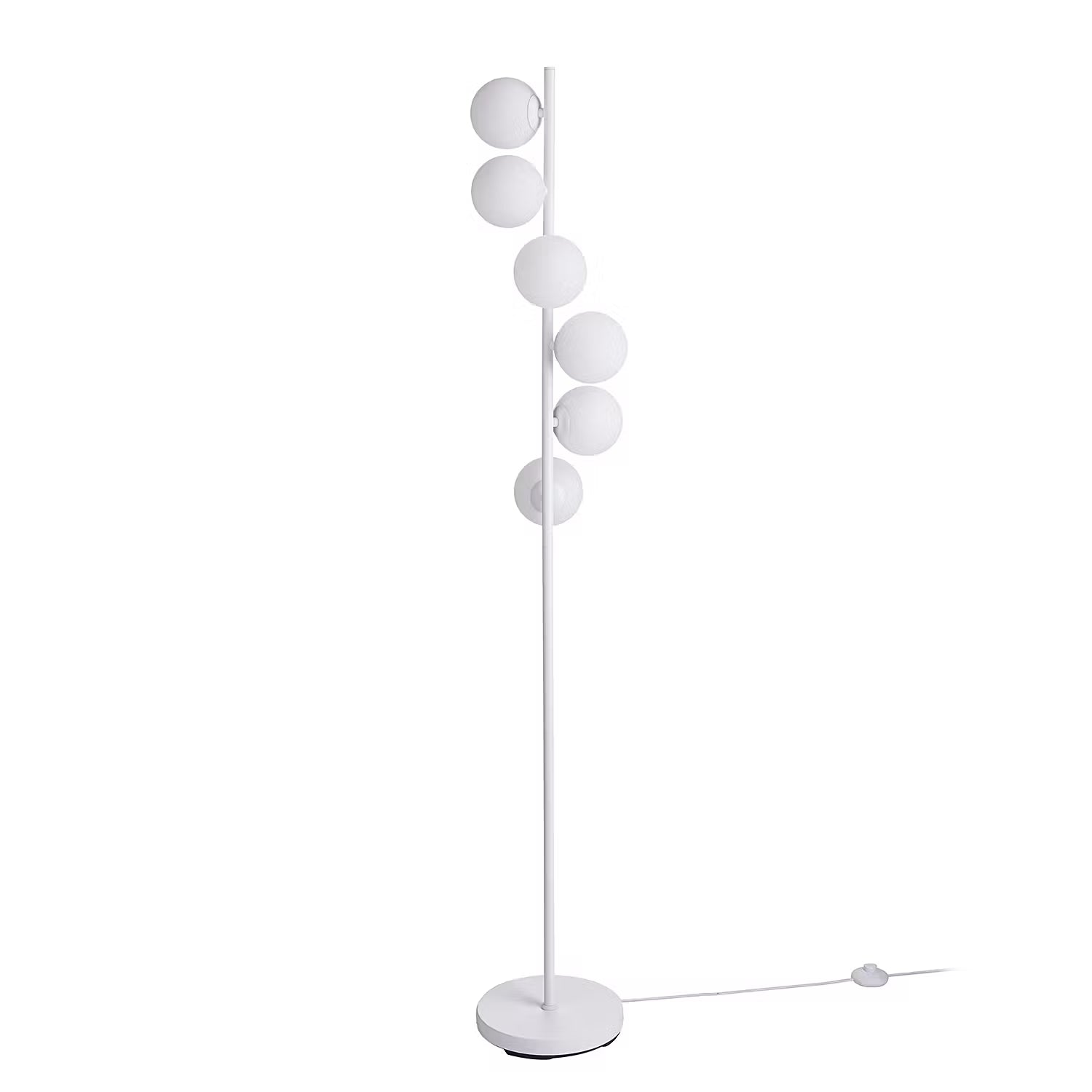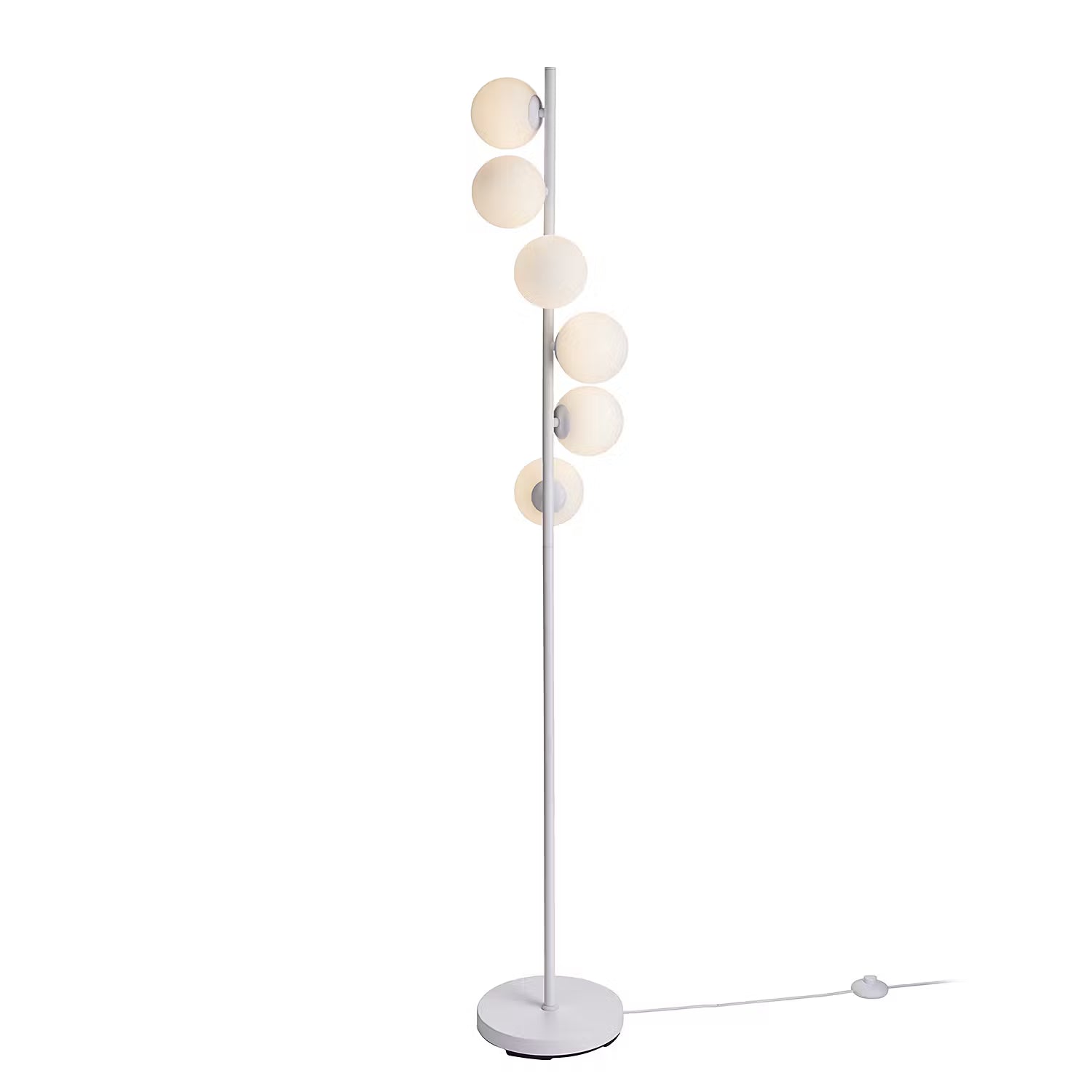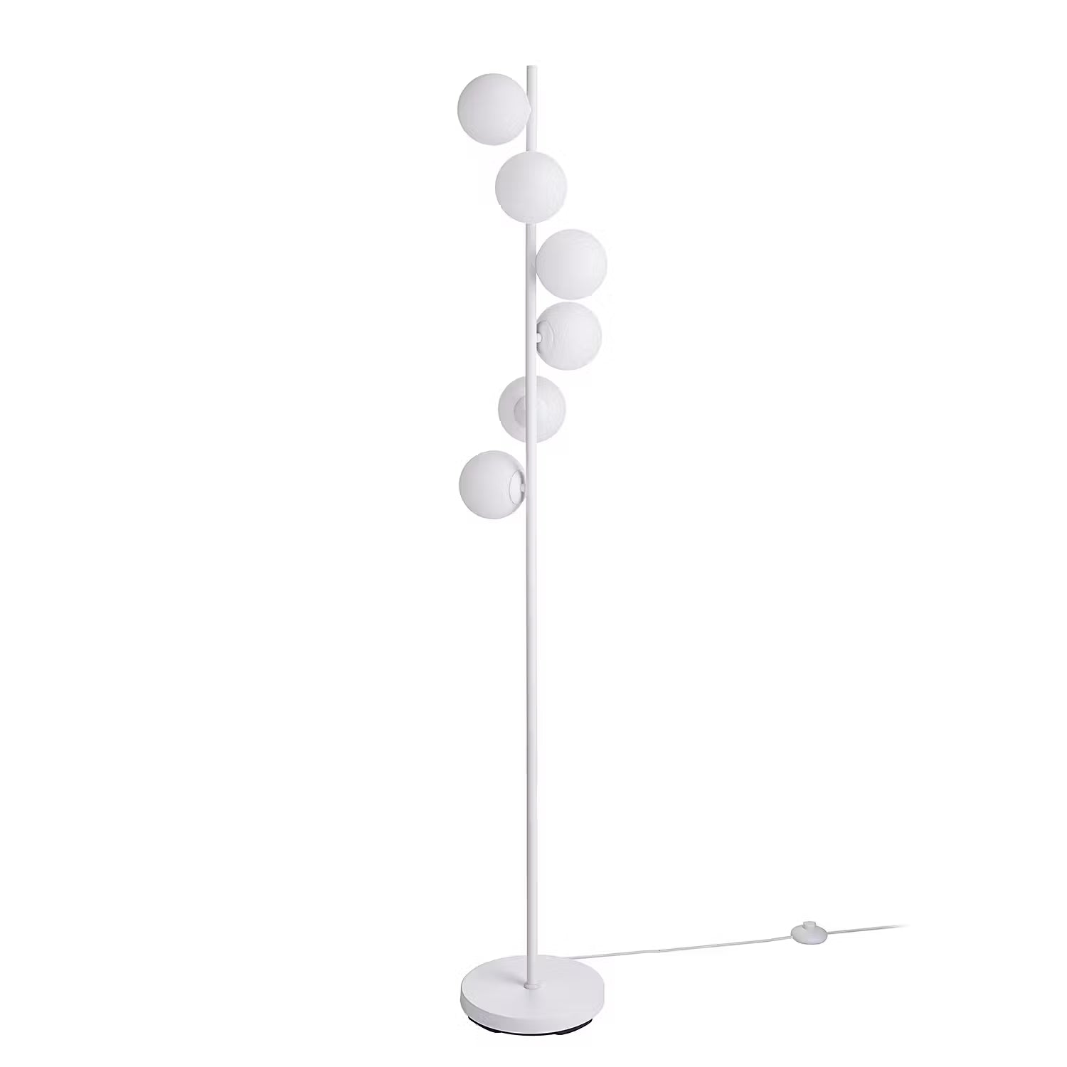 Die 60er und 70er Jahre feiern ein stylishes Comeback mit der Vetle Stehleuchte 6-flammig in Weiß. Typisch für diesen angesagten Leuchtentrend sind die weißen Glaskugeln, auf unterschiedlichen Ebenen angeordnet an einem Metallstab. Dazu ein runder Leuchtenfuß und ein weißes Textilkabel - fertig ist das lässige It-Piece für dein angesagte Zuhause. Passende Tischleuchte erhältlich.