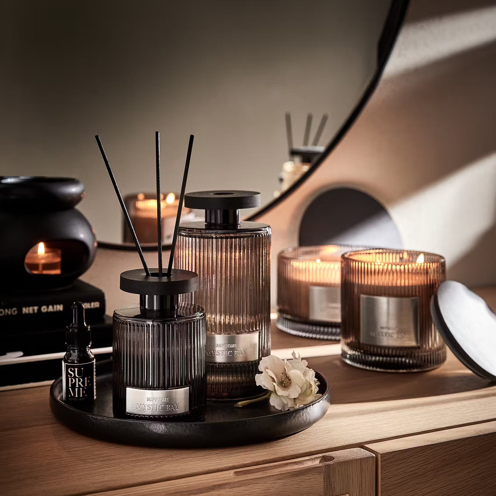 Edler Glasflakon und ein luxuriöser Duft: Mit dem Supreme Raumduft Mystic Bay verwandelst du jeden Raum in ein sinnliches Erlebnis, voller Kraft und Raffinesse. Die edle Duftwelt ist geprägt von rauchiger Eleganz, würziger Frische und subtiler Blumigkeit. Ein Hauch von Abenteuer schwingt in jedem Akkord mit, wie eine kühle Brise in einer mond-beschienenen Bucht. Für besondere Verträglichkeit nutzt dieser hochwertige Raumduft eine wasserbasierte Formel, die als sehr mild gilt. Inklusive Fibre Sticks aus Polyester für eine gleichmäßige Aroma- und Duftaufnahme. Erhältlich als Raumduft und Duftkerze, jeweils in zwei Größen.