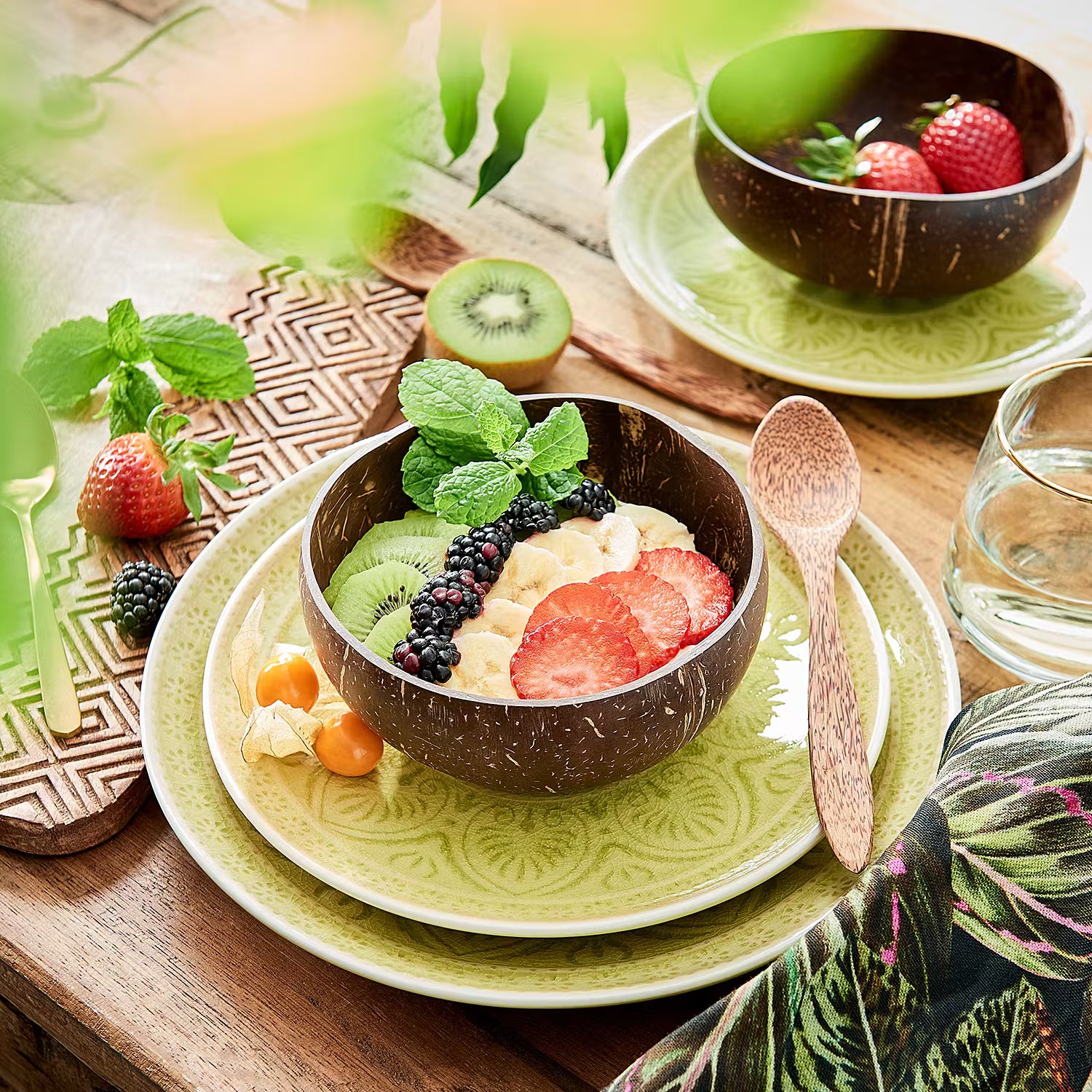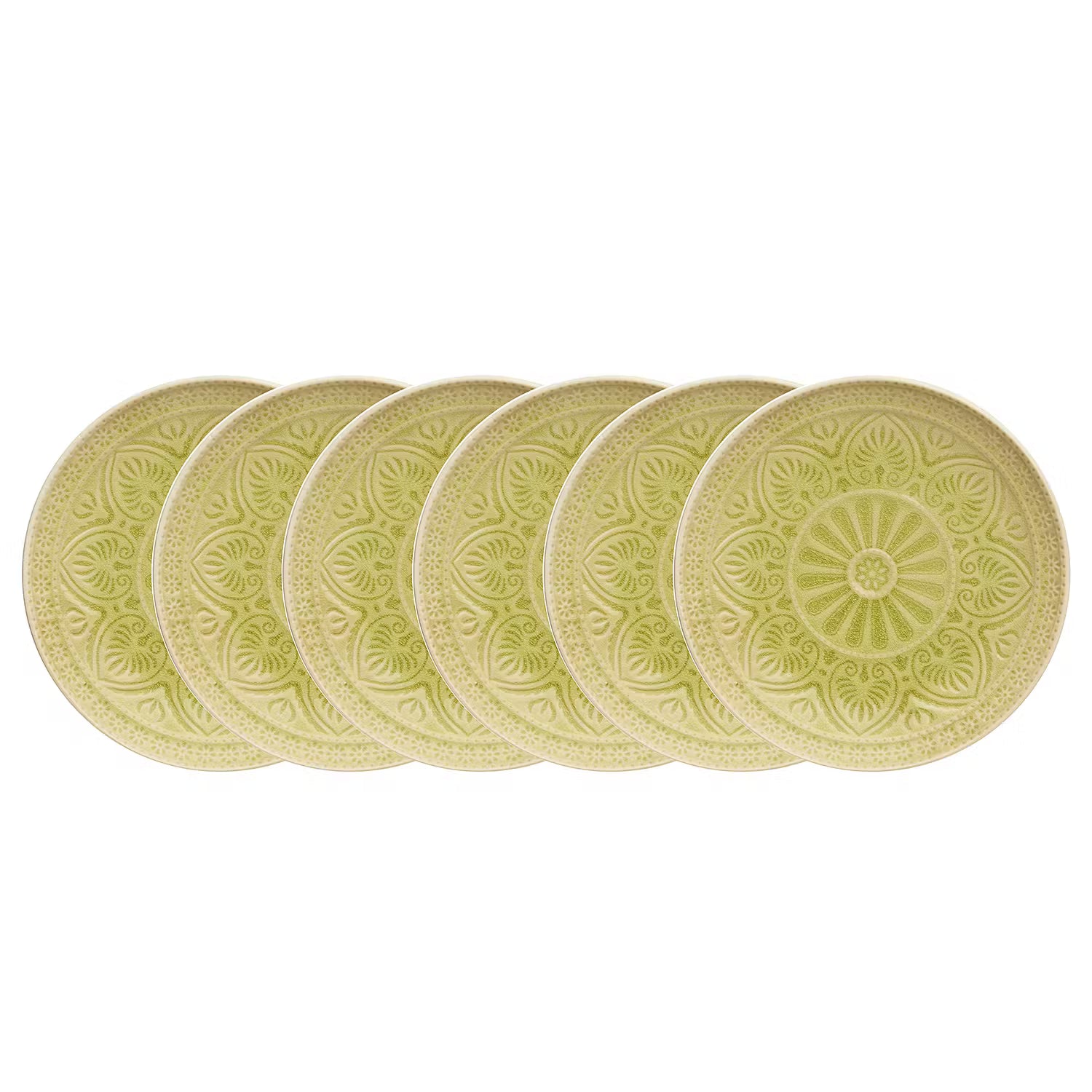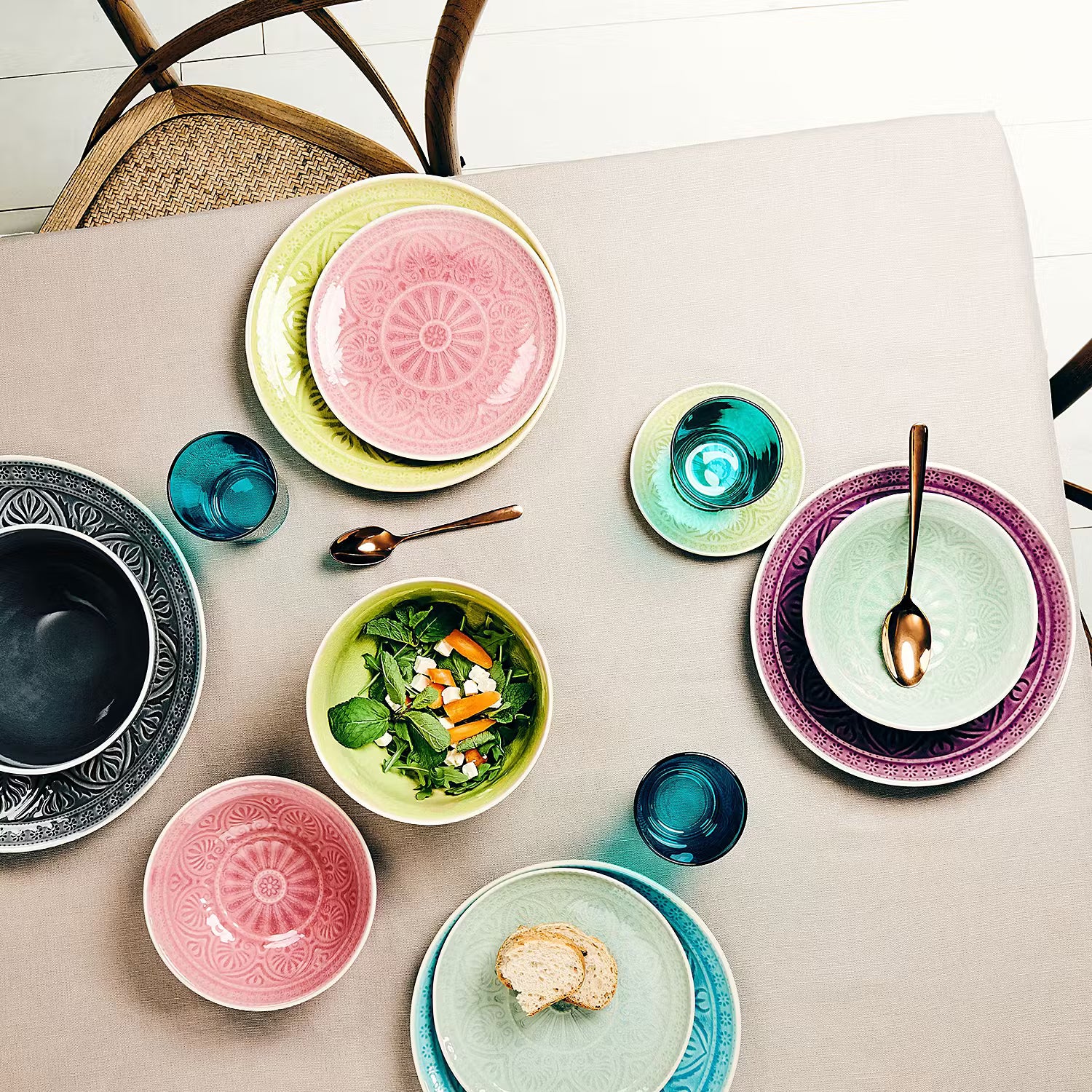 Der prächtige, asiatische Sumatra Teller im 6er-Set mit einem Durchmesser von 21 cm und traditionellem Dekor mit effektvoll glänzender Glasur. Der große Speiseteller aus Steinzeug ist ein echter Blickfang auf Ihrem gedeckten Tisch. Die kostbare Optik des bunten Tellers bietet einen feinen Kontrast zu den sehr scharf gewürzten Speisen, die man traditionell auf der Insel Sumatra reicht.