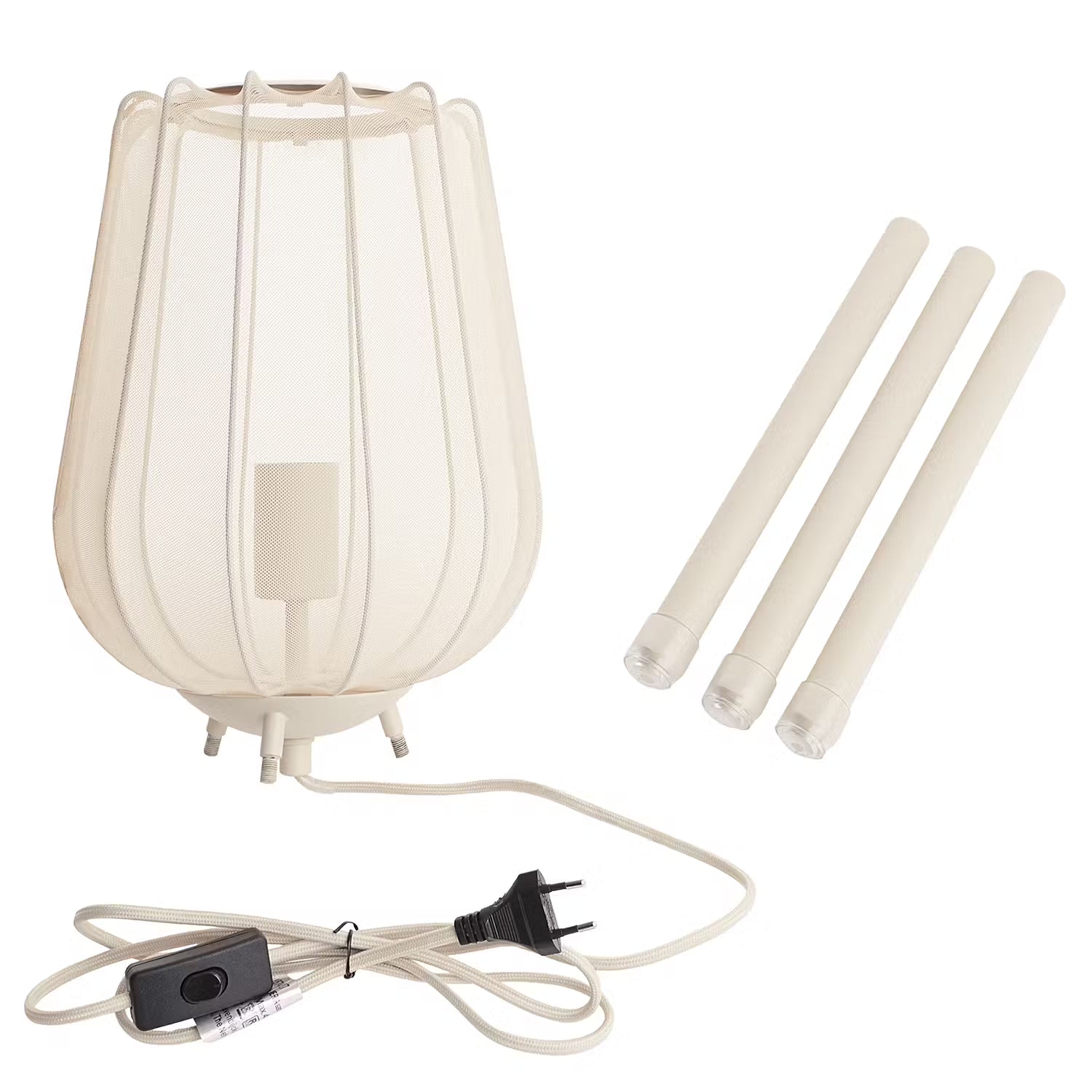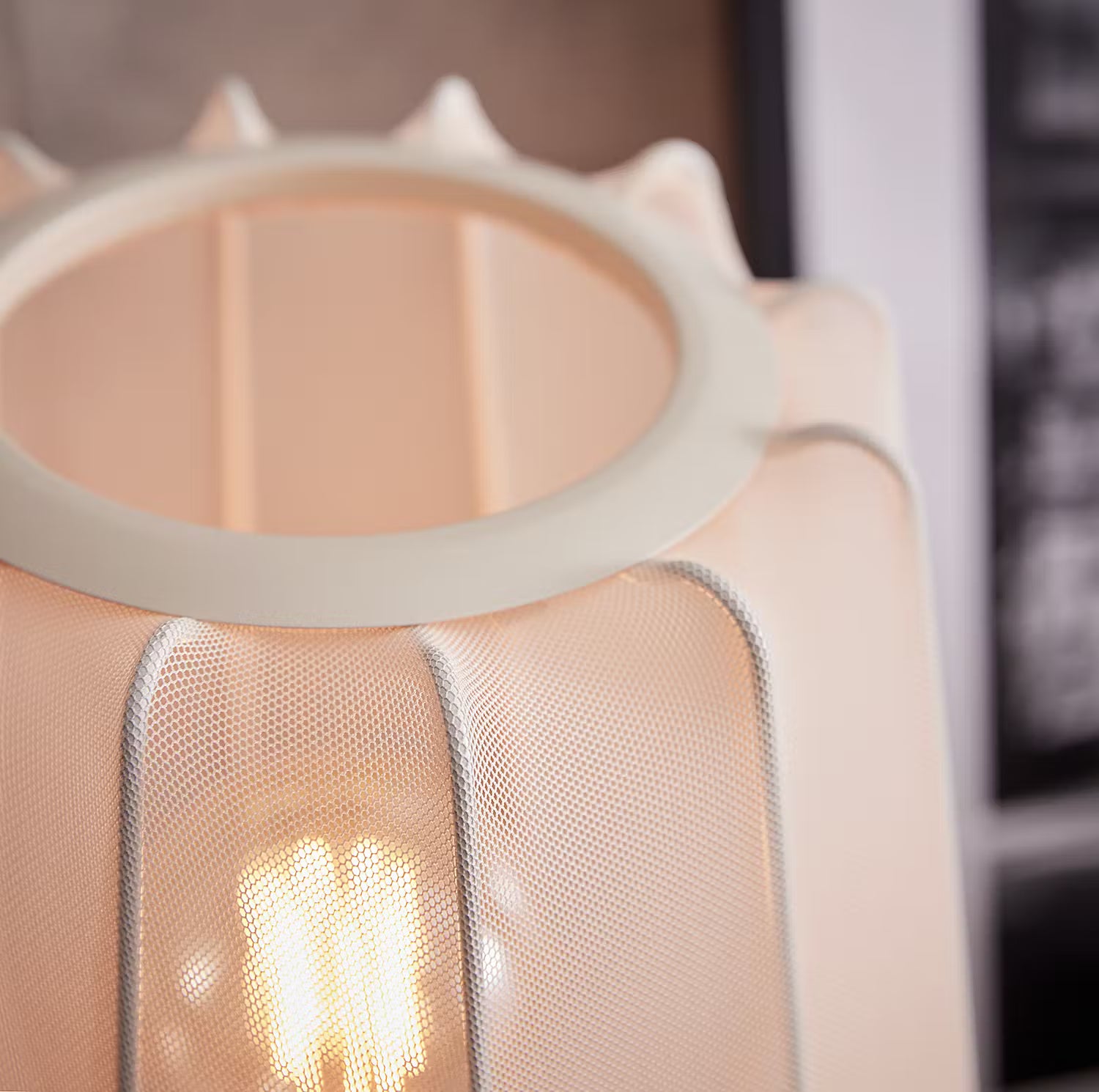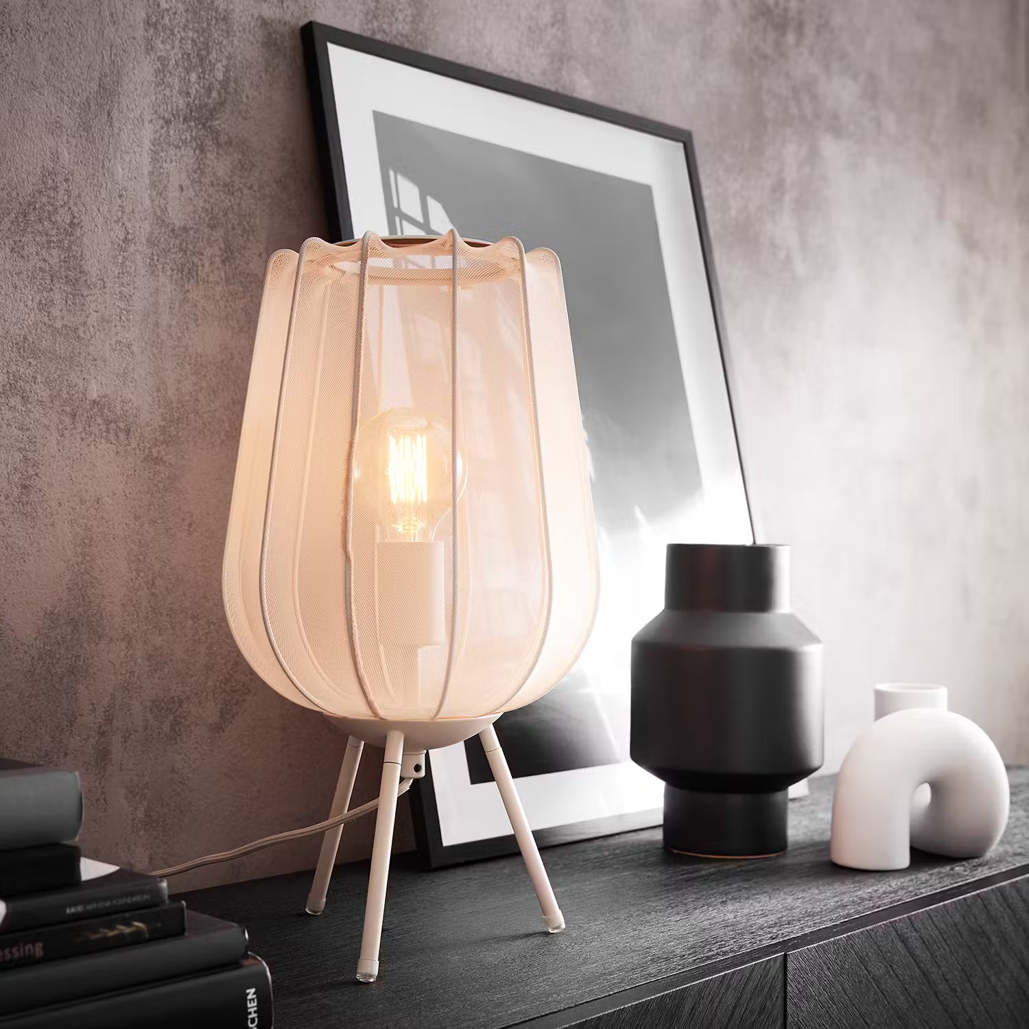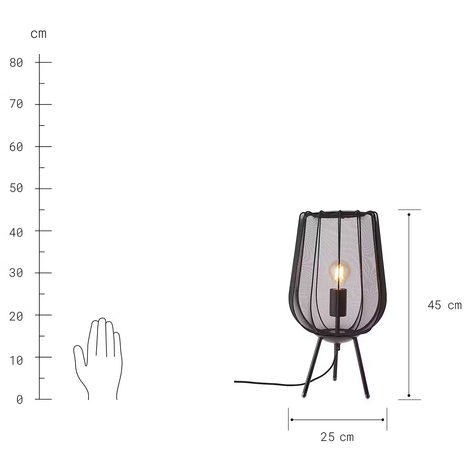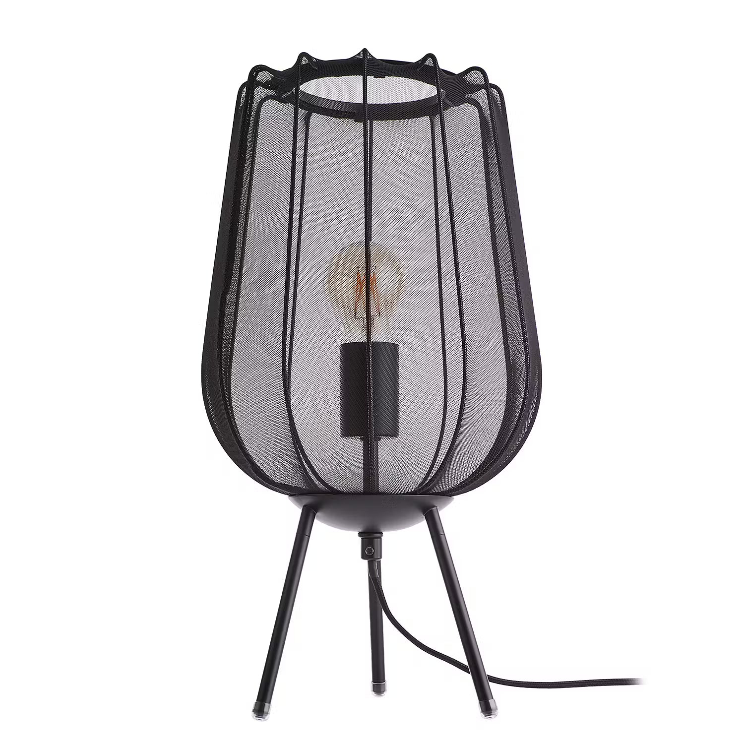 Ein Hauch von Extravaganz umgibt die moderne Amal Tischleuchte. Ihr hoher, geschwungener Schirm ist mit einem transparentem Netzgewebe überzogen und thront auf drei Beinen aus Eisen. Gerade diese Verbindung von exklusivem Design und hochwertiger Materialauswahl verleiht der Tischleuchte eine fast geheimnisvolle Ausstrahlung. In Creme und Schwarz erhältlich, auch als passende Stehleuchte und Hängeleuchte.