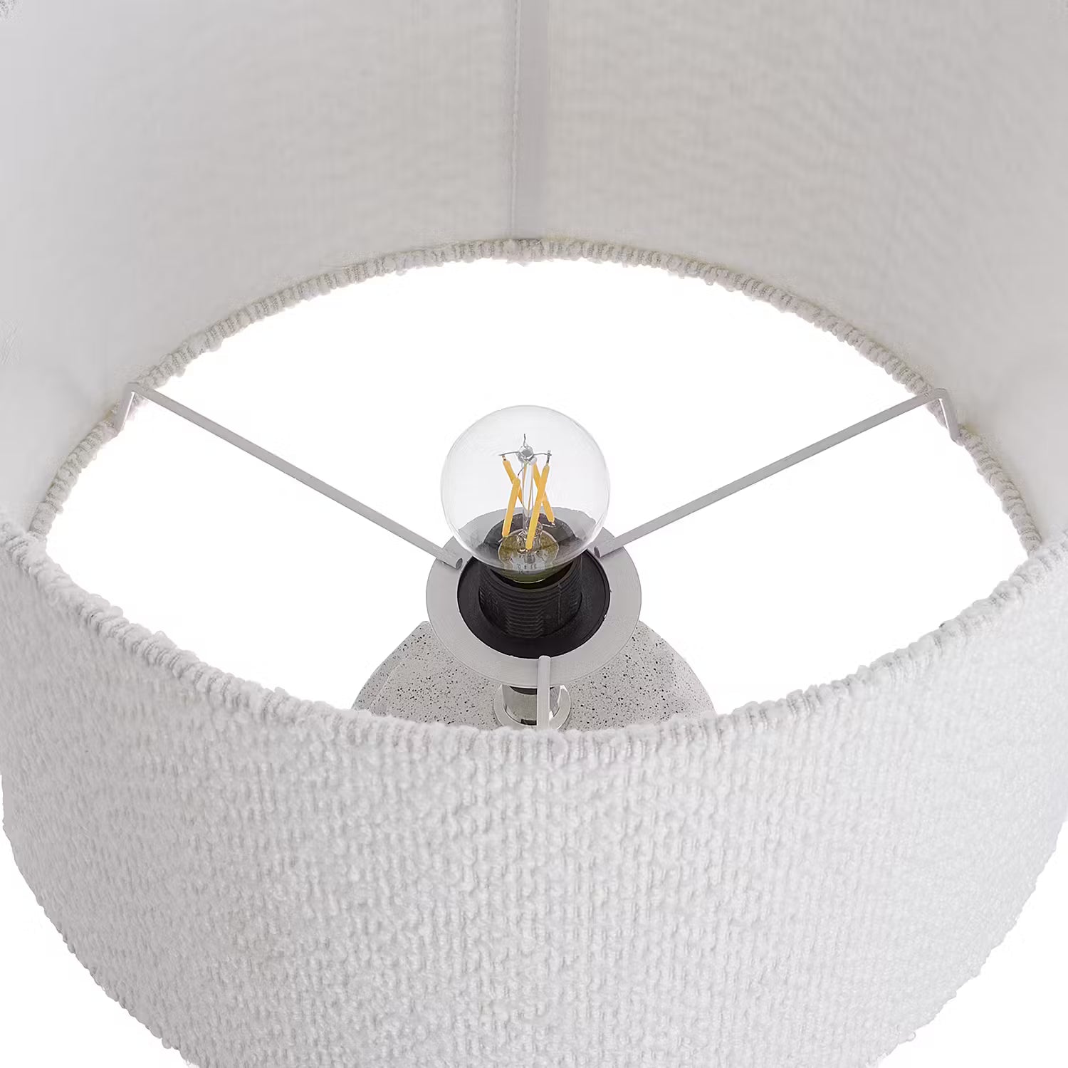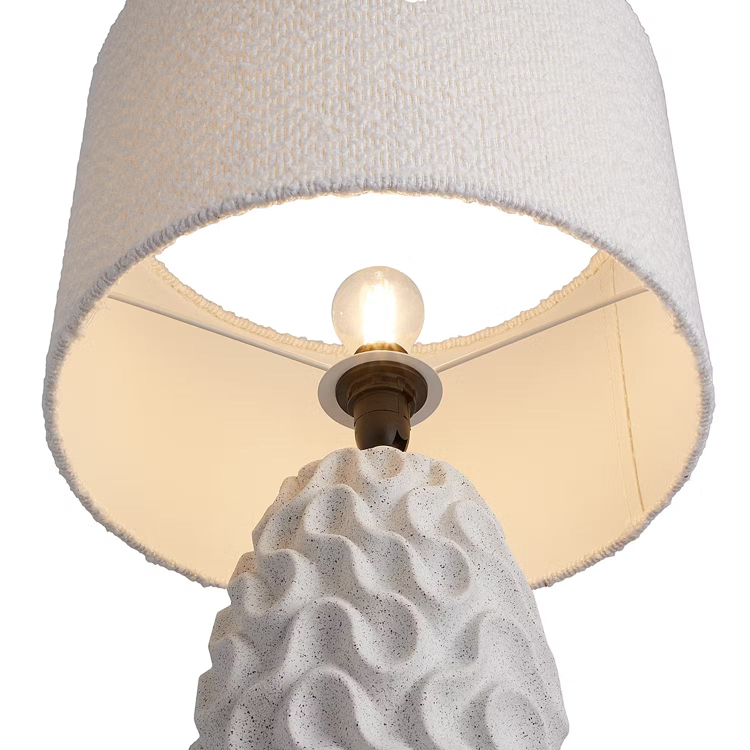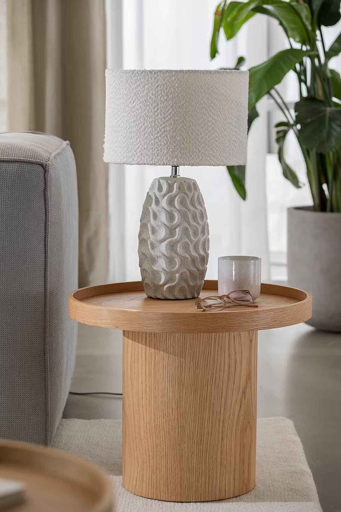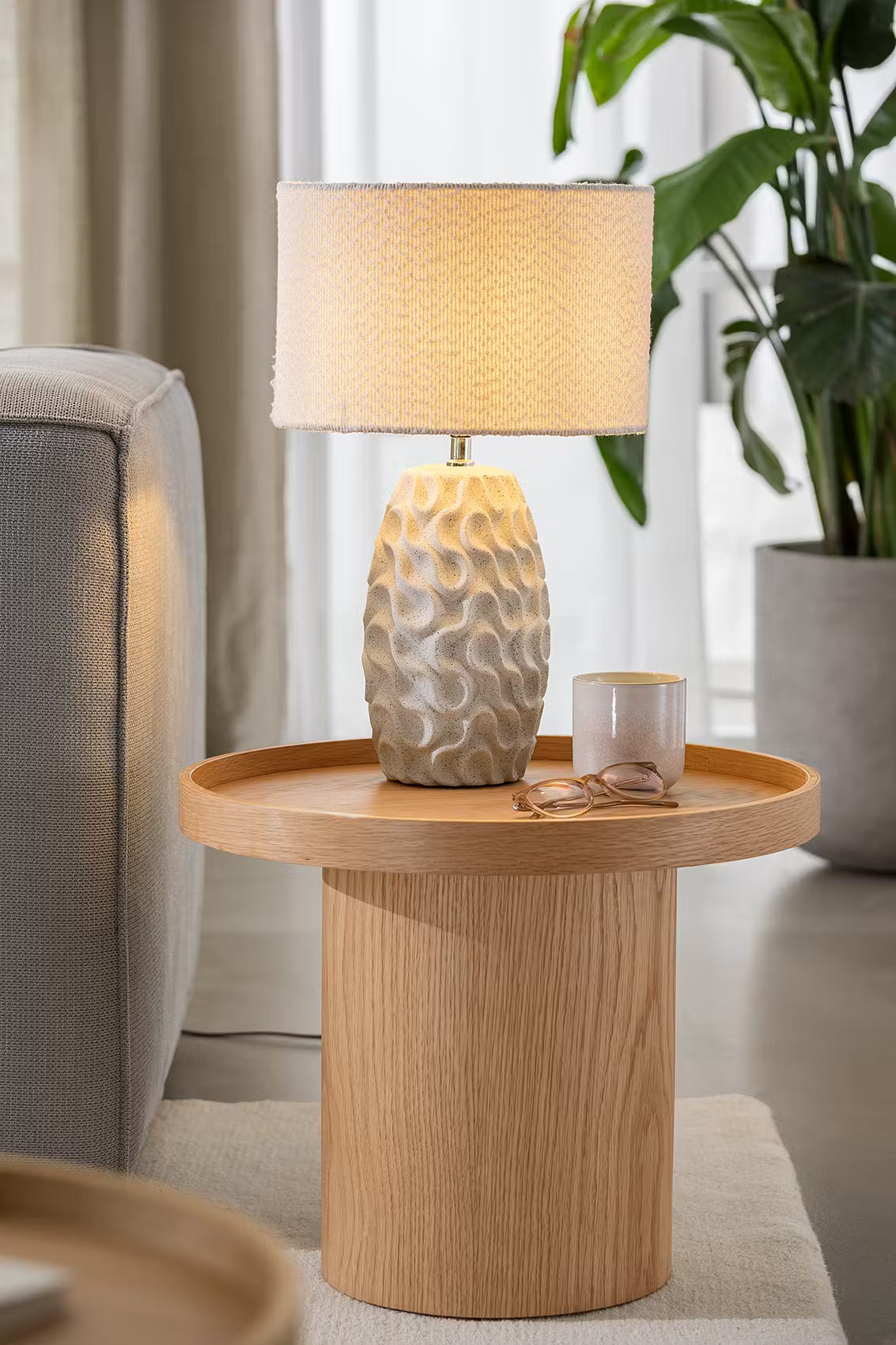 Keramik mit Wellenstruktur trifft strukturierten Boucléstoff: Bei der weißen Marlene Tischleuchte harmonieren unterschiedliche Strukturen und Materialien dekorativ miteinander. Damit passt die helle Tischlampe sowohl zum modernen Landhaus-Stil als auch zum natürlich gehaltenen Zuhause. Selbst in maritime Interieurs lässt sich diese Leuchte stimmig integrieren.