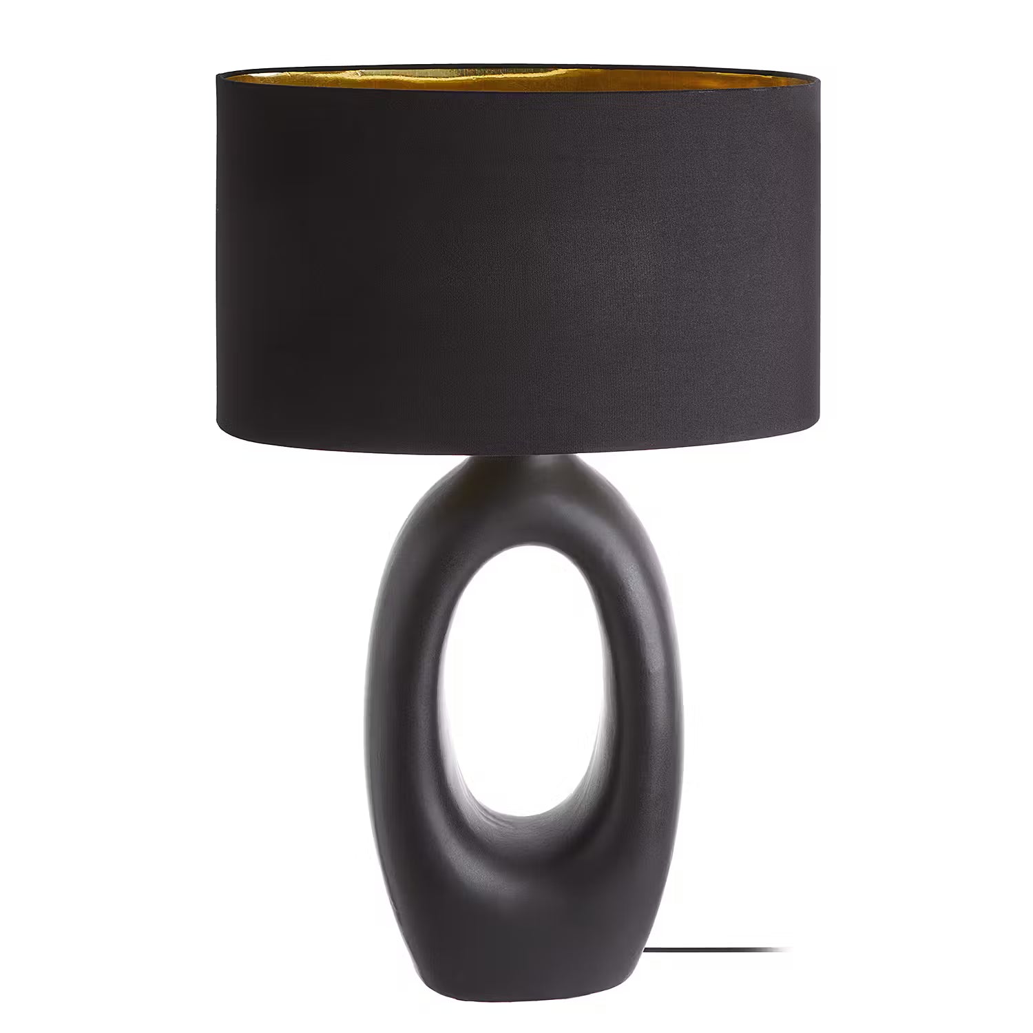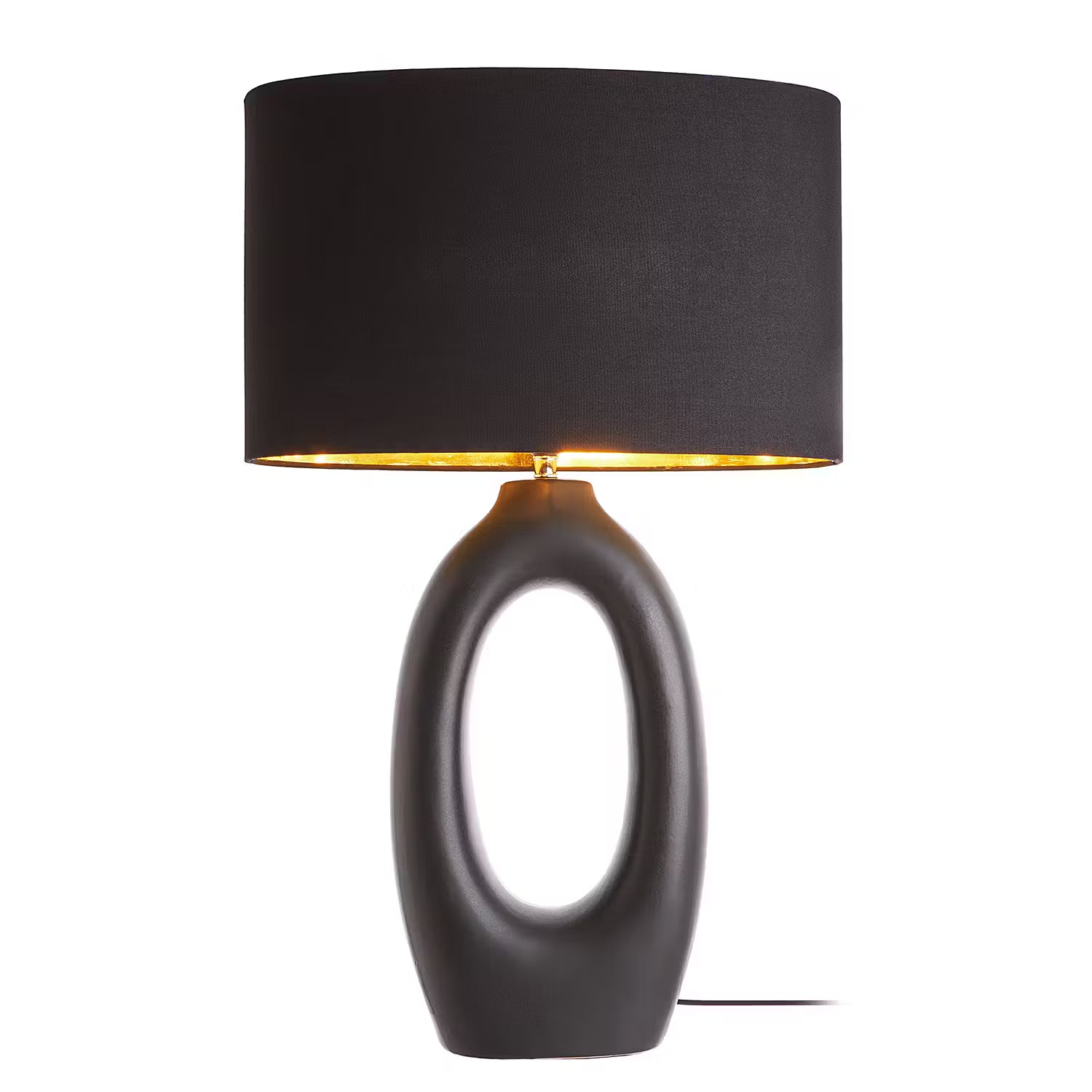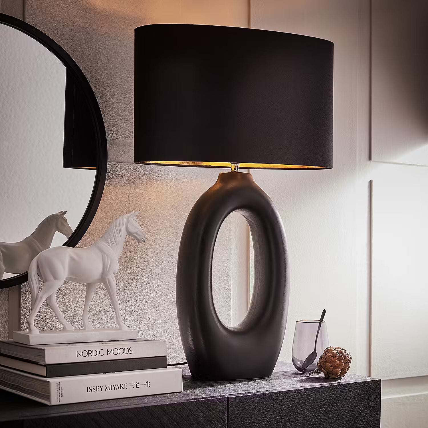 Black is beautiful bei der Mood Tischleuchte mit Lampenfuß in matt-schwarzer Keramik mit rauem Finish und Schirm in schwarzem Leinenstoff, von innen in Gold gehalten. Der Fuß dieser edlen Design-Leuchte erinnert von der Form her an eine Skulptur. Auf dem Tisch, auf Bestelltischen oder einem Sideboard setzt diese Lampe ein Zeichen und strahlt zugleich Ruhe aus.