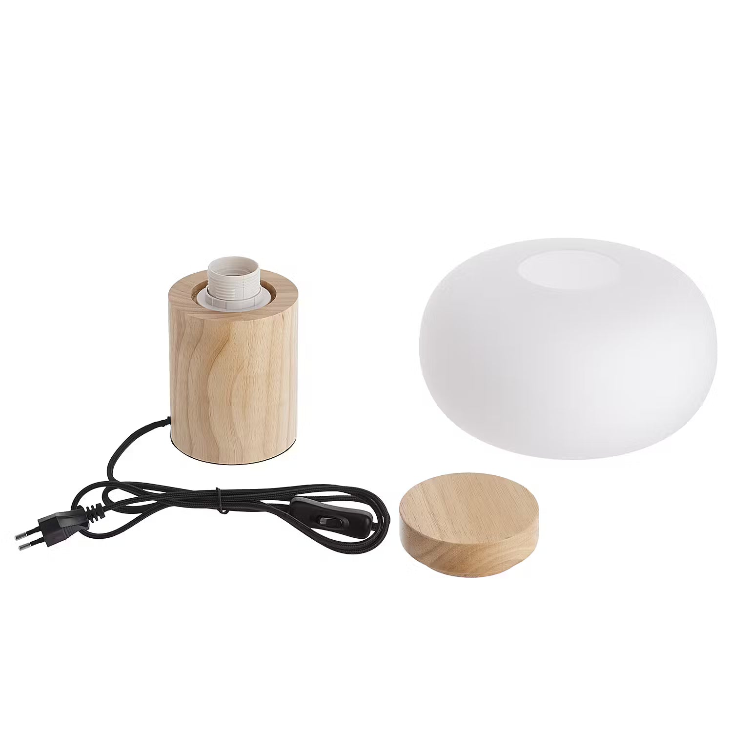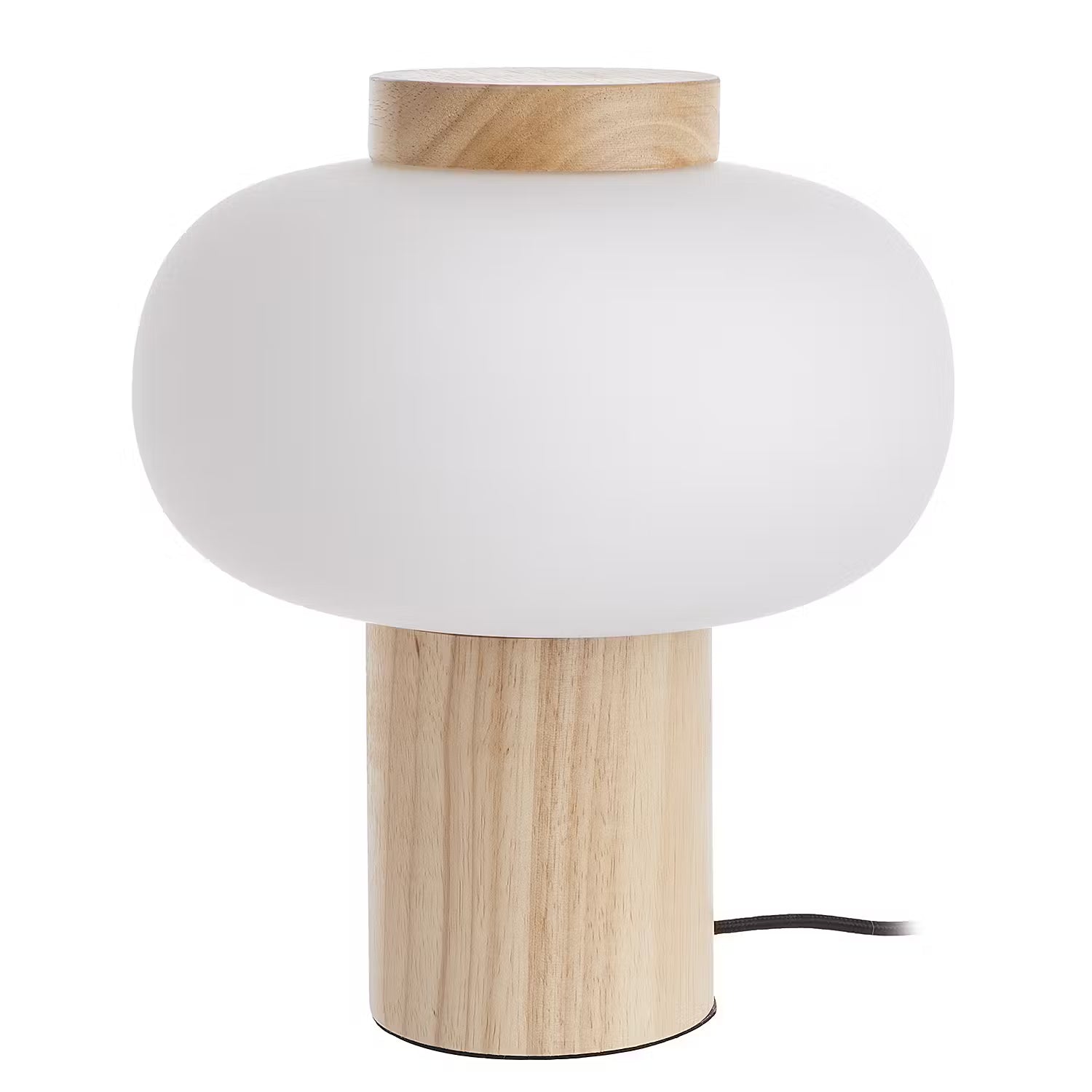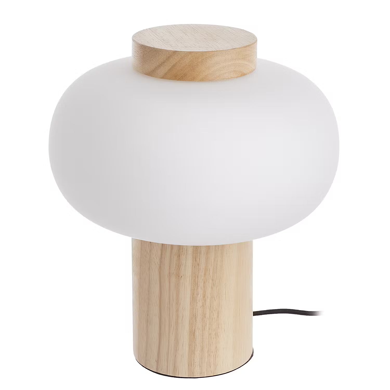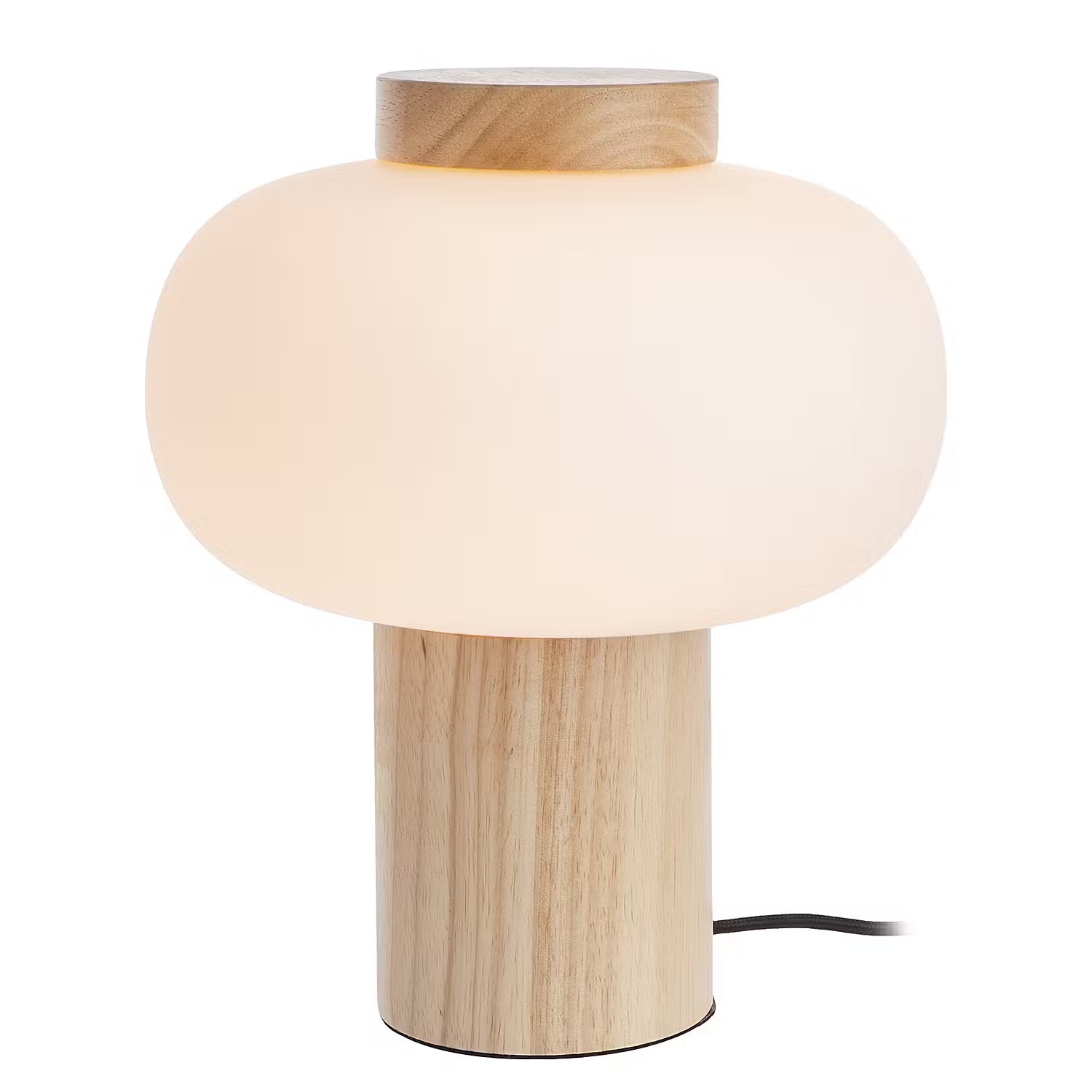 Weißes Glas trifft naturfarbenes Holz bei der modernen Taavi Tischleuchte, die mit Gummibaumholz, also einem nachwachsenden Rohstoff, hergestellt ist. Damit die Schönheit von Glas und Holz wirken kann, besinnt sich das Design auf klare, reduzierte Formen. So entsteht eine Tischlampe, die sich vielseitig kombinieren und nutzen lässt, z.B. im Wohnbereich oder Schlafzimmer.