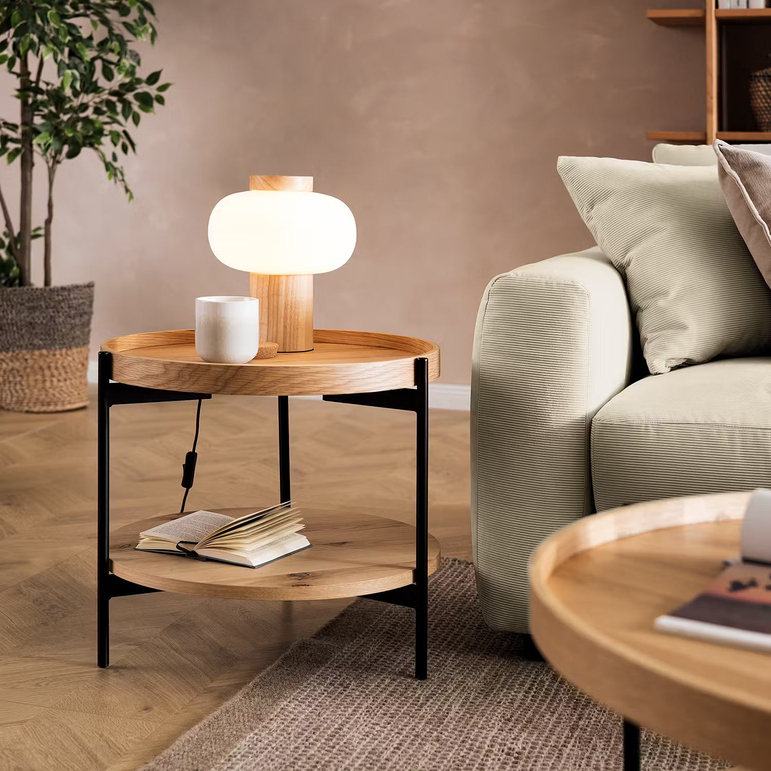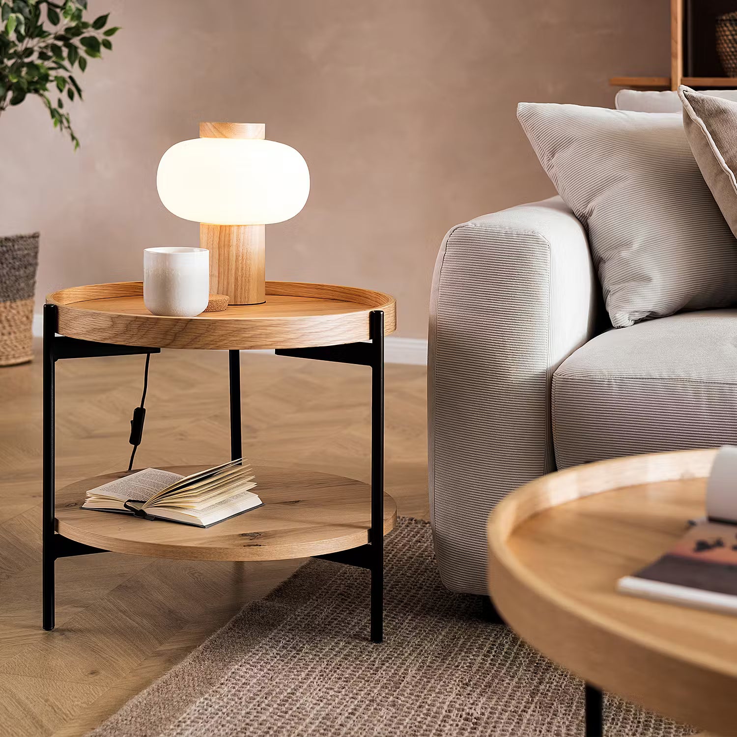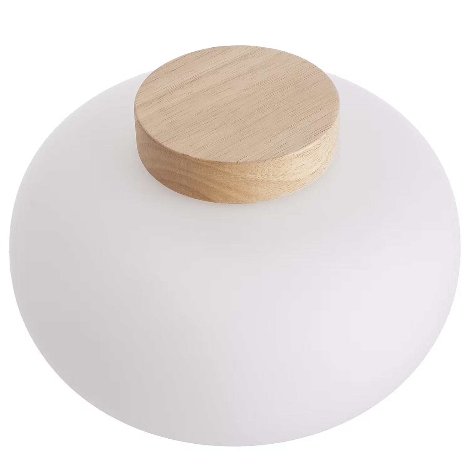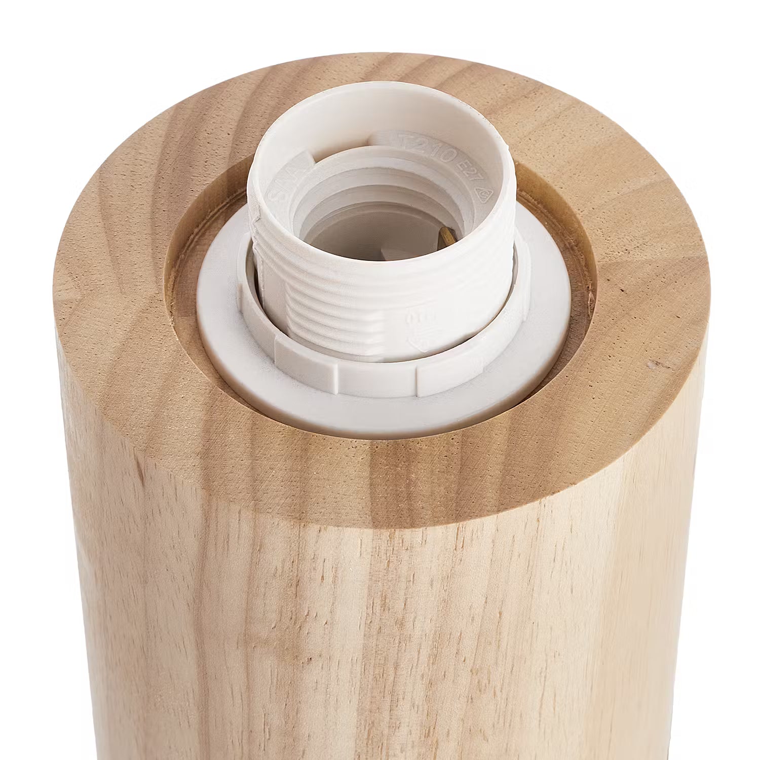Weißes Glas trifft naturfarbenes Holz bei der modernen Taavi Tischleuchte, die mit Gummibaumholz, also einem nachwachsenden Rohstoff, hergestellt ist. Damit die Schönheit von Glas und Holz wirken kann, besinnt sich das Design auf klare, reduzierte Formen. So entsteht eine Tischlampe, die sich vielseitig kombinieren und nutzen lässt, z.B. im Wohnbereich oder Schlafzimmer.