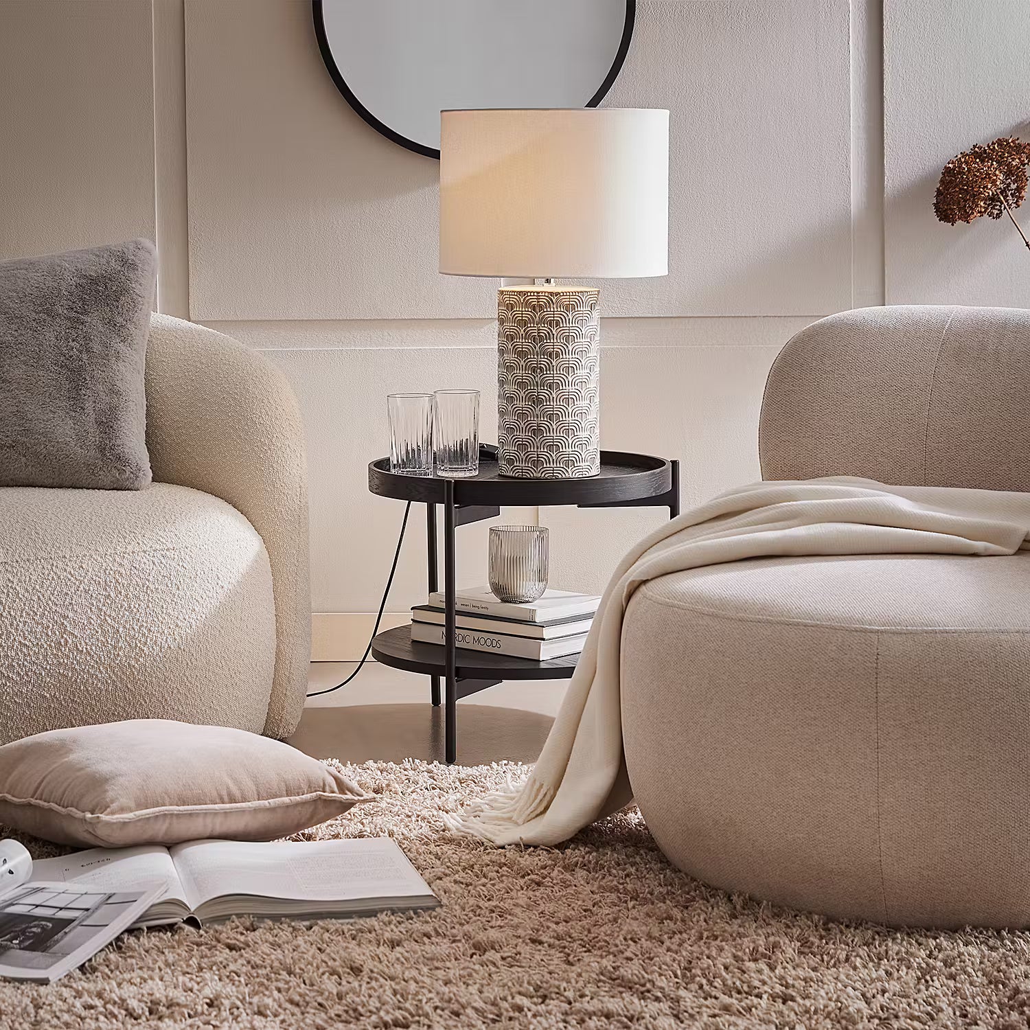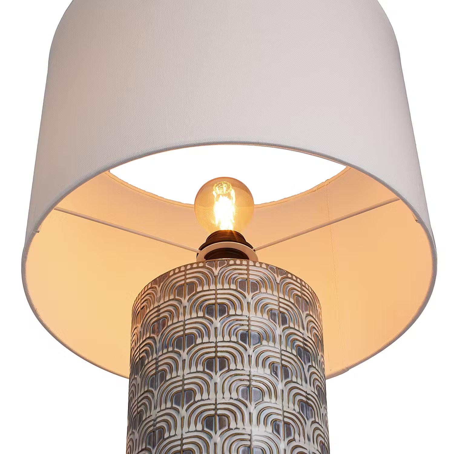Keramikkunst trifft Leinenstoff: Der modernen Yuki Tischleuchte in Hellblau und Weiß gelingt eine unaufdringlich-elegante Kombination aus Lampenfuß und Schirm. Mit ihrem harmonischen, zeitlosen Design passt diese hochwertige Tischleuchte ganz besonders zu asiatisch inspirierten und klassisch-eleganten Interieurs. Mit 180 cm langem Kabel mit Kippschalter.