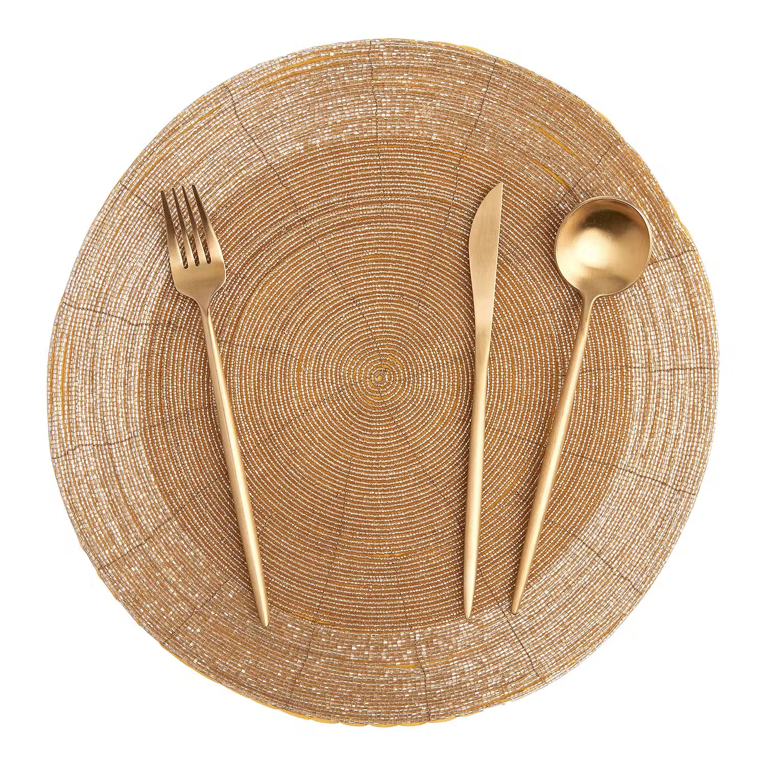Wow: Dieses Tischset ist auf der Vorderseite über und über mit hauchfeinen Glasperlenschnüren benäht. Um den schillernden und schimmernden Effekt noch zu verstärken, hebt sich am Rand eine etwa 5 cm breite Bordüre Ton in Ton ab. Tipp: Das Tischset kann als Highlight auf einer schlichten Tafel dekoriert werden, lässt sich aber auch mit anderen glänzenden oder farbenfrohen Elementen kombinieren. In verschiedenen Farben erhältlich.