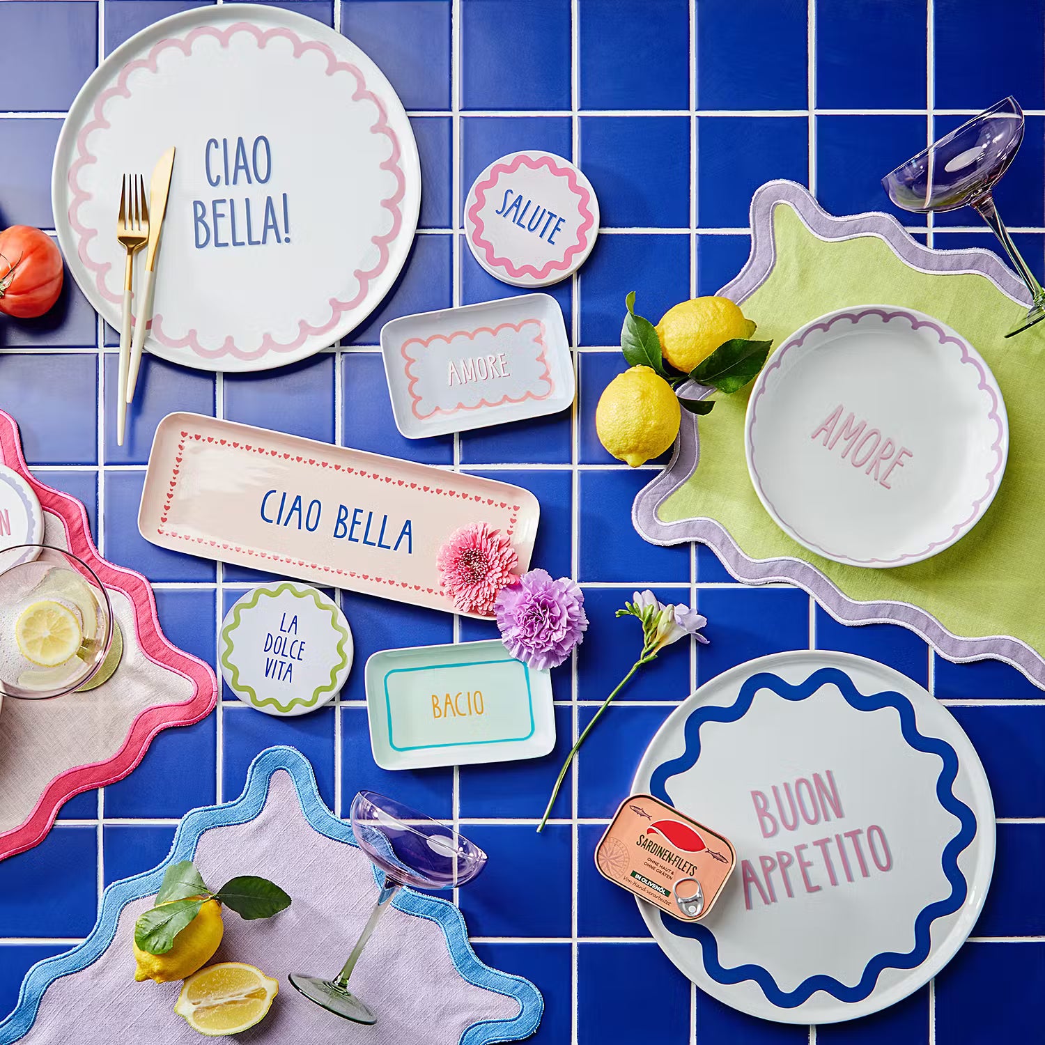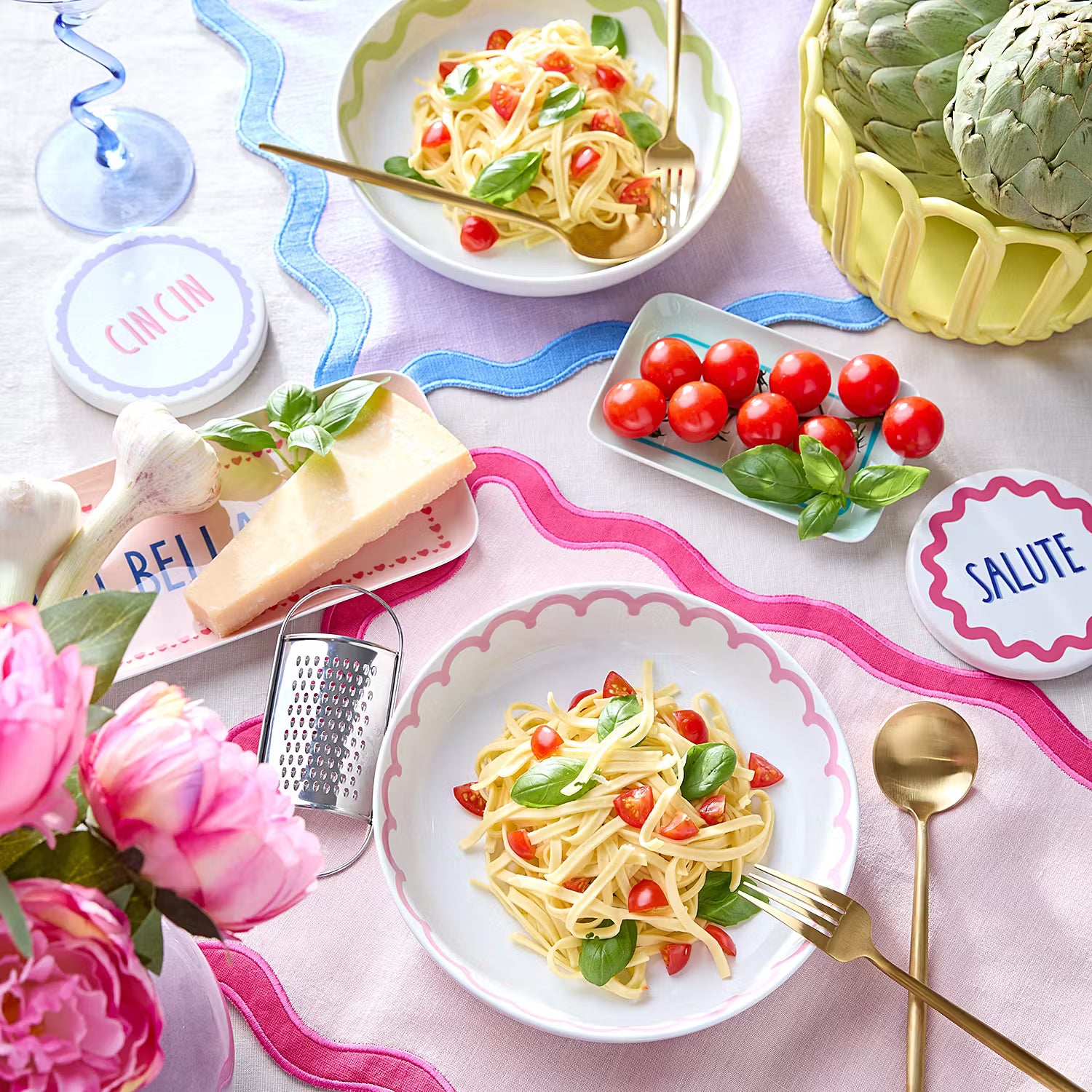 Damit sich jeder Tag ein bisschen nach Urlaub in Bella Italia anfühlt, serviert Ihnen der Vacanza Untersetzer Salute im 6er-Set sonnige Leichtigkeit und das Gefühl von Ferien. Der chice Untersetzer ist aus Porzellan gefertigt und zum Schutz empfindlicher Tischplatten mit einer Unterseite aus Kork versehen. Mit seinem farbenfrohen Design mit Schriftzug passt er wunderbar zum Aperitivo mit Freunden und zum entspannten Abendessen in fröhlicher Runde - am besten in Kombination mit den passenden Vacanza Pasta Tellern und Pizza Tellern.