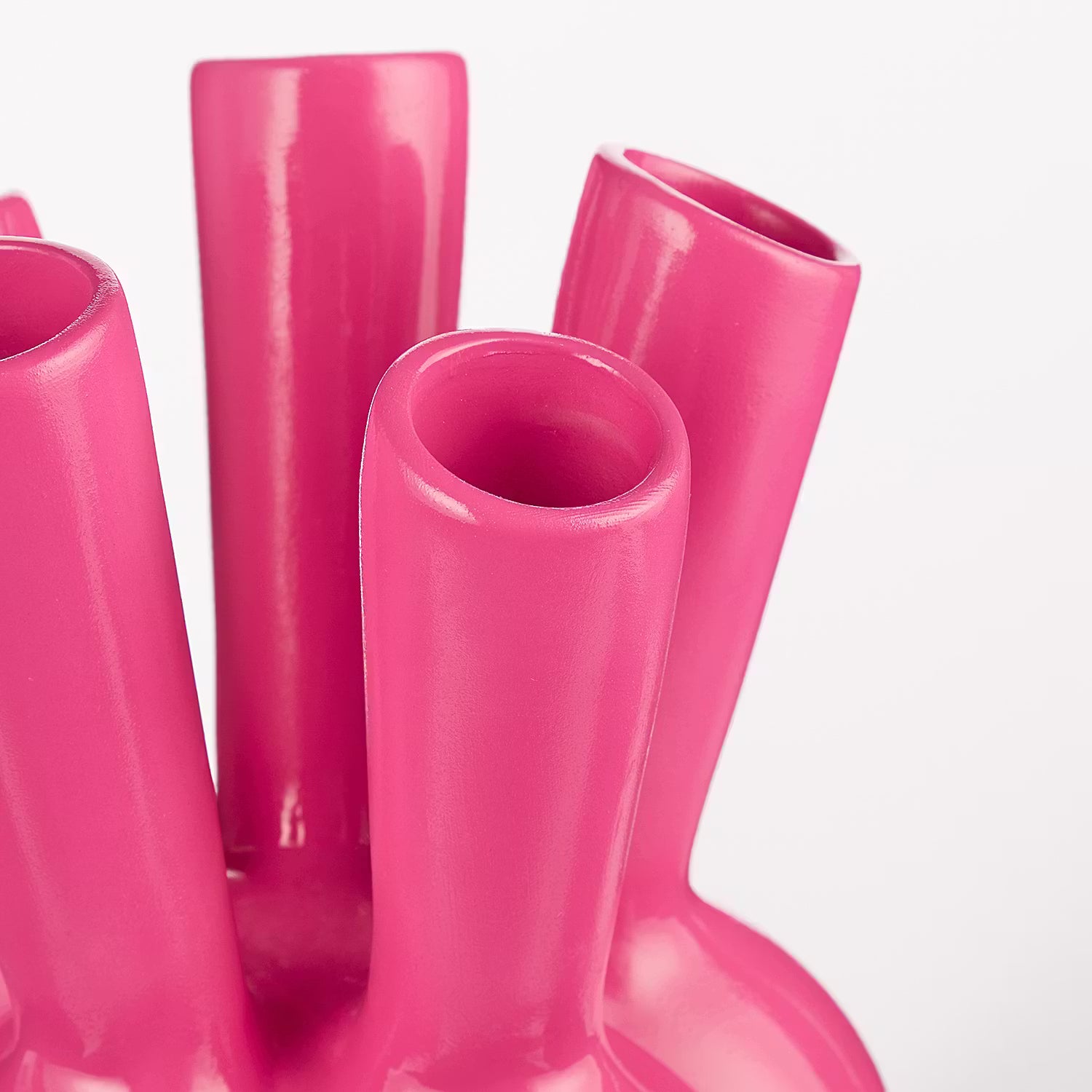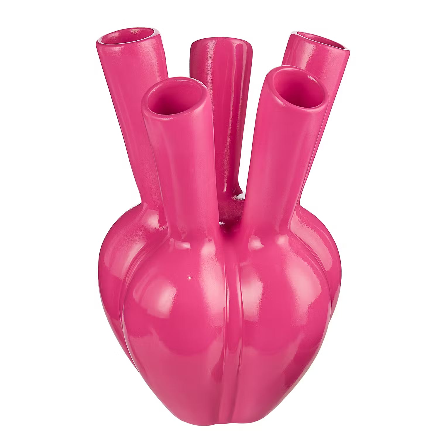 Mehrere Öffnungen für das kinderleichte Arrangieren von Blumen und Zweigen bietet die hübsche Arrangement Keramik Vase aus Steingut in Pink. So schaffst du mit nur wenig Pflanzenmaterial im Handumdrehen immer wieder neue Tischdekorationen oder Hingucker für dein Zuhause.