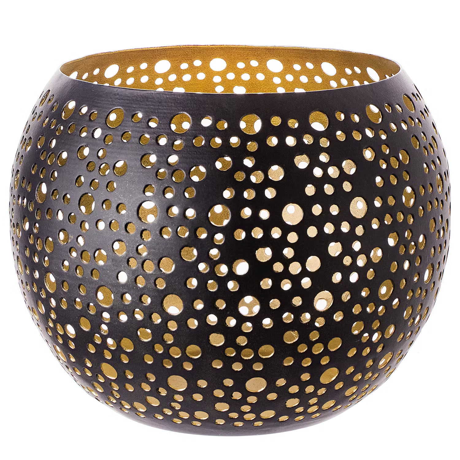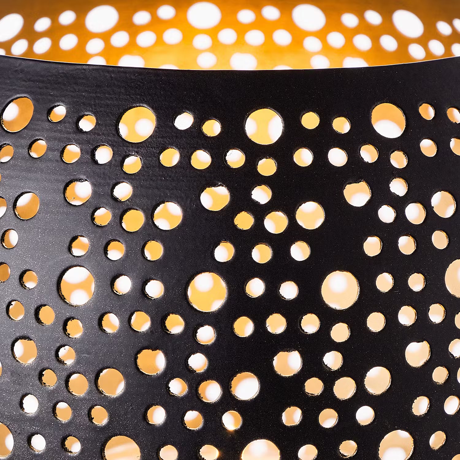 Ein Lichtblick aus Eisen ist dieses Luminous Windlicht mit Lochstanzung in Schwarz-Gold. Form und Farbe verbreiten Gemütlichkeit in Ihrem Zuhause und machen Ihnen die länger werdenden Abende auf dem Sofa, vor dem Kamin oder mit Freunden am gedeckten Tisch so richtig heimelig.